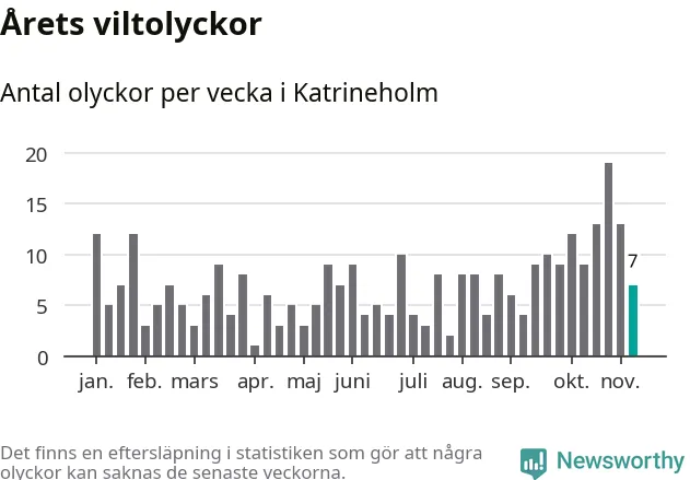 Totalt det här året har det inträffat 318 viltolyckor i kommunen. Det är mindre än genomsnittet för motsvarande period (omkring 369) de senaste tio åren.