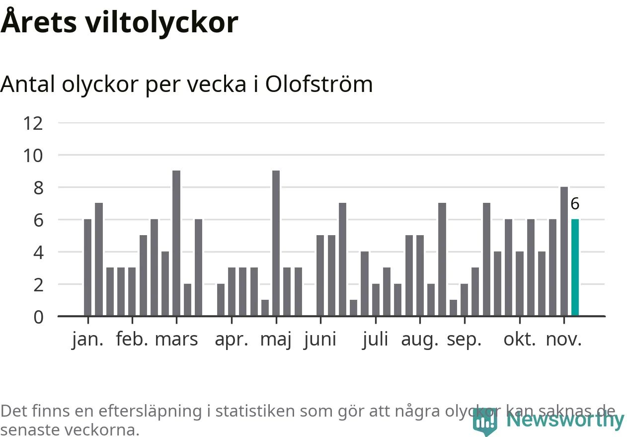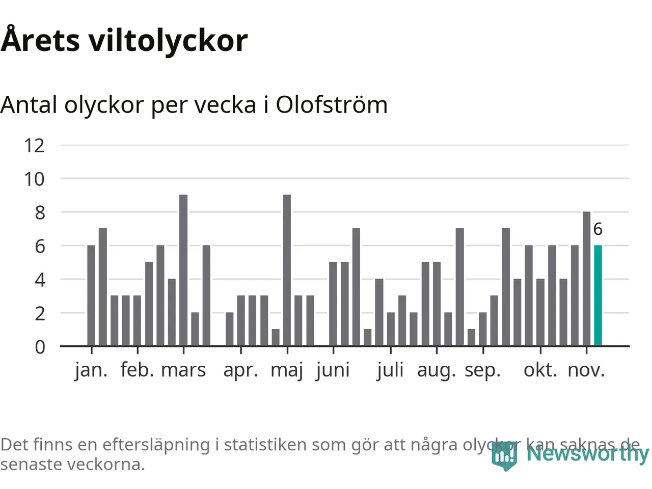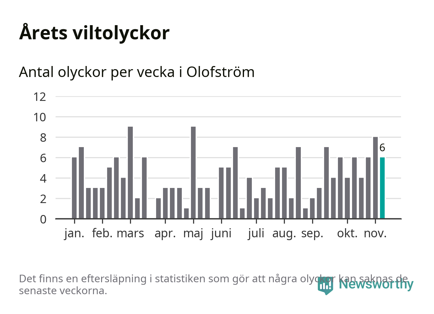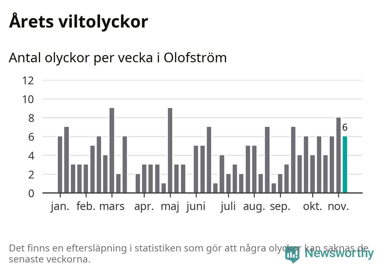 Hittills har sex viltolyckor rapporterats in i Olofströms kommun från vecka 46. Se listan här.