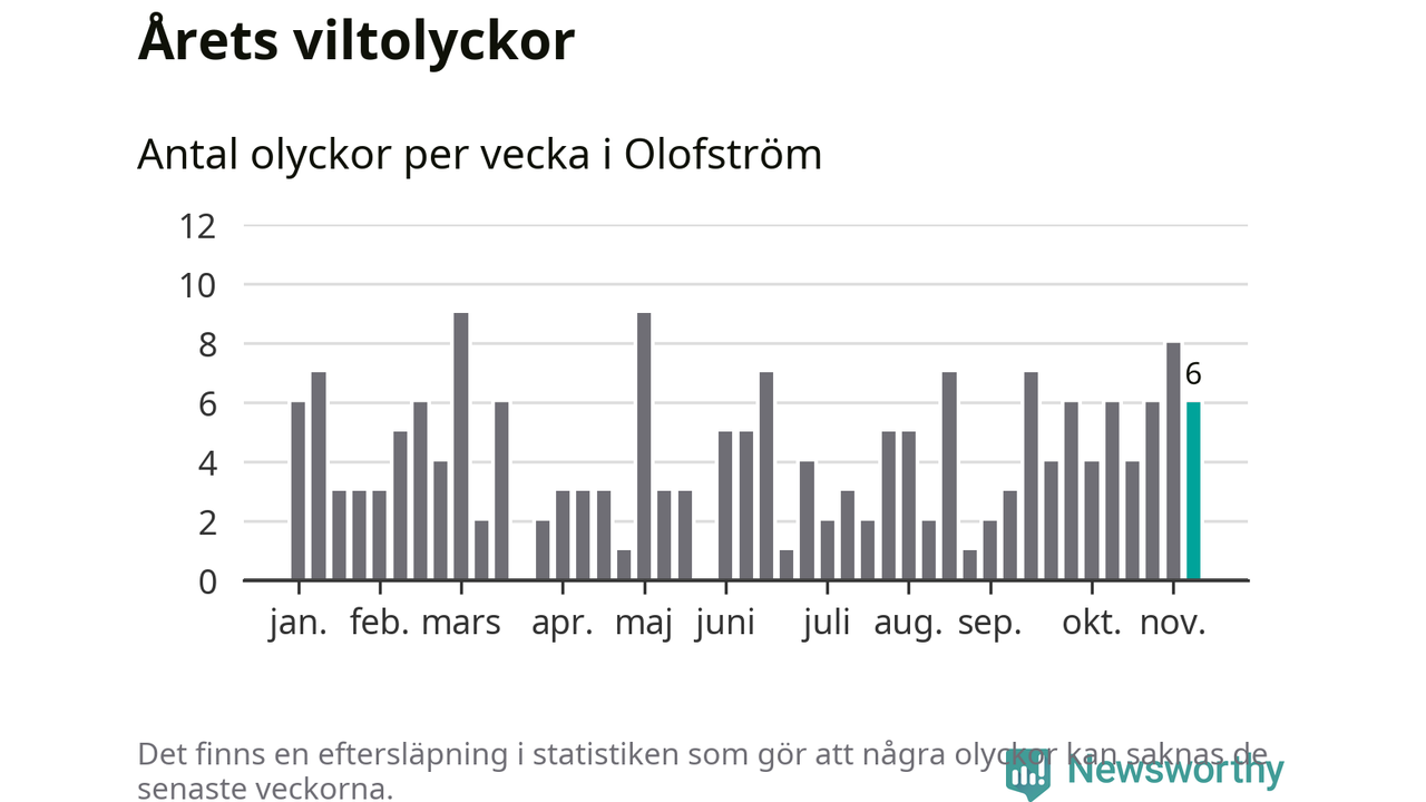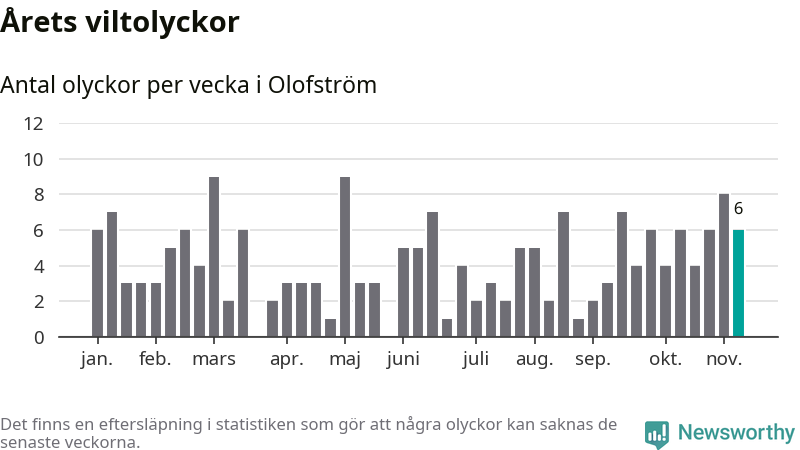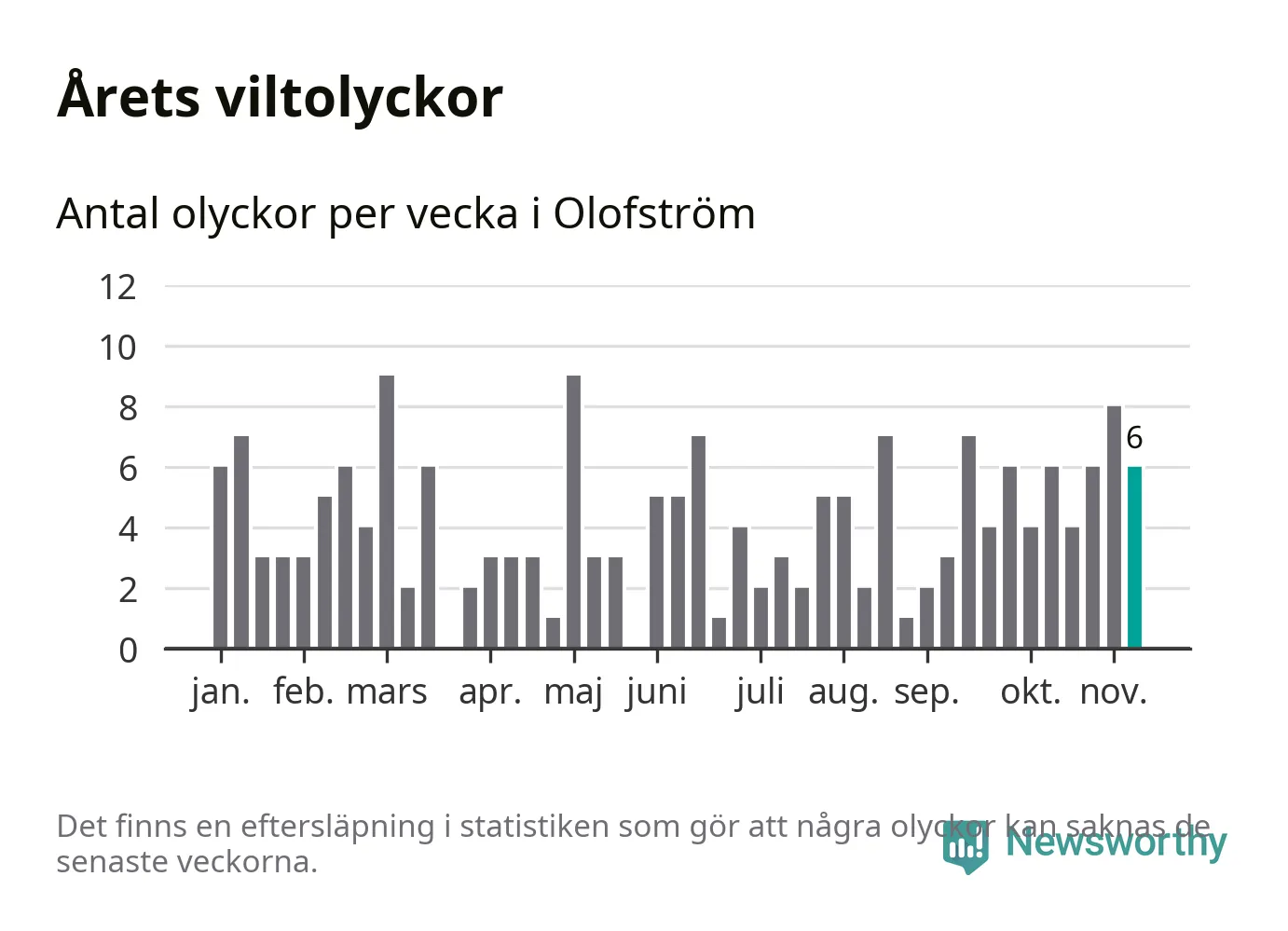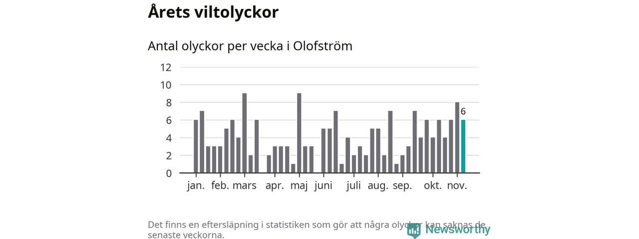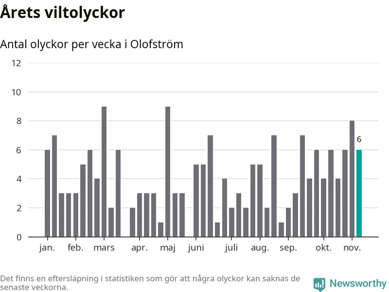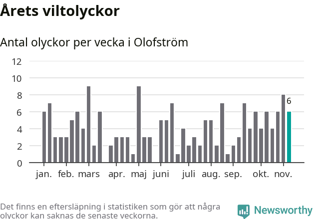Hittills har sex viltolyckor rapporterats in i Olofströms kommun från vecka 46. Se listan här.