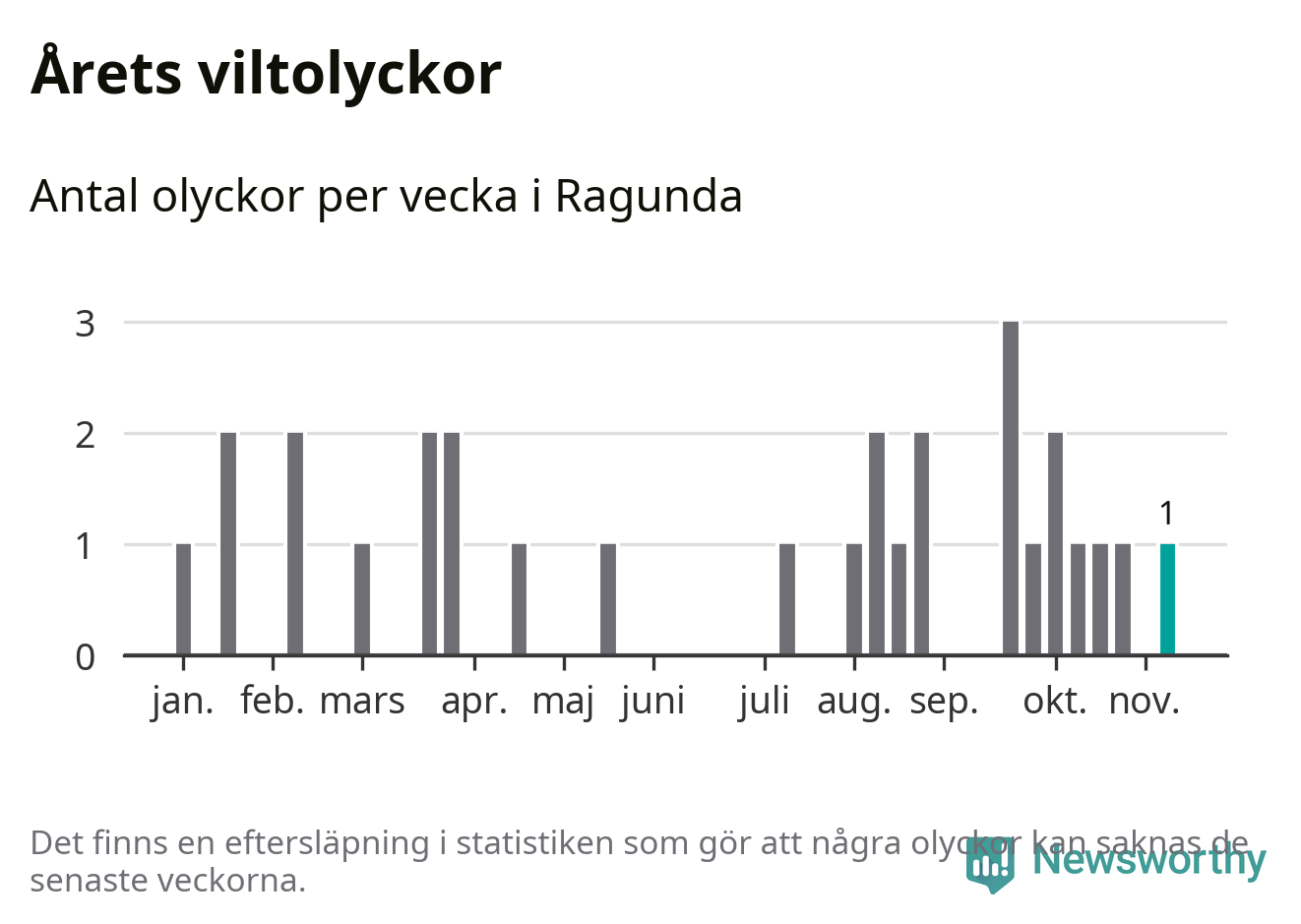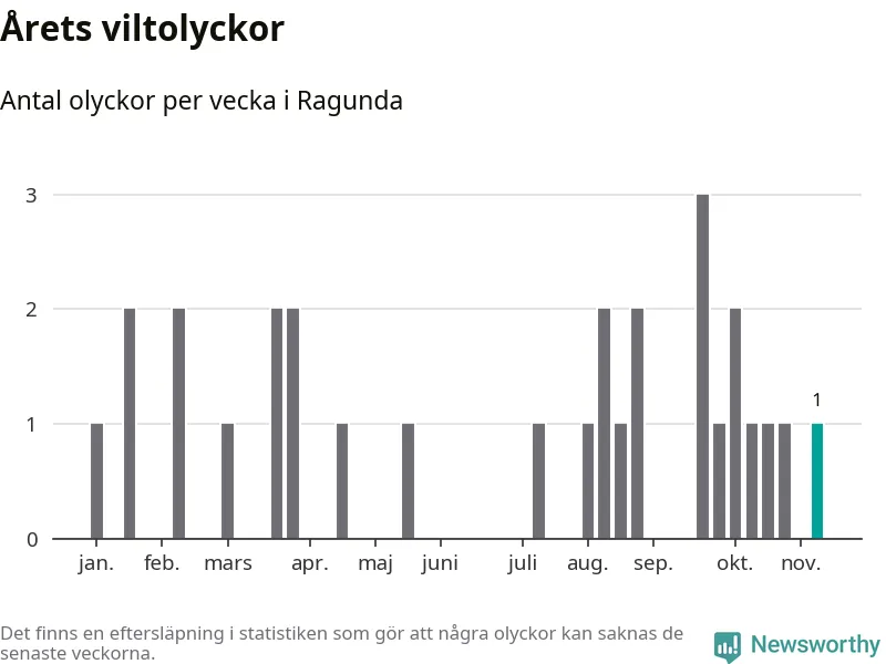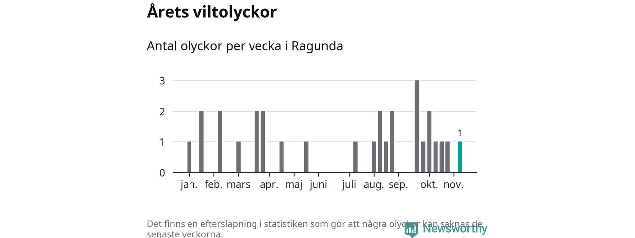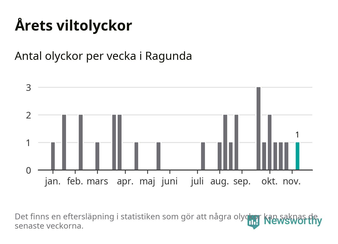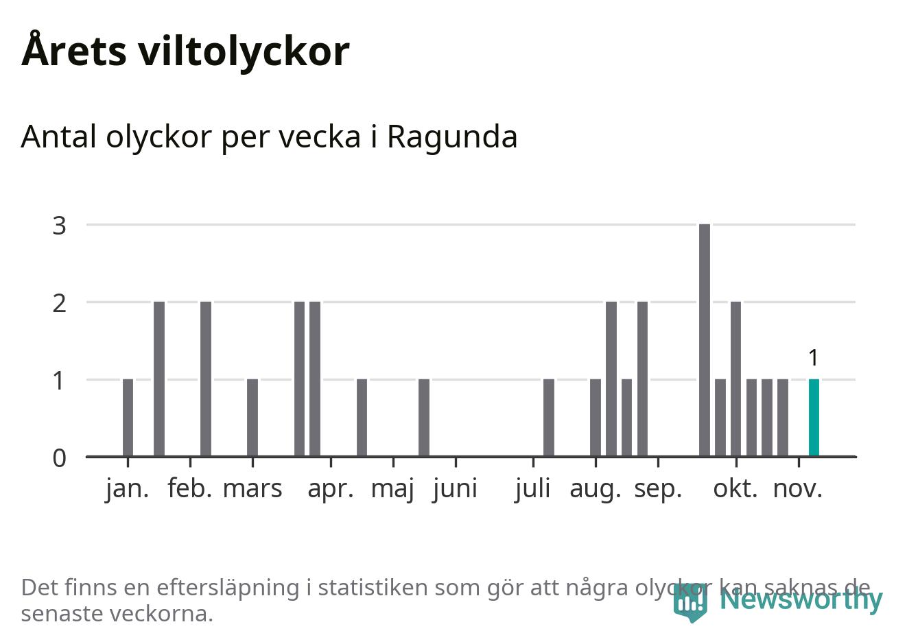 Från förra veckan (vecka 46) har hittills en viltolycka rapporterats in i Ragunda kommun.