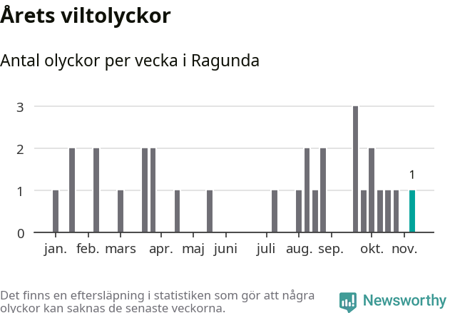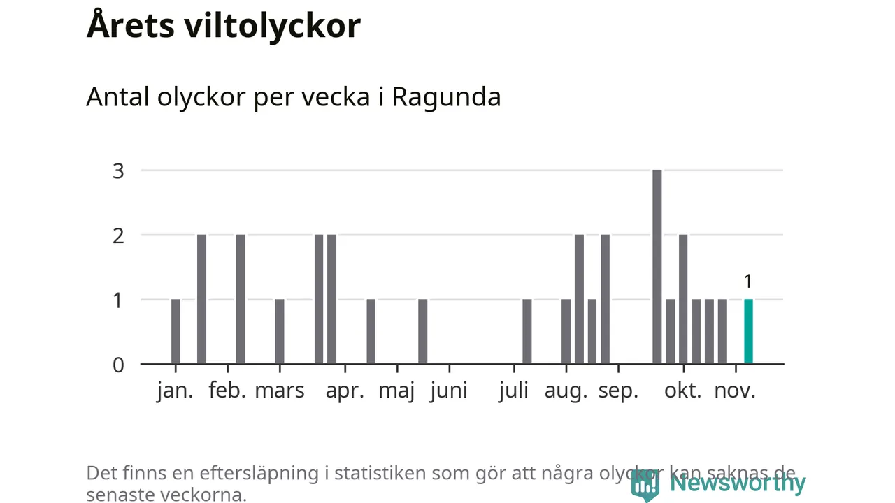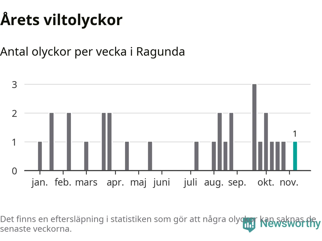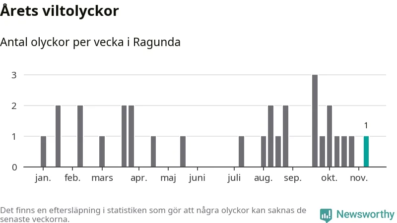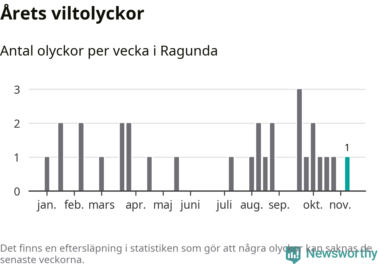 Från förra veckan (vecka 46) har hittills en viltolycka rapporterats in i Ragunda kommun.
