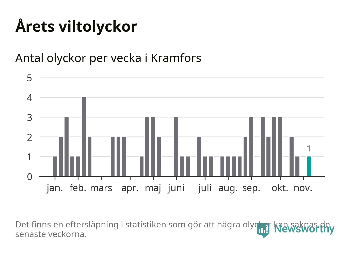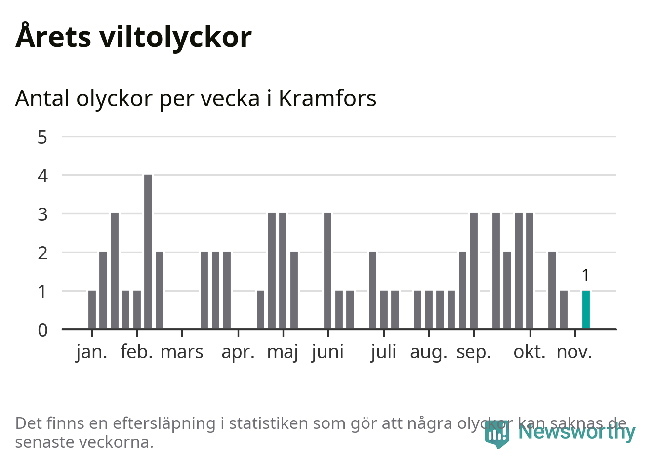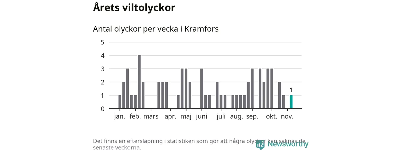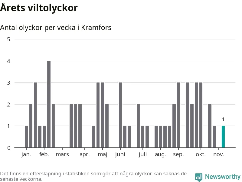 Från förra veckan (vecka 46) har hittills en viltolycka rapporterats in i Kramfors kommun.