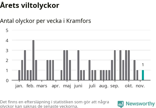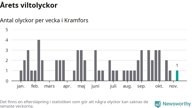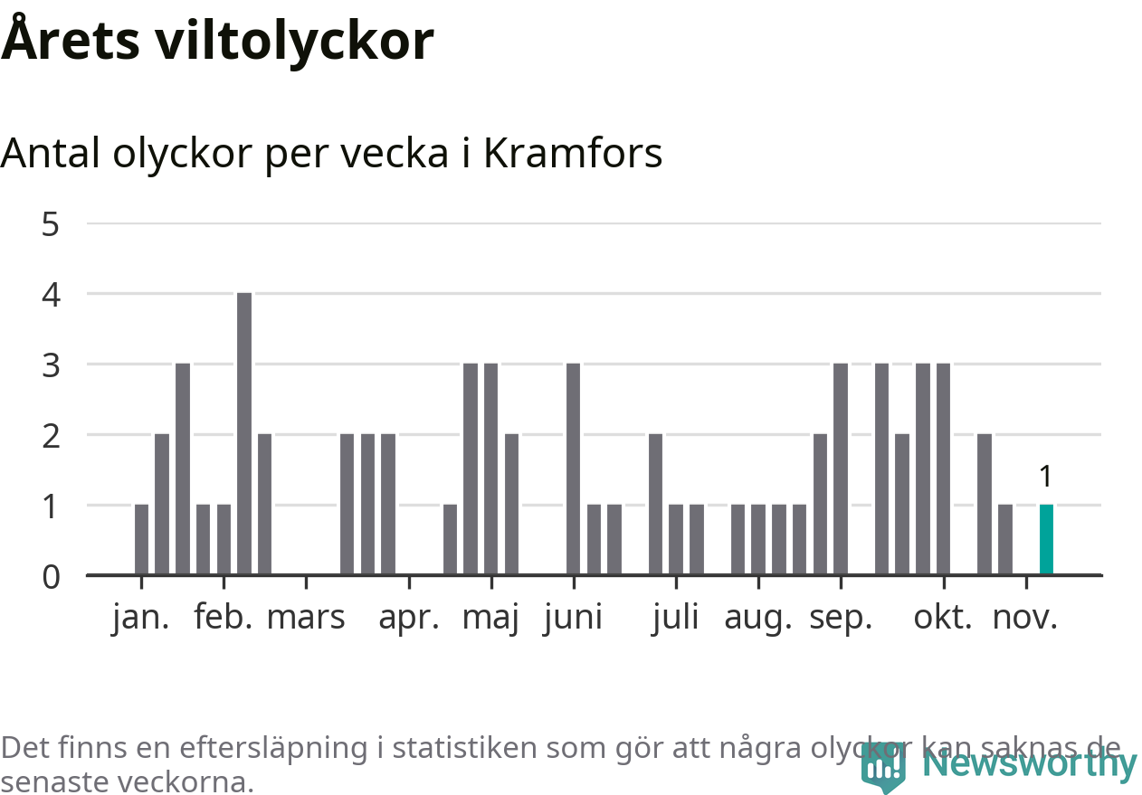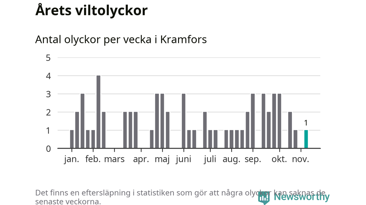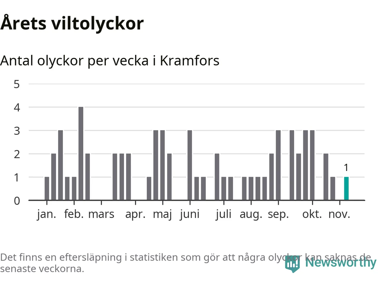 Från förra veckan (vecka 46) har hittills en viltolycka rapporterats in i Kramfors kommun.