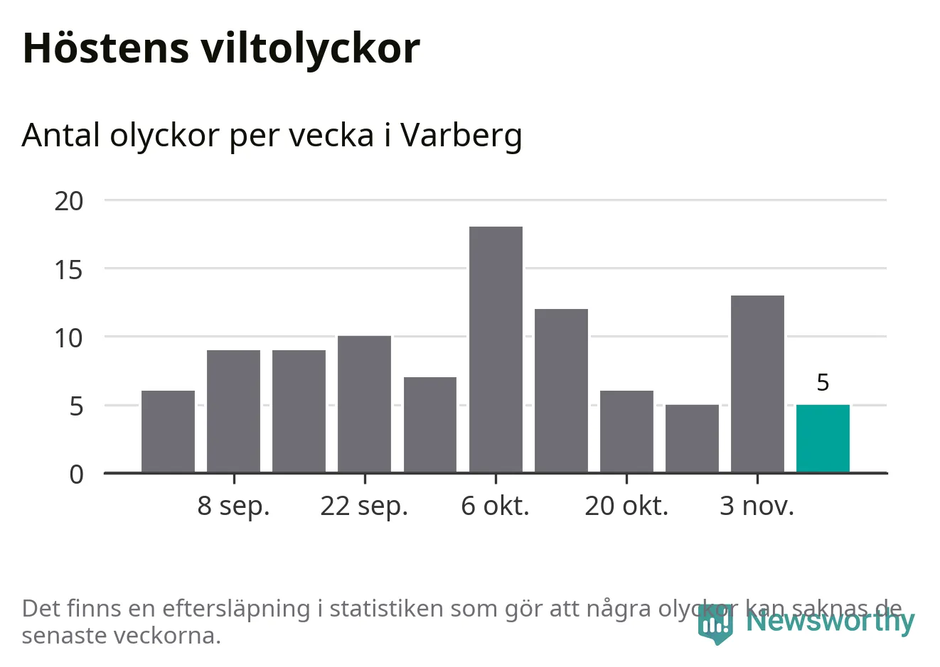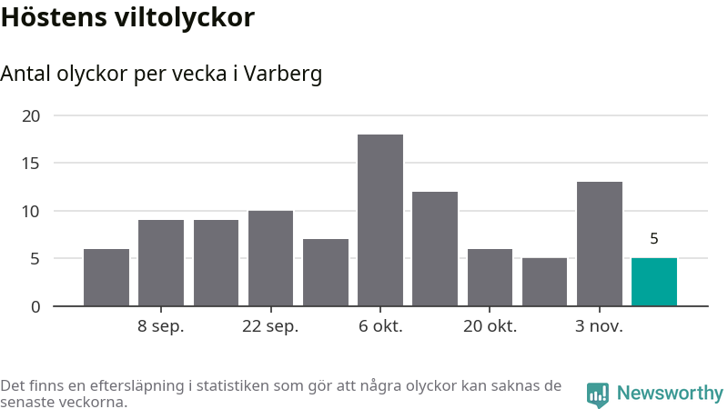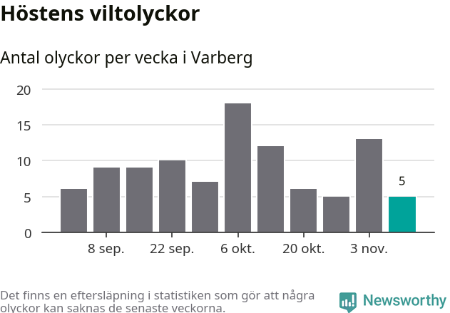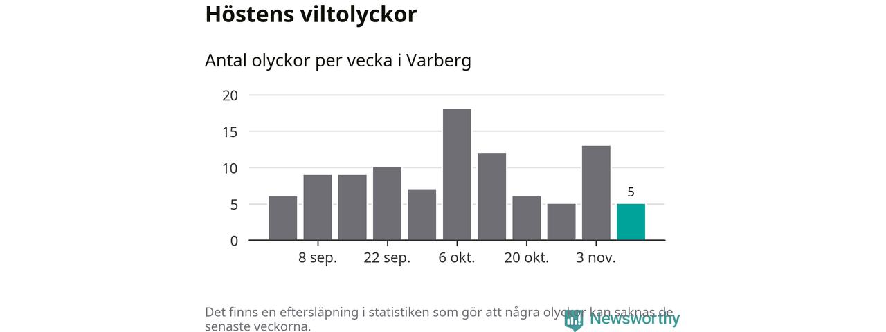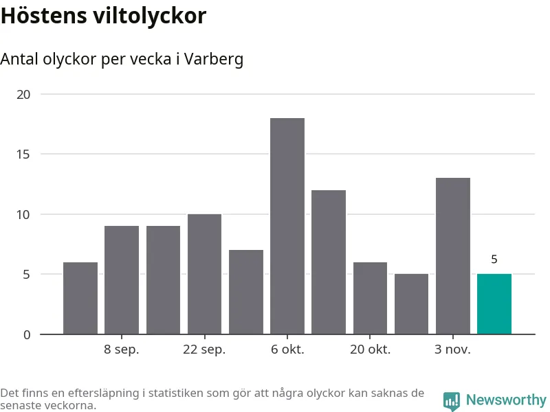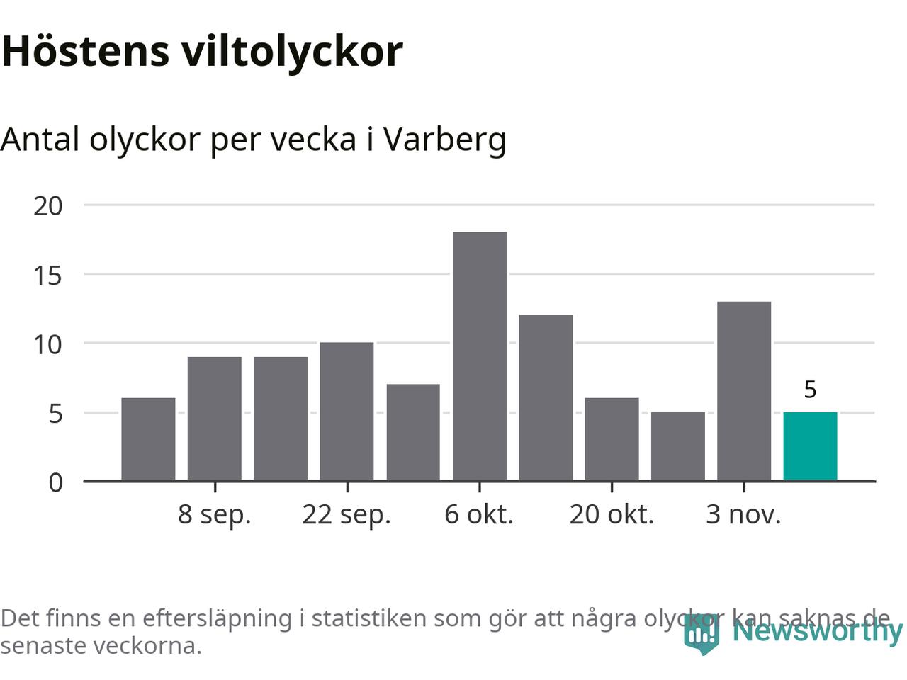 Under vecka 46 rapporterades fem viltolyckor in i Varbergs kommun. Därmed har det inträffat fler viltolyckor hittills den här hösten, än det brukar göra en hel genomsnittlig höst.