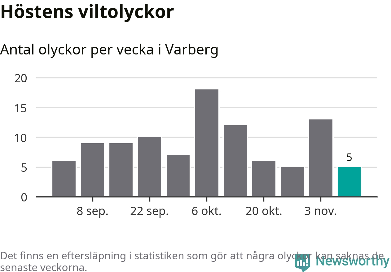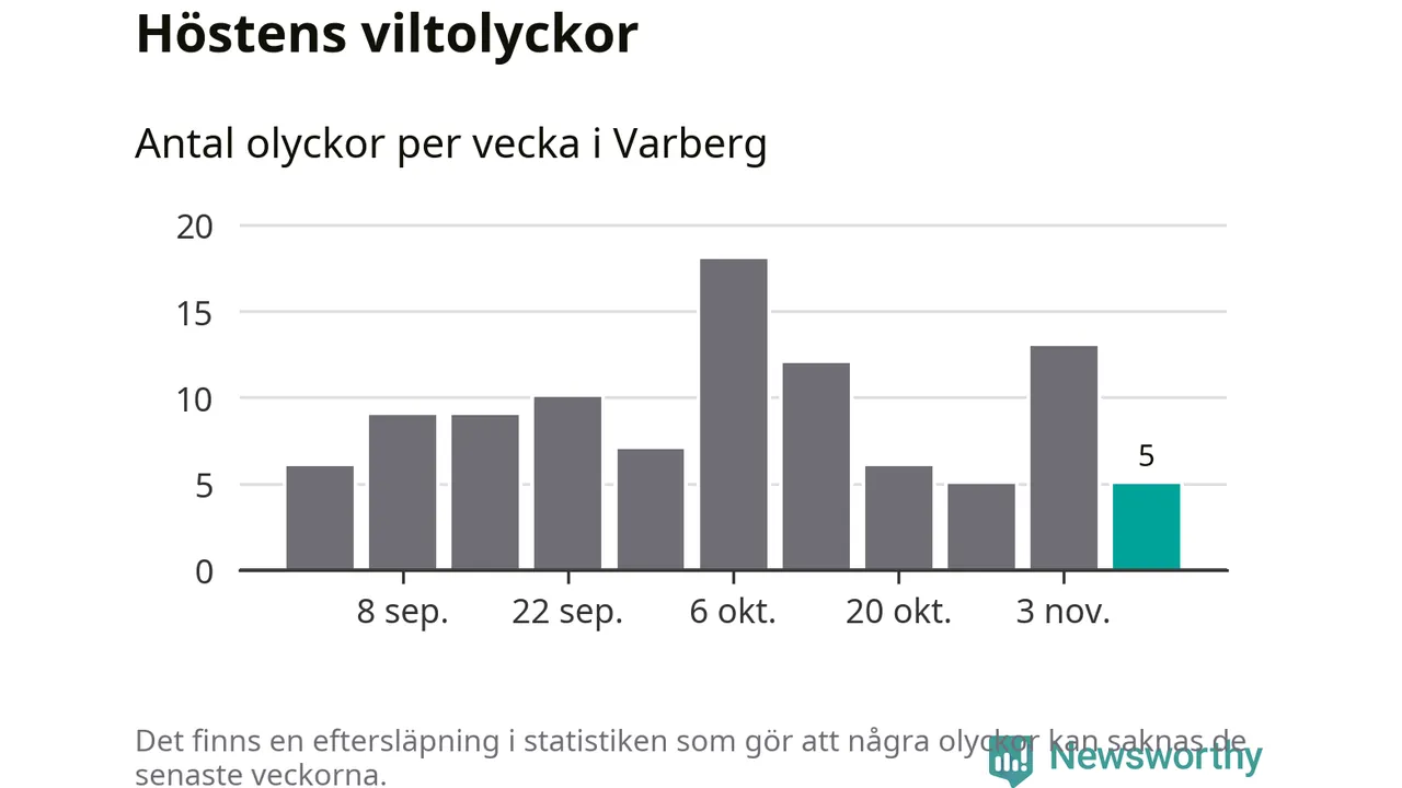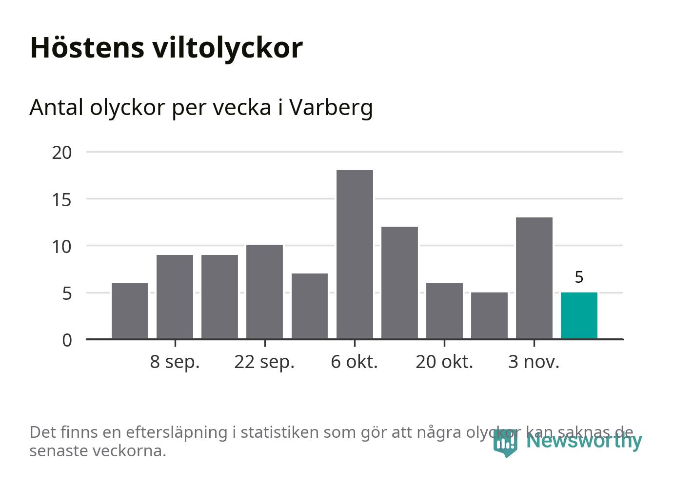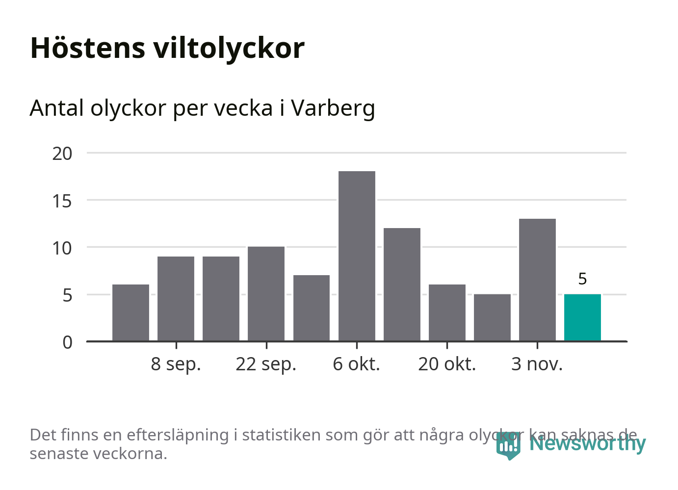 Under vecka 46 rapporterades fem viltolyckor in i Varbergs kommun. Därmed har det inträffat fler viltolyckor hittills den här hösten, än det brukar göra en hel genomsnittlig höst.