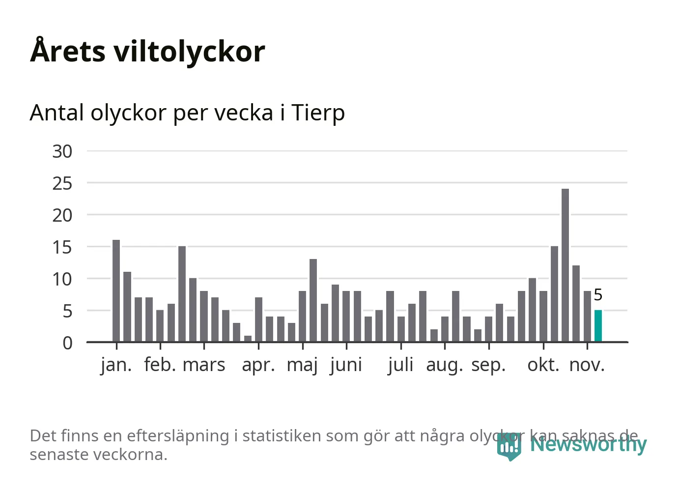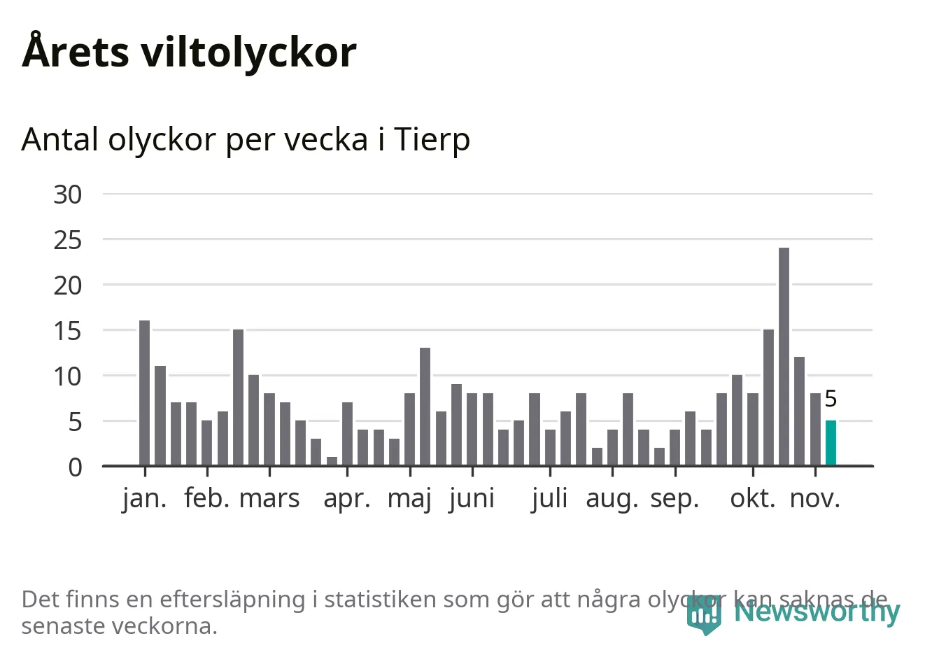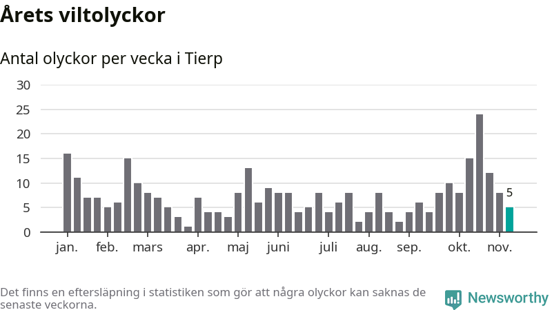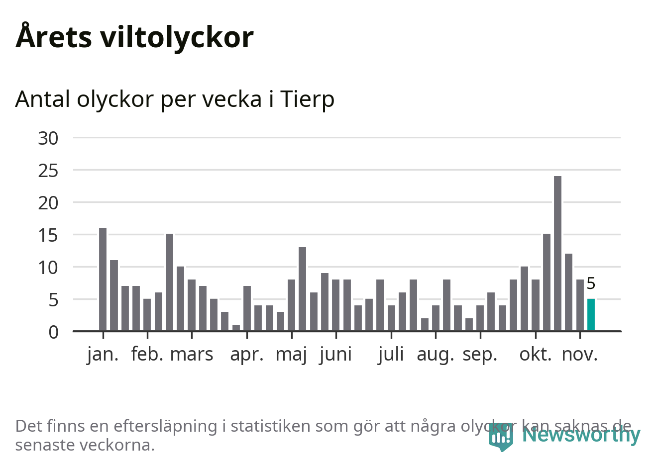 Hittills har fem viltolyckor rapporterats in i Tierps kommun från vecka 46. Se listan här.