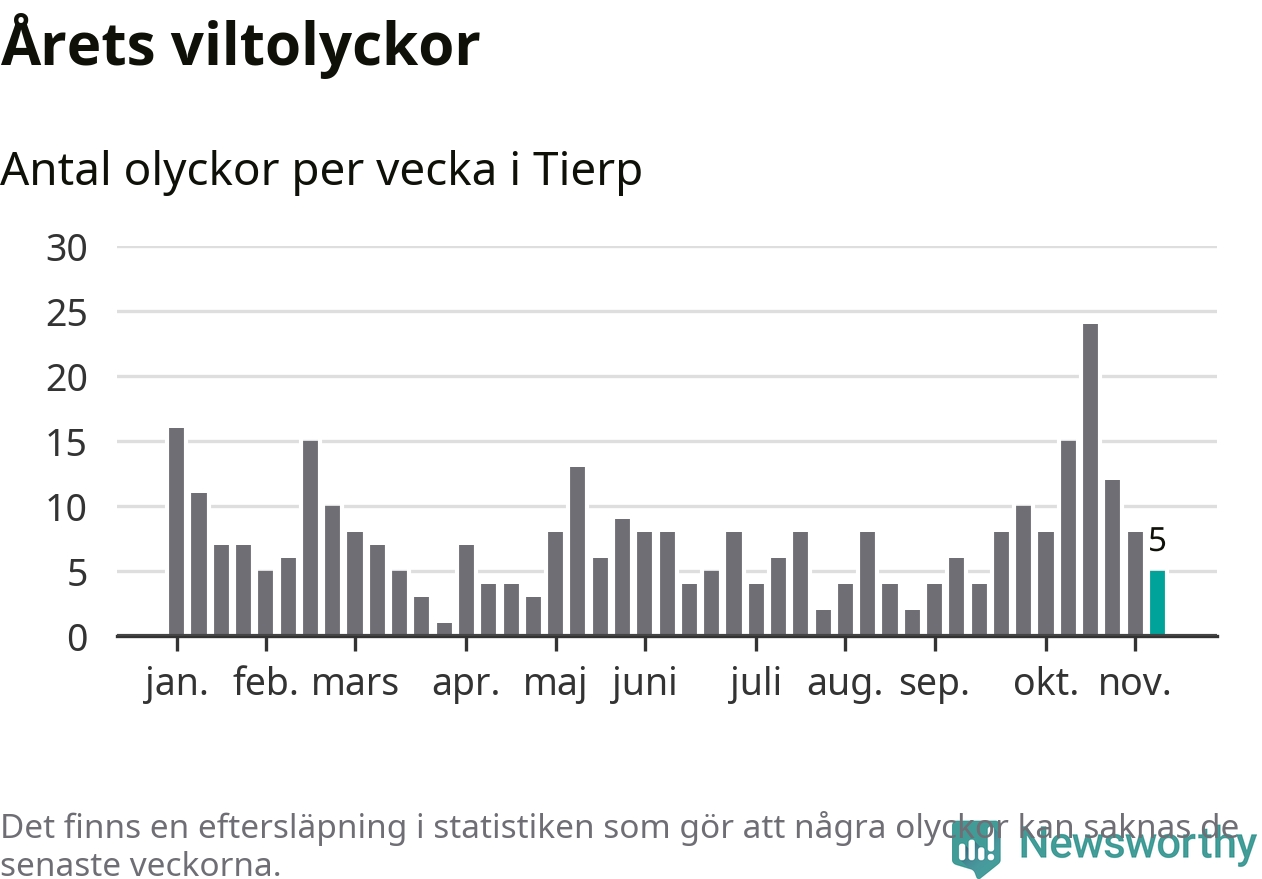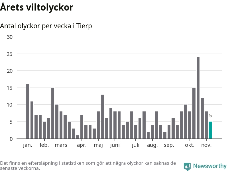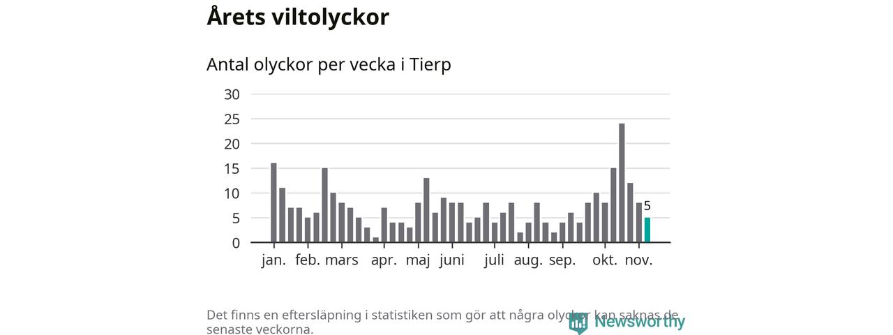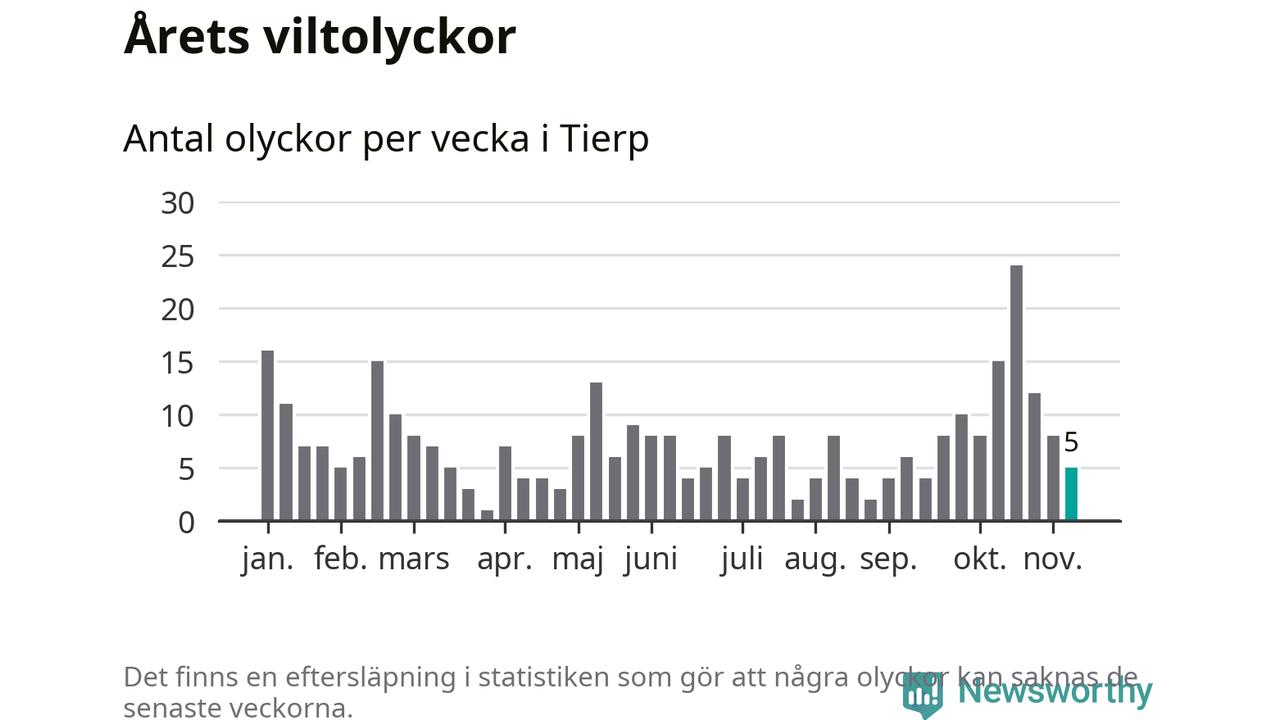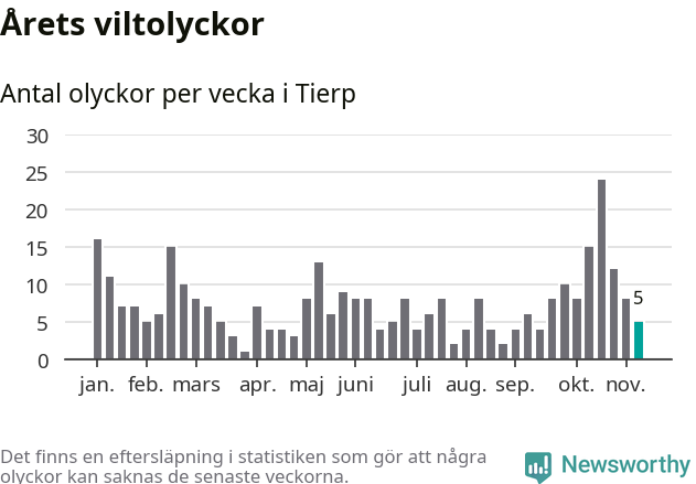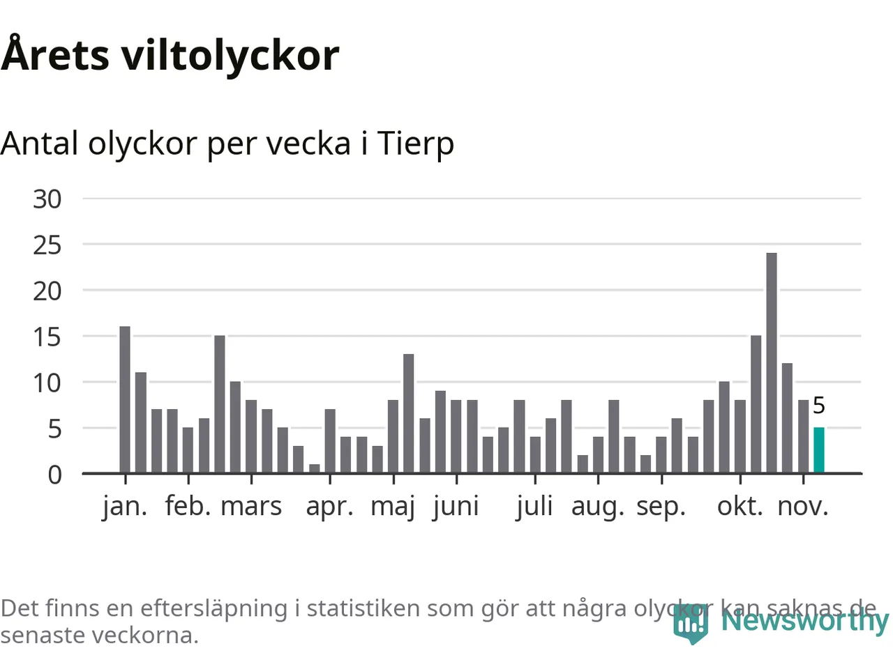 Hittills har fem viltolyckor rapporterats in i Tierps kommun från vecka 46. Se listan här.