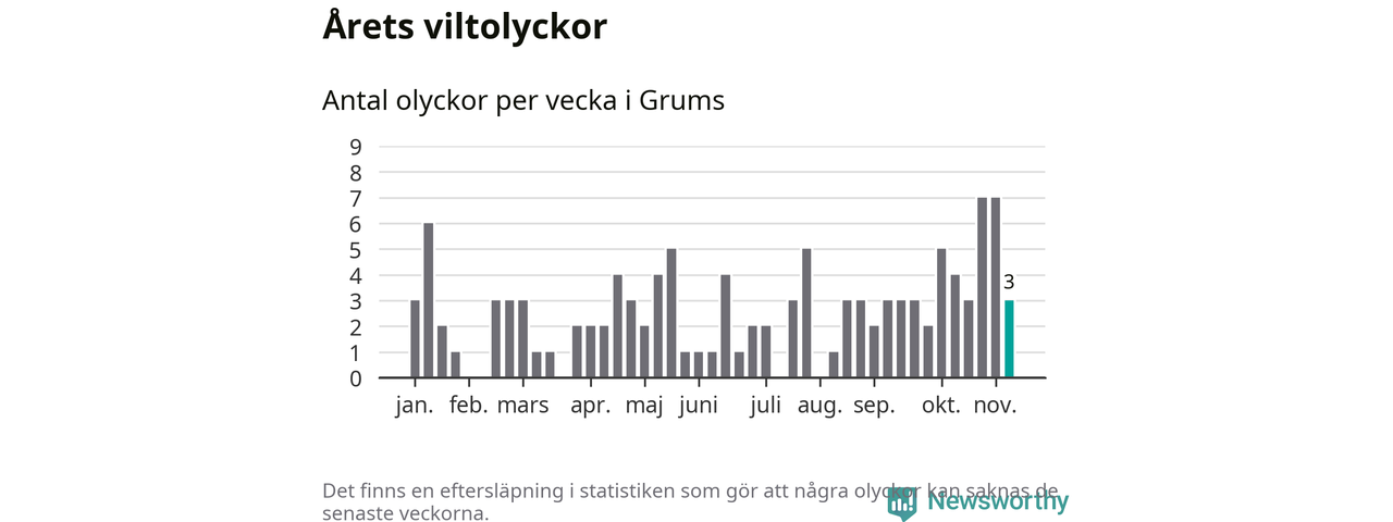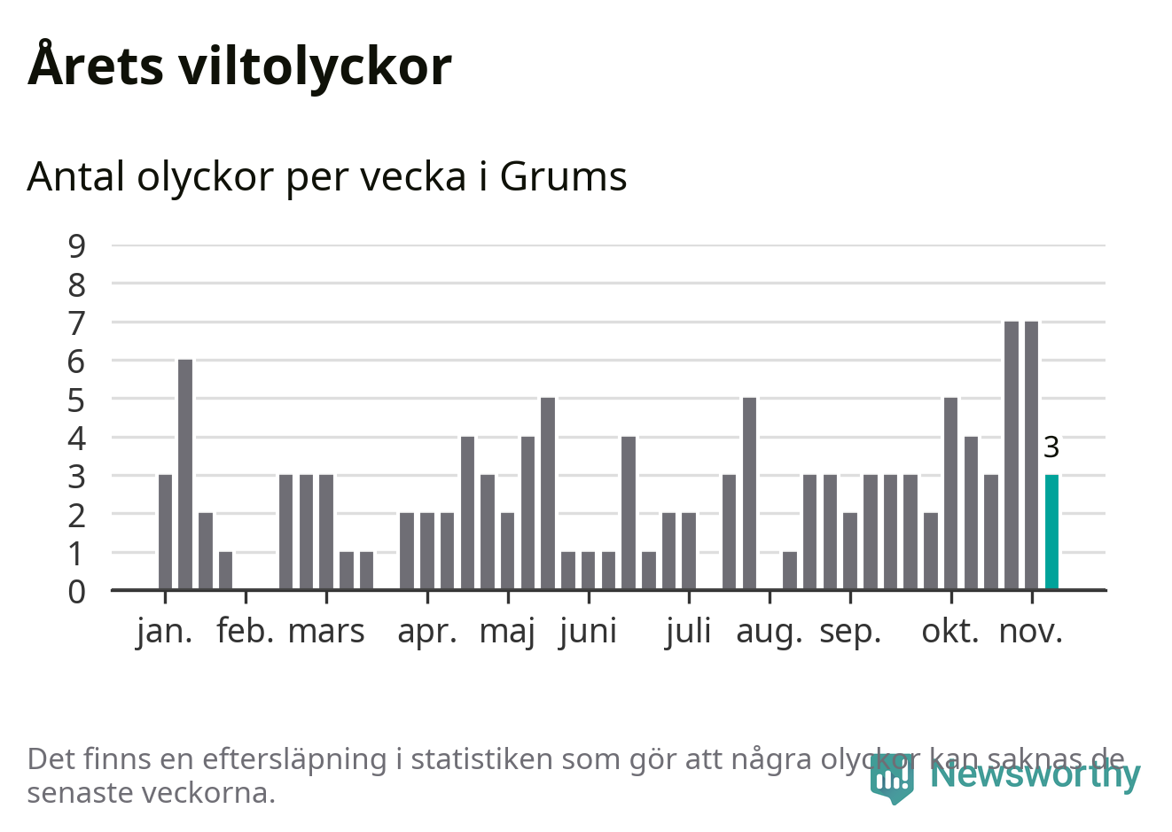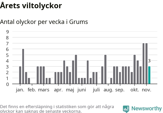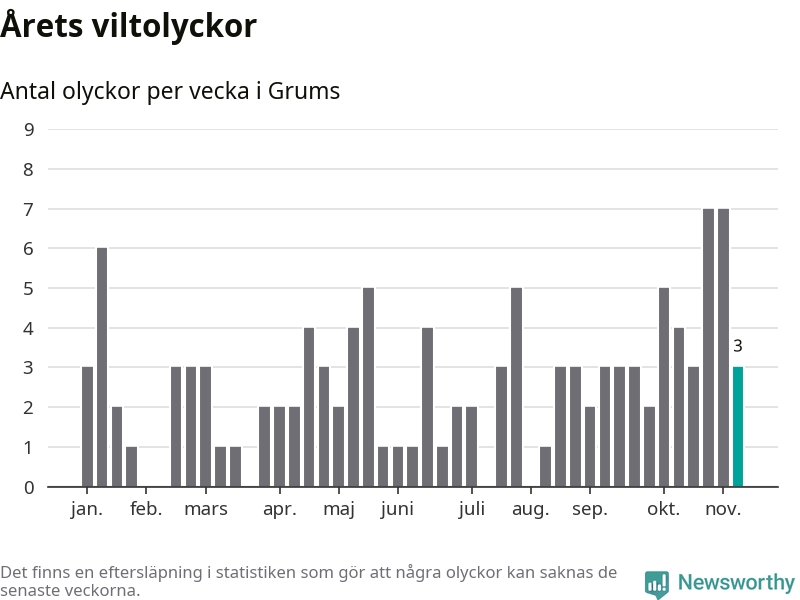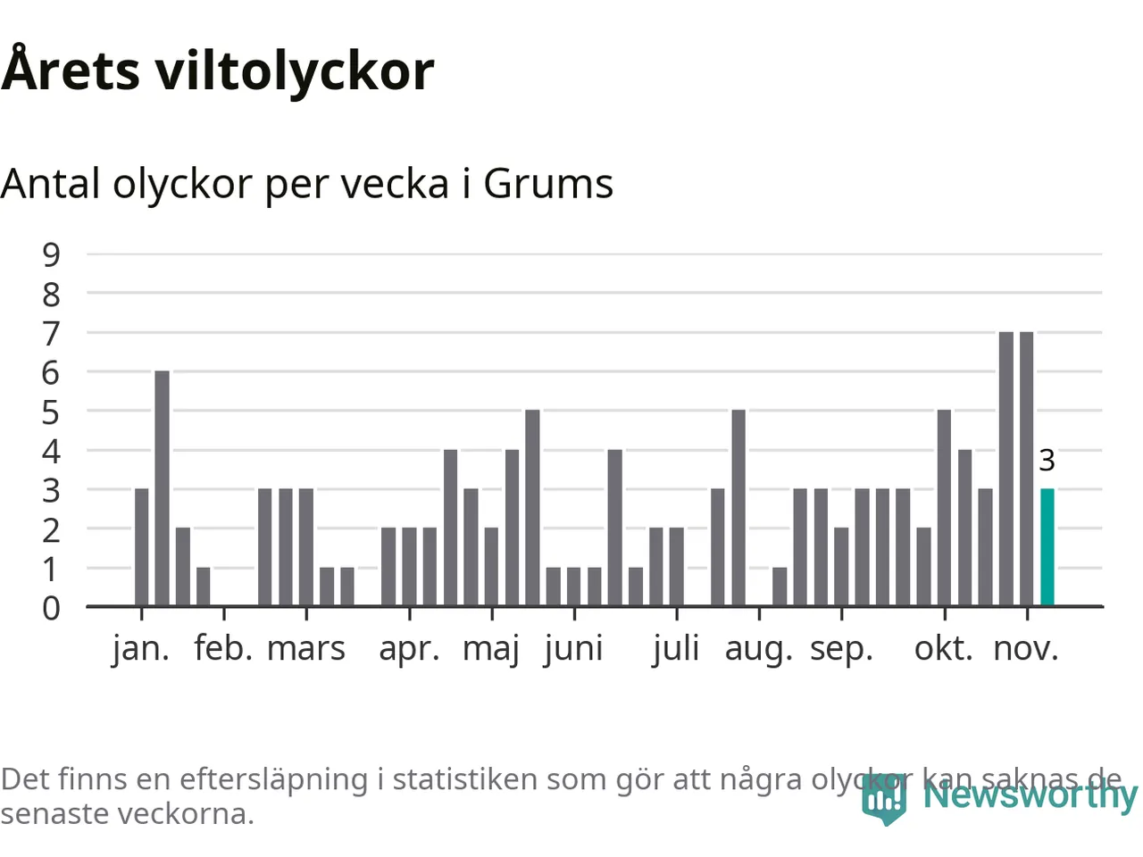 Hittills har tre viltolyckor rapporterats in i Grums kommun från vecka 46. Se listan här.