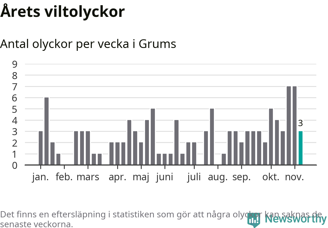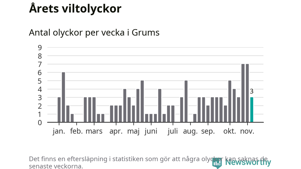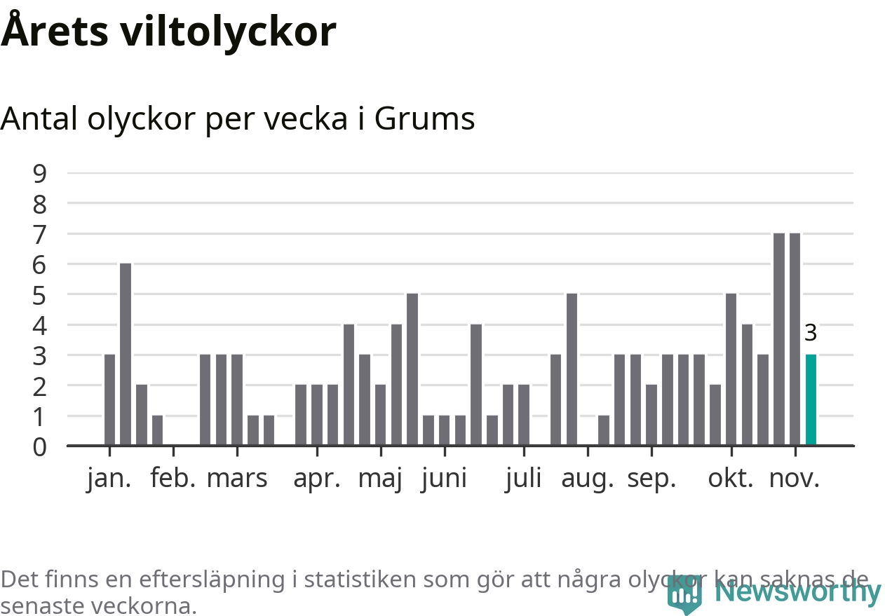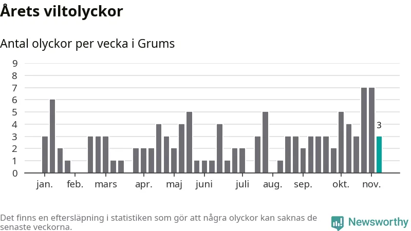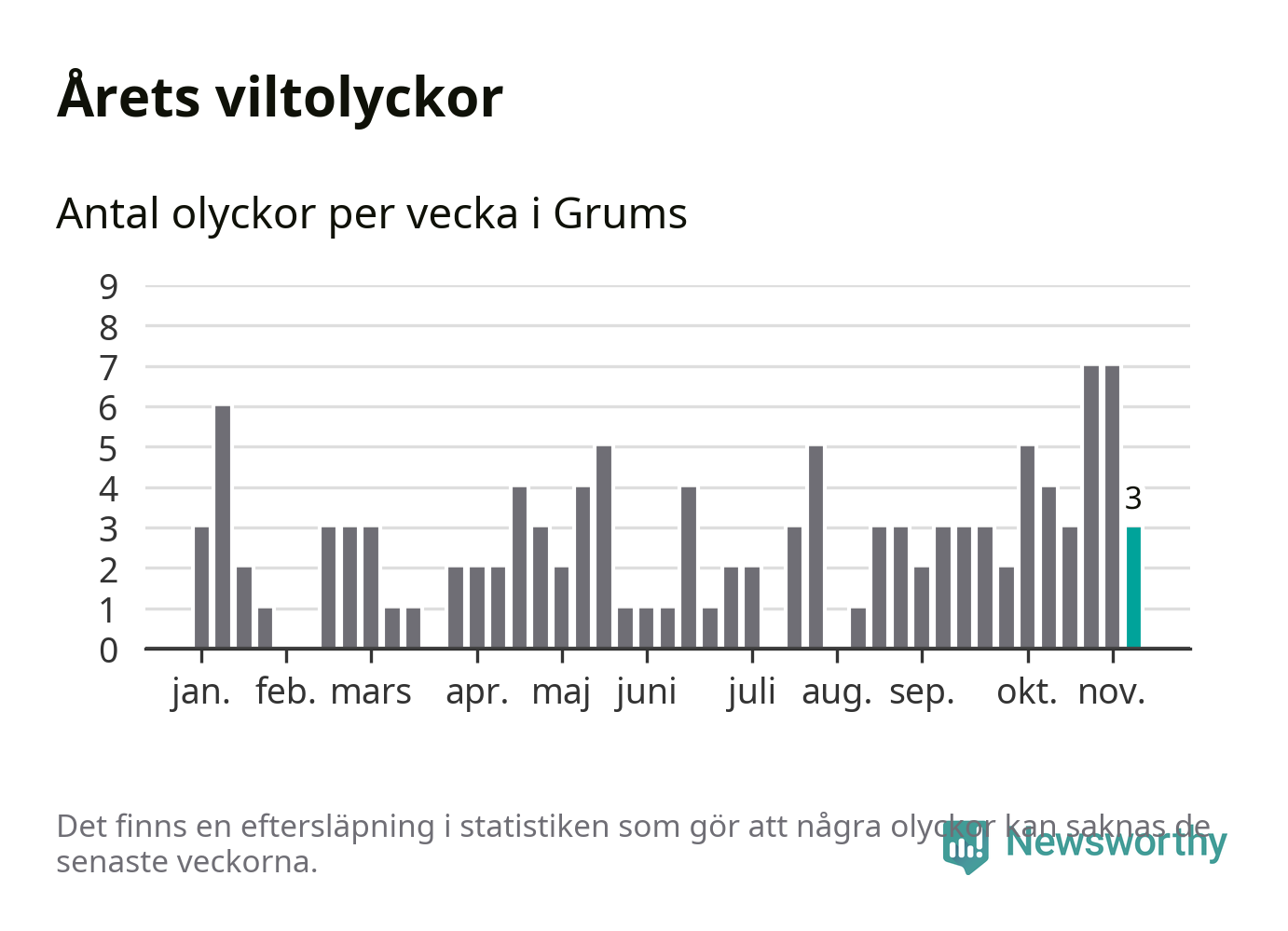 Hittills har tre viltolyckor rapporterats in i Grums kommun från vecka 46. Se listan här.