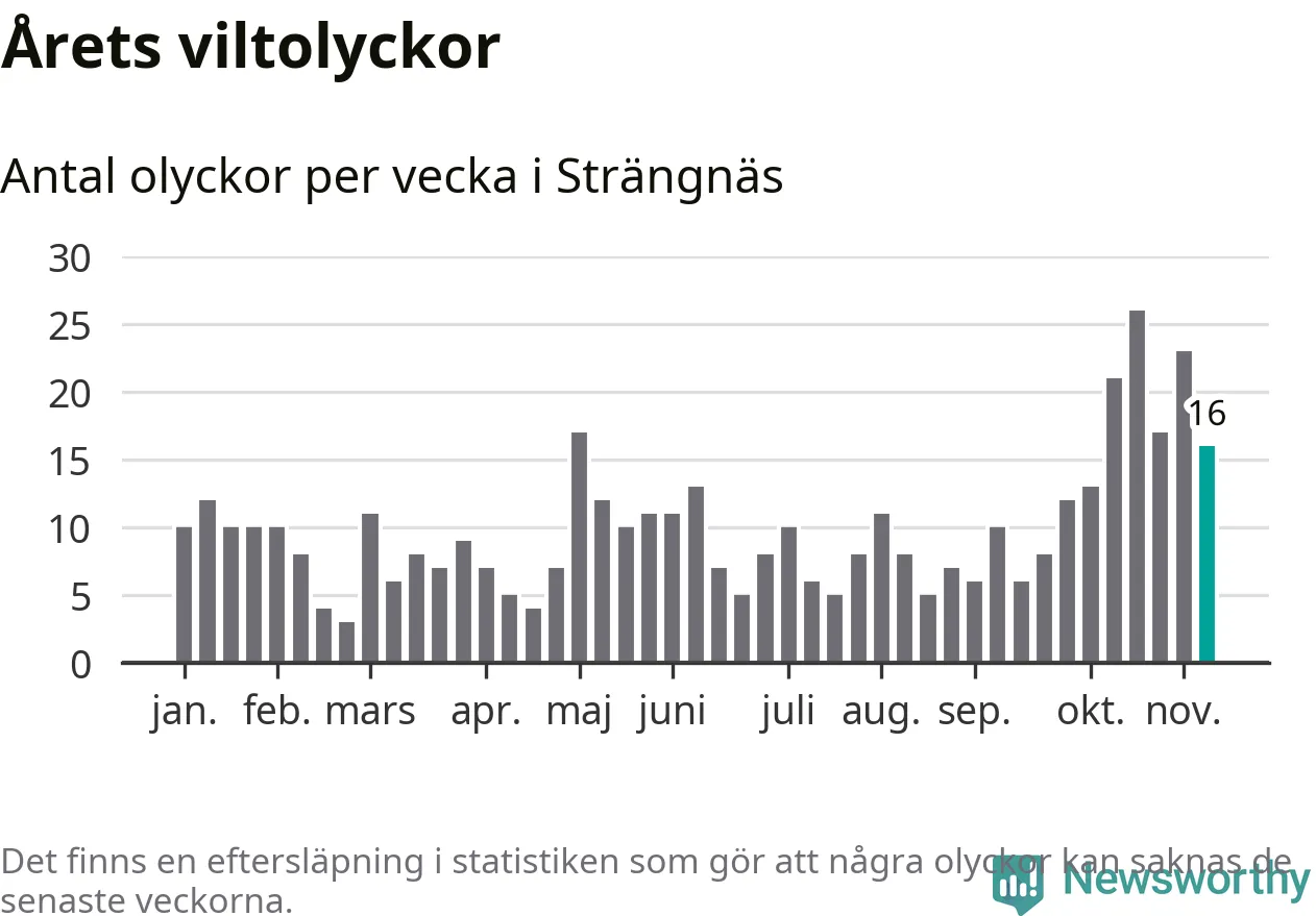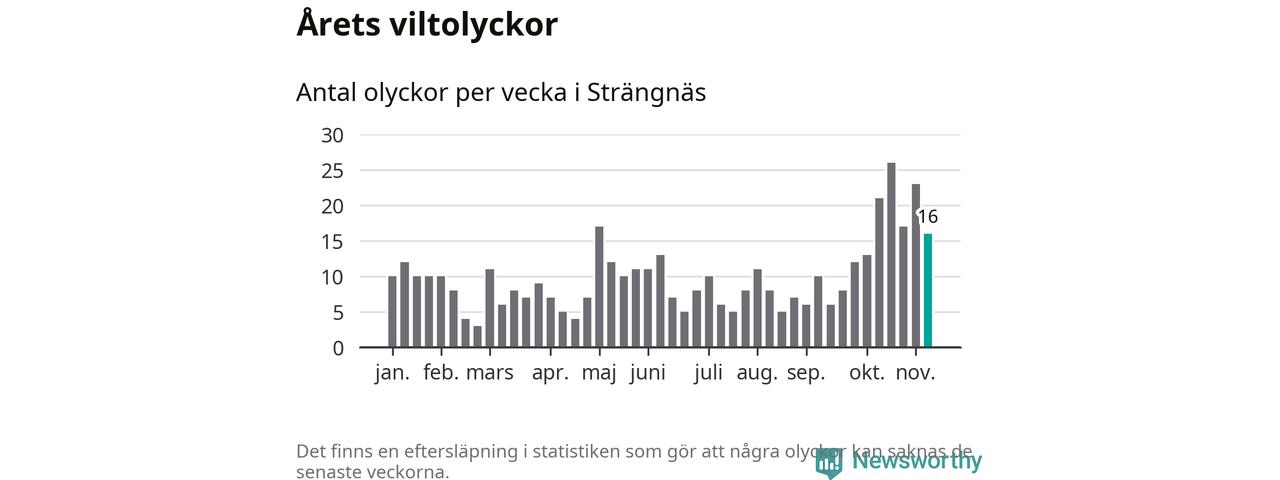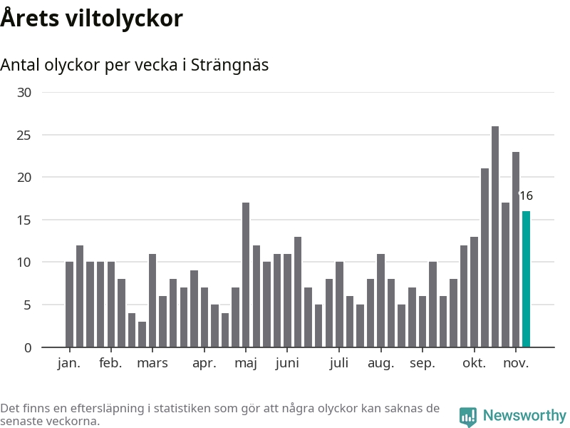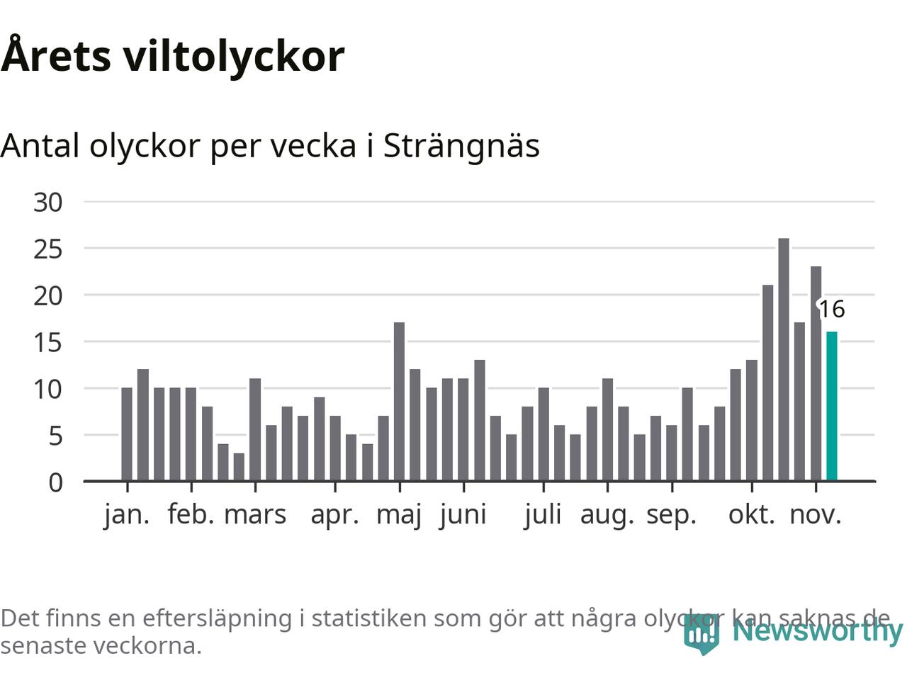 Hittills har 16 viltolyckor rapporterats in i Strängnäs kommun från vecka 46. Se listan här.