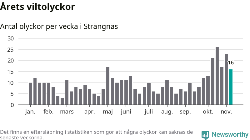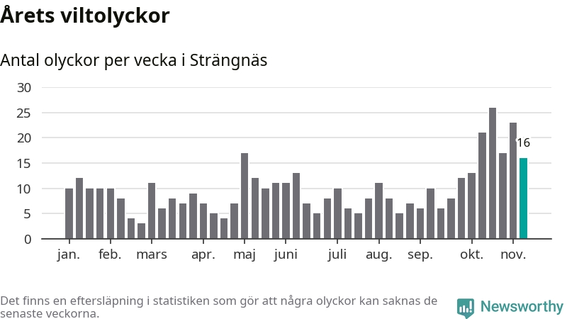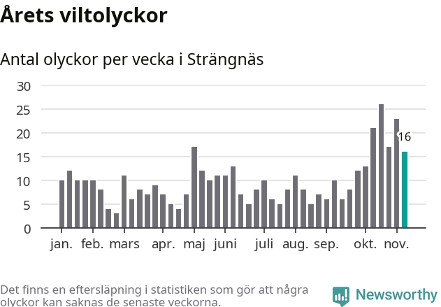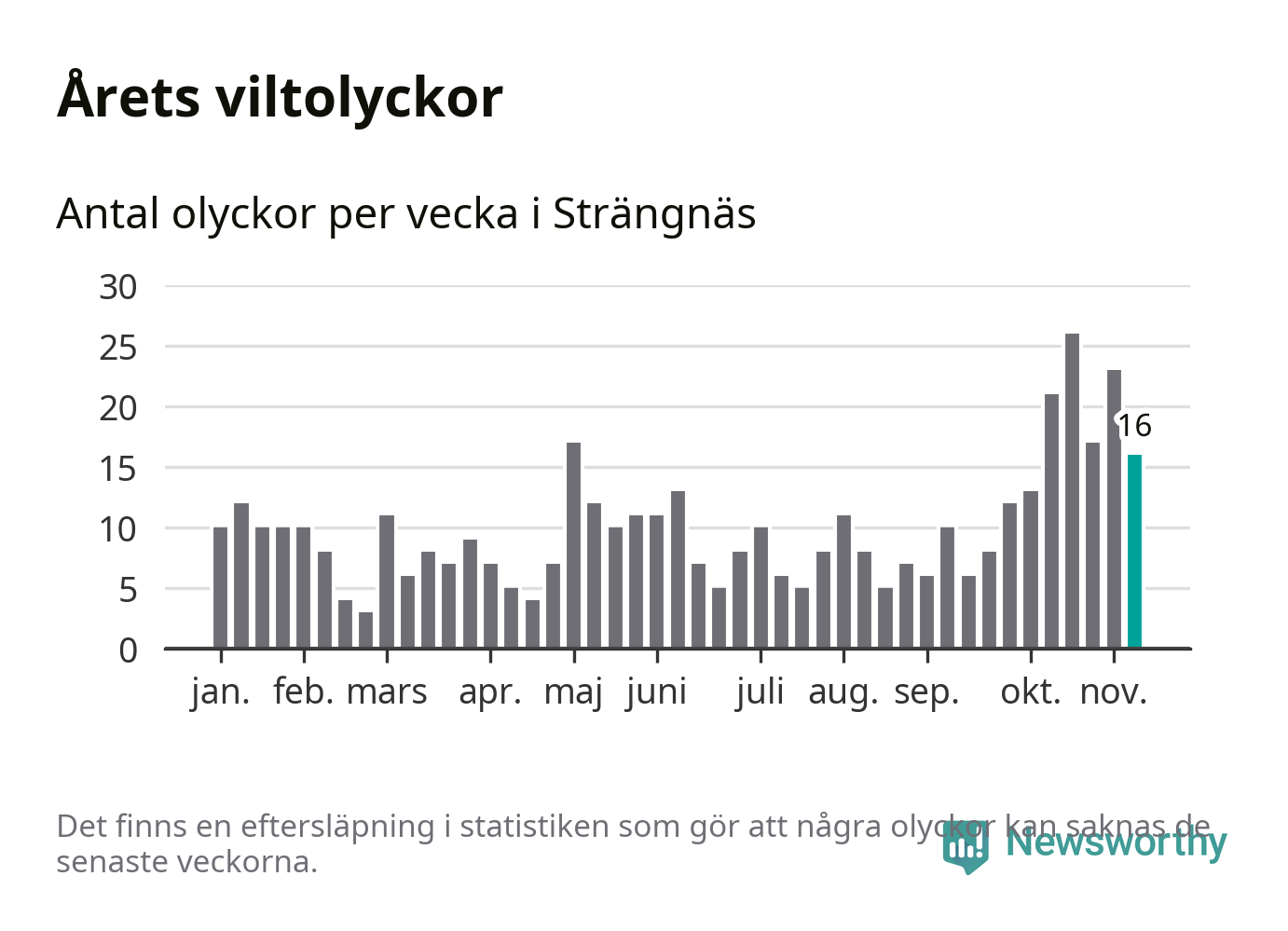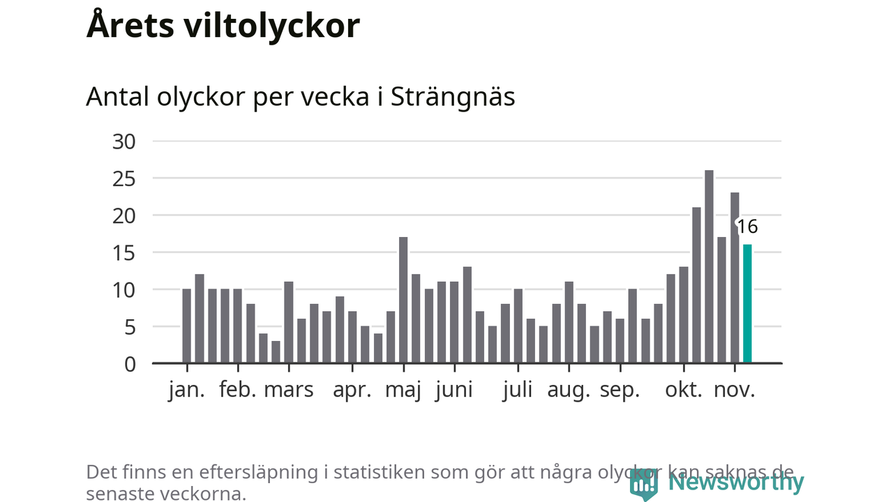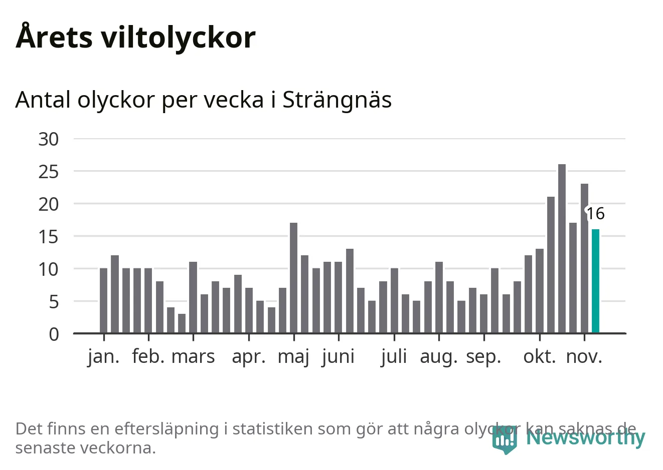 Hittills har 16 viltolyckor rapporterats in i Strängnäs kommun från vecka 46. Se listan här.