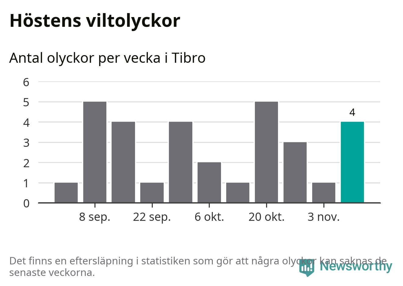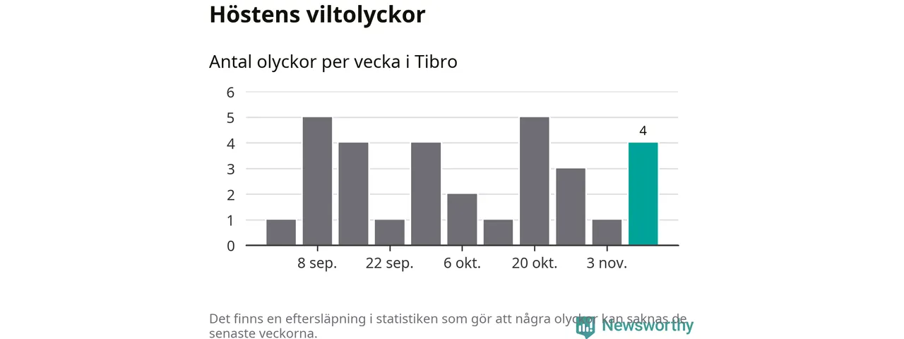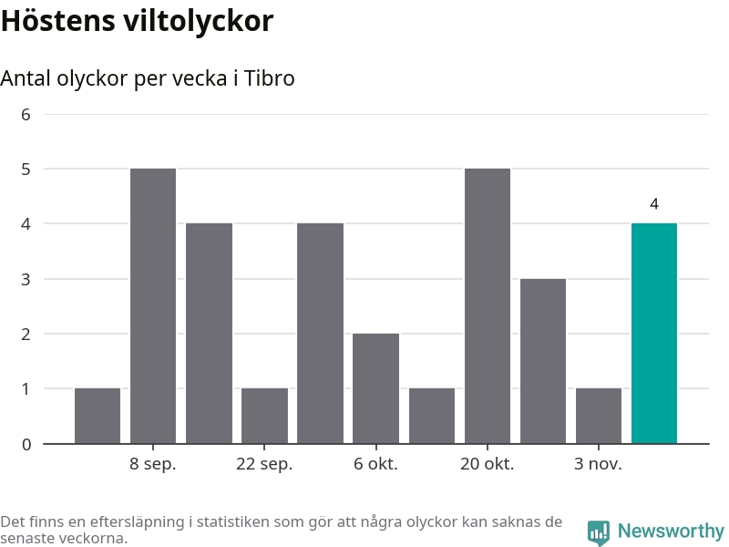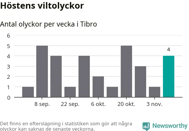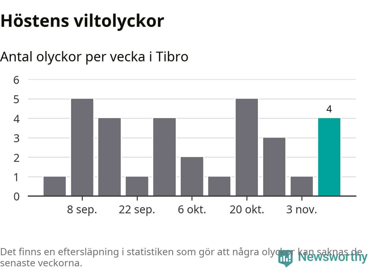 Under vecka 46 rapporterades fyra viltolyckor in i Tibro kommun. Därmed har det inträffat fler viltolyckor hittills den här hösten, än det brukar göra en hel genomsnittlig höst.