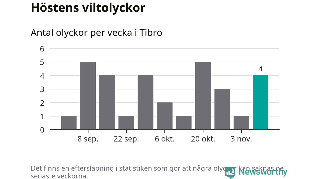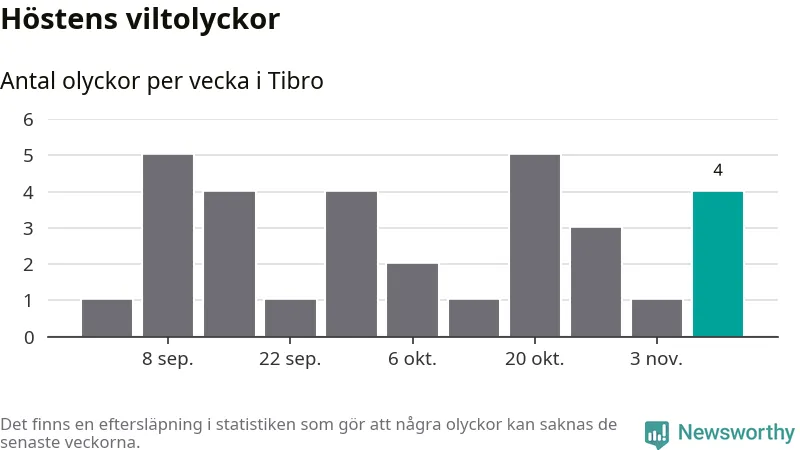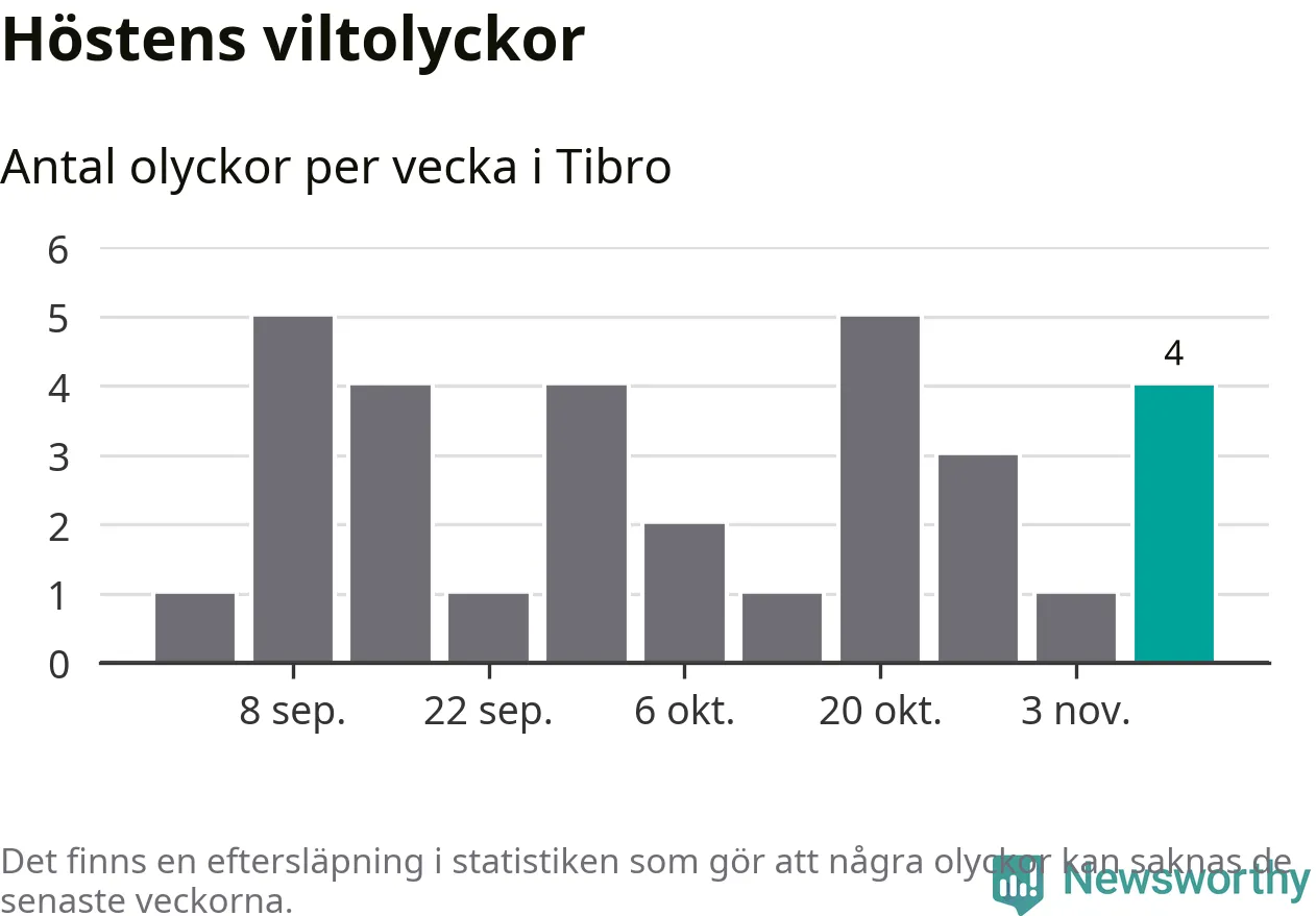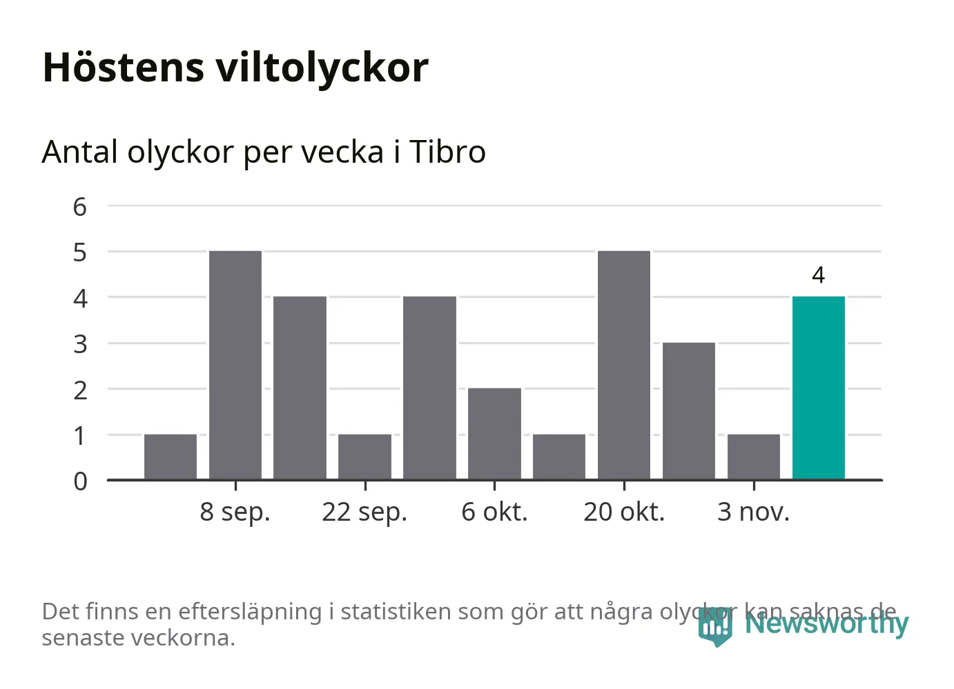 Under vecka 46 rapporterades fyra viltolyckor in i Tibro kommun. Därmed har det inträffat fler viltolyckor hittills den här hösten, än det brukar göra en hel genomsnittlig höst.