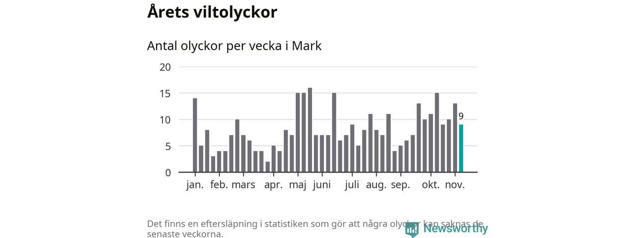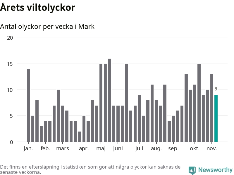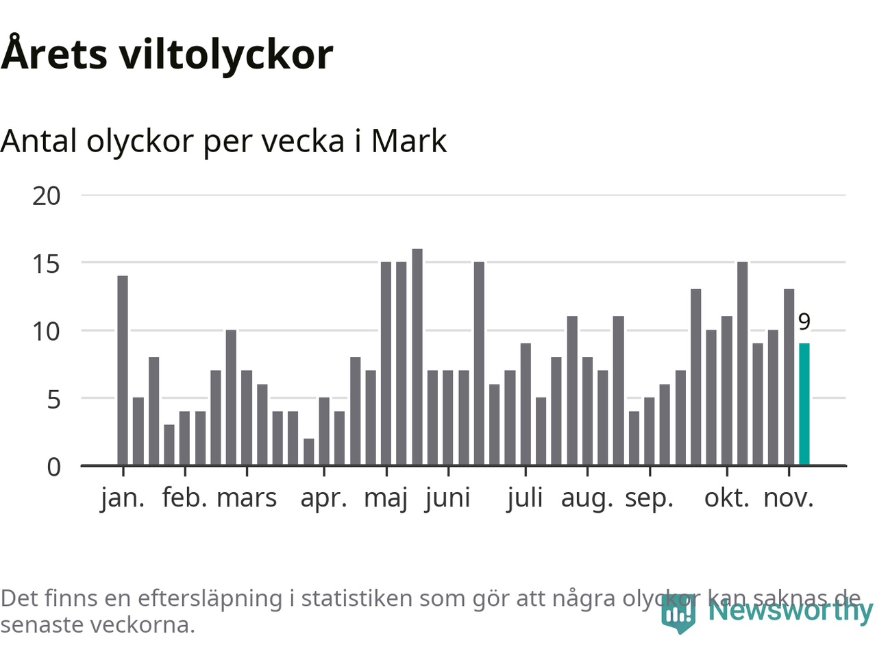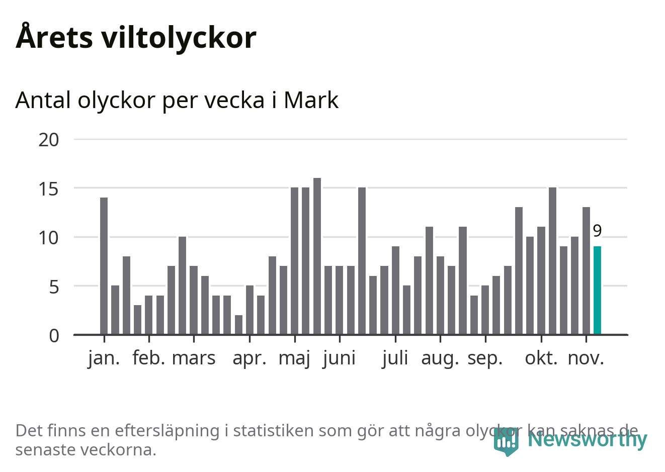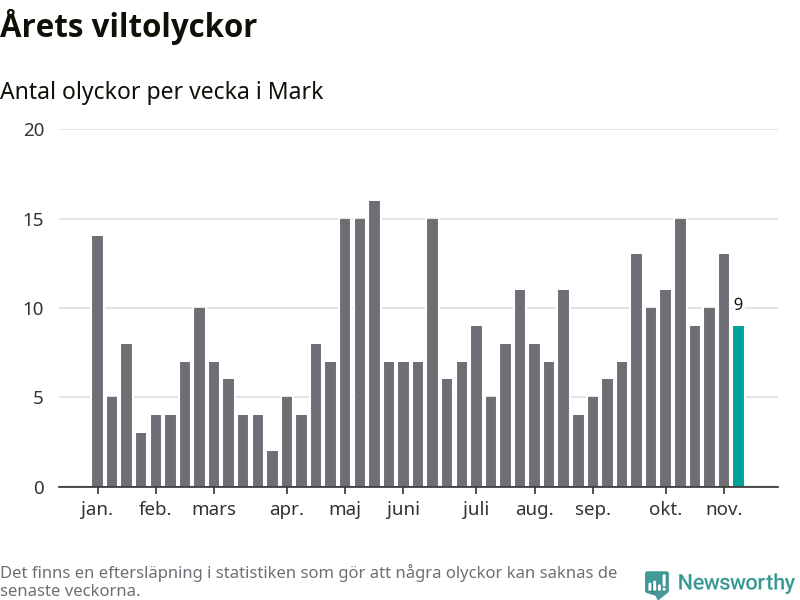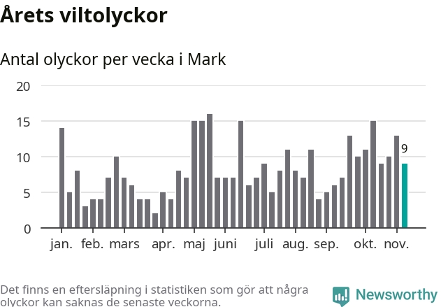 Hittills har nio viltolyckor rapporterats in i Marks kommun från vecka 46. Se listan här.