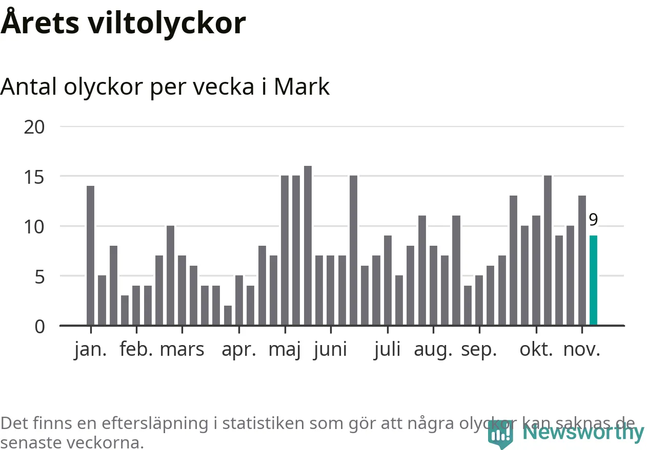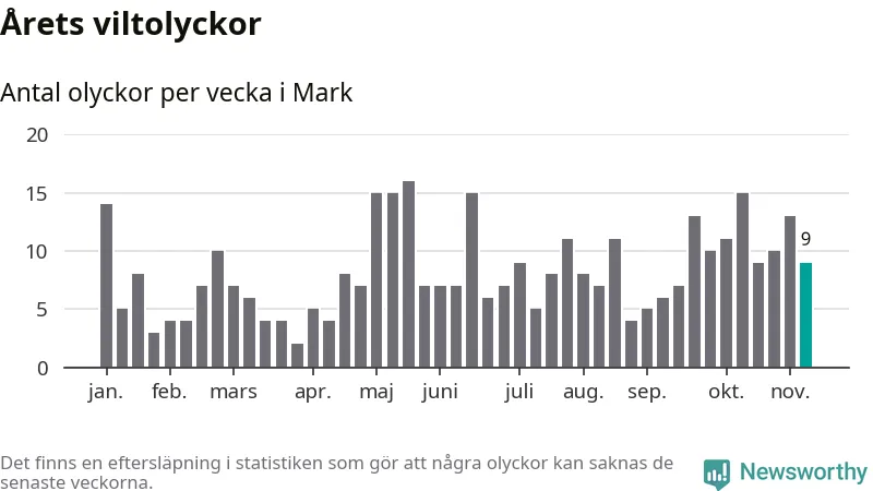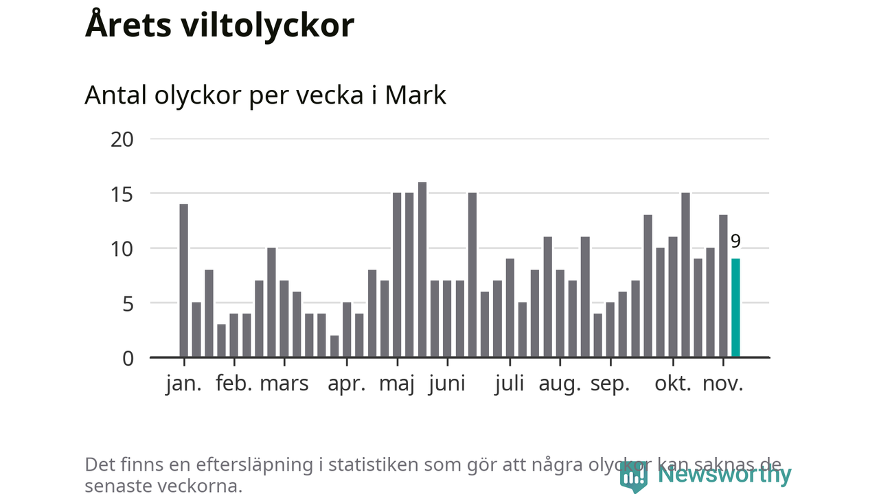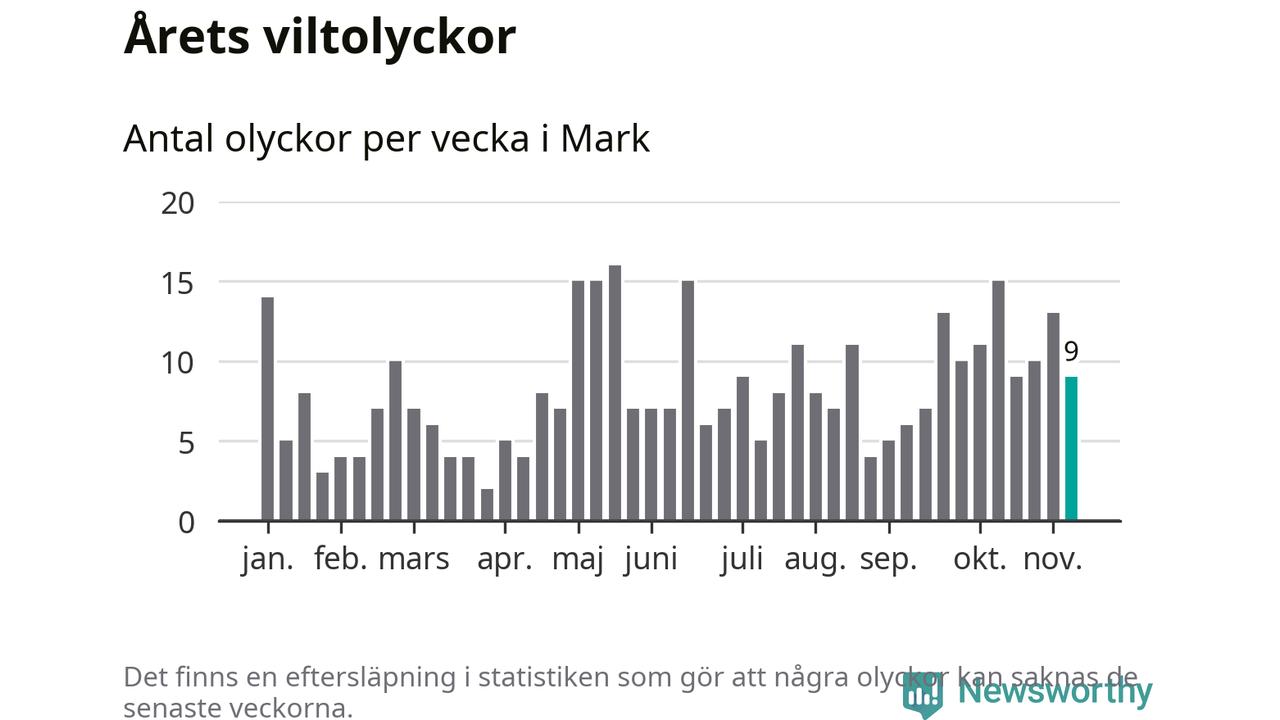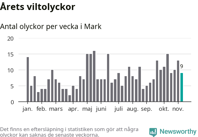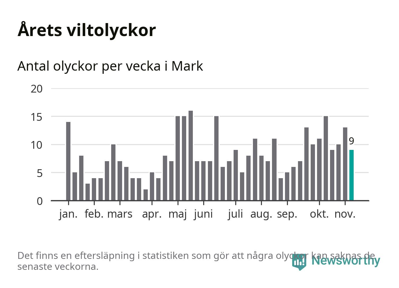 Hittills har nio viltolyckor rapporterats in i Marks kommun från vecka 46. Se listan här.