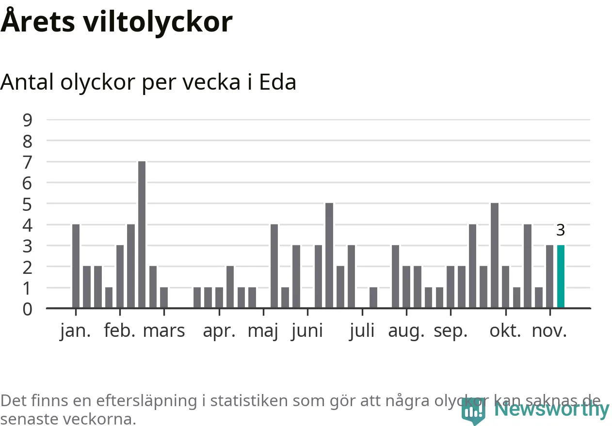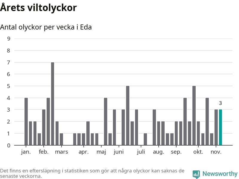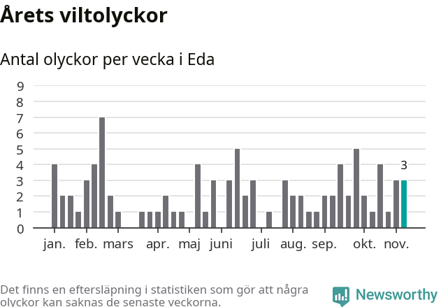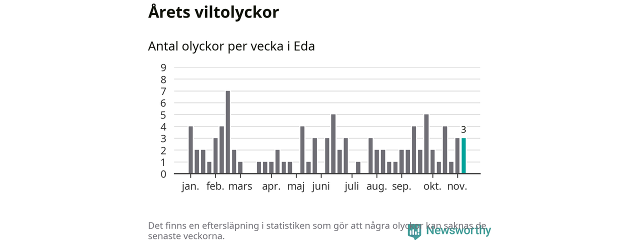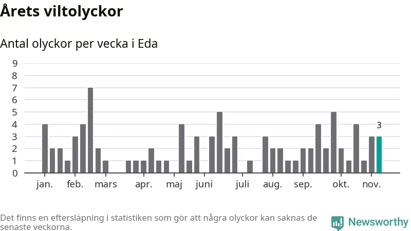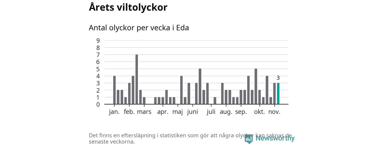 Hittills har tre viltolyckor rapporterats in i Eda kommun från vecka 46. Se listan här.