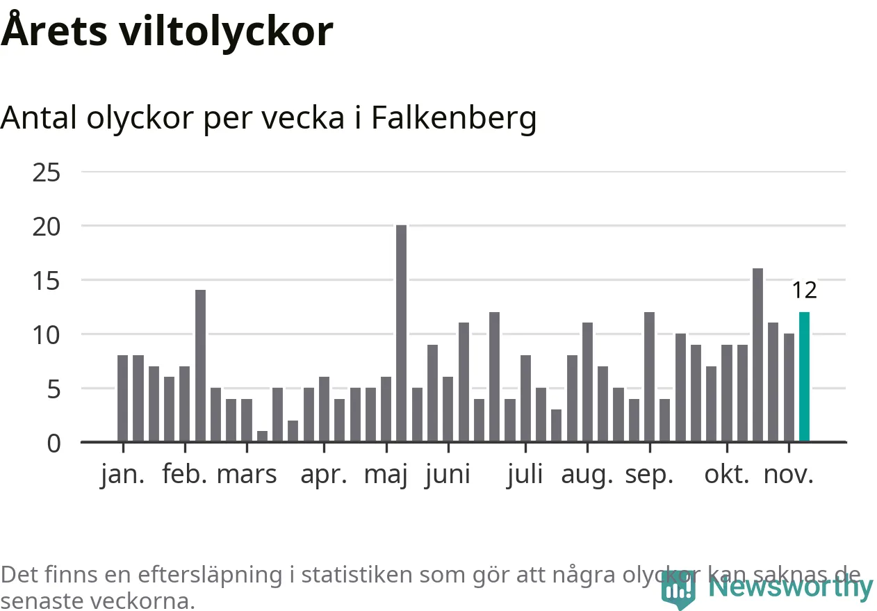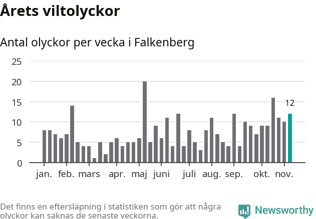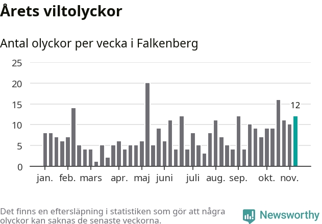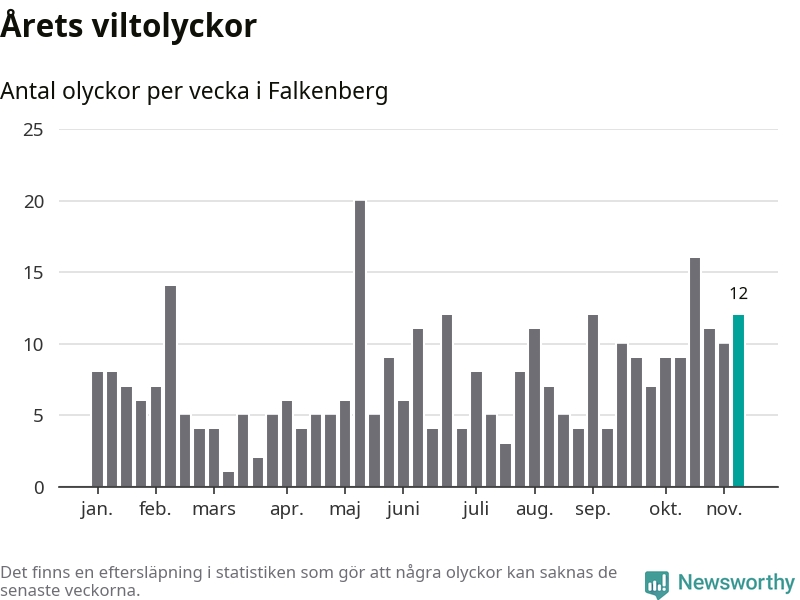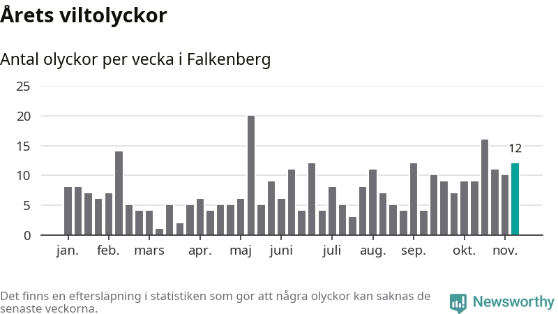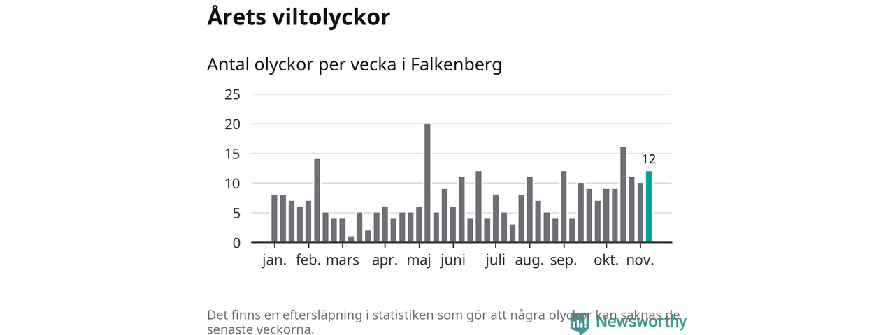 Hittills har tolv viltolyckor rapporterats in i Falkenbergs kommun från vecka 46. Se listan här.