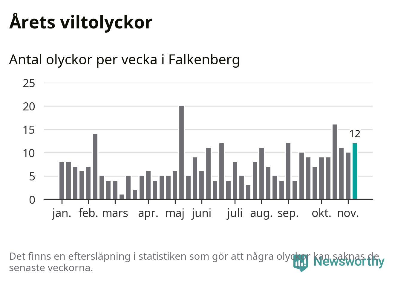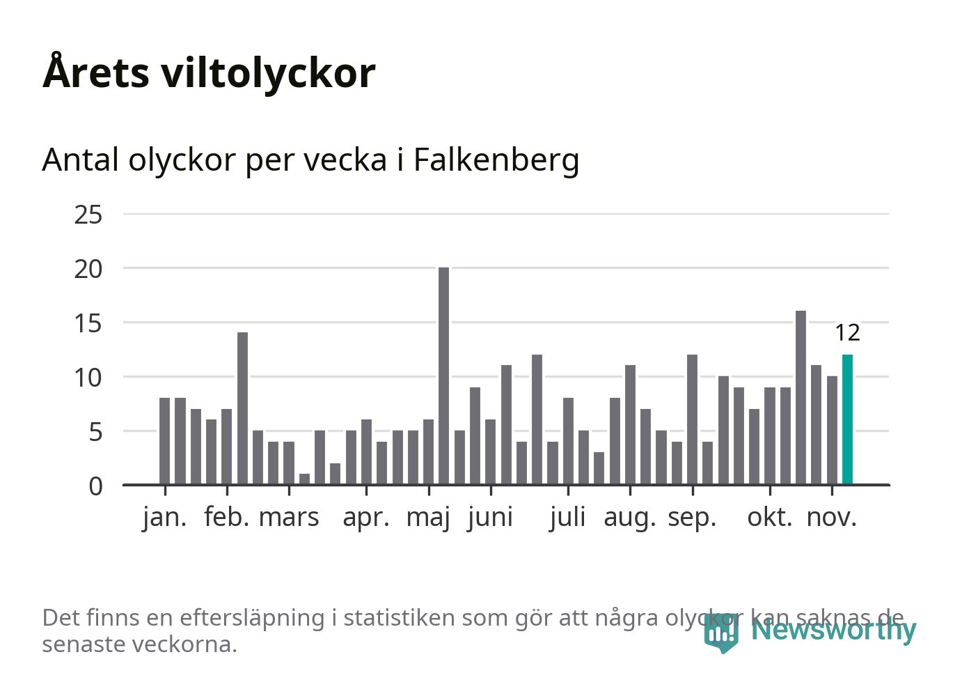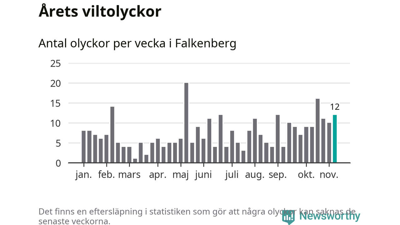 Hittills har tolv viltolyckor rapporterats in i Falkenbergs kommun från vecka 46. Se listan här.