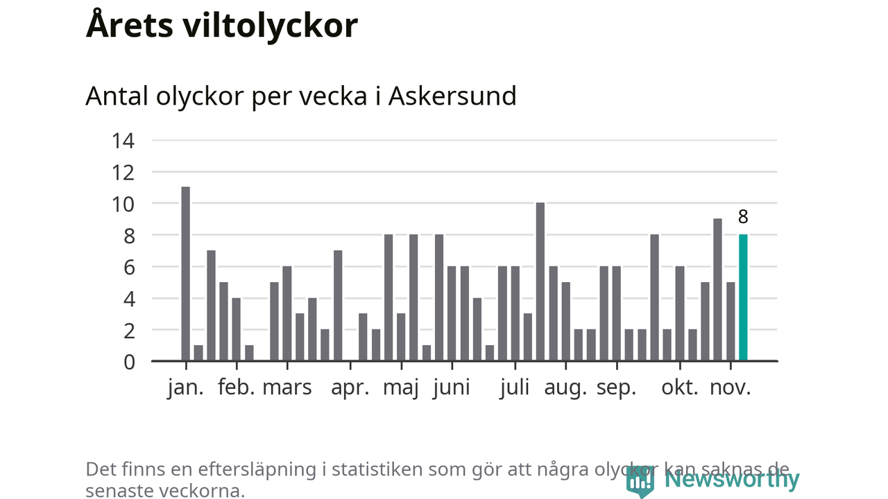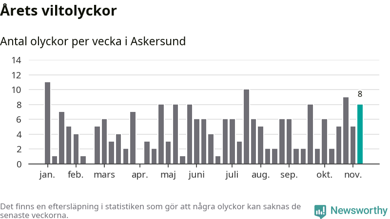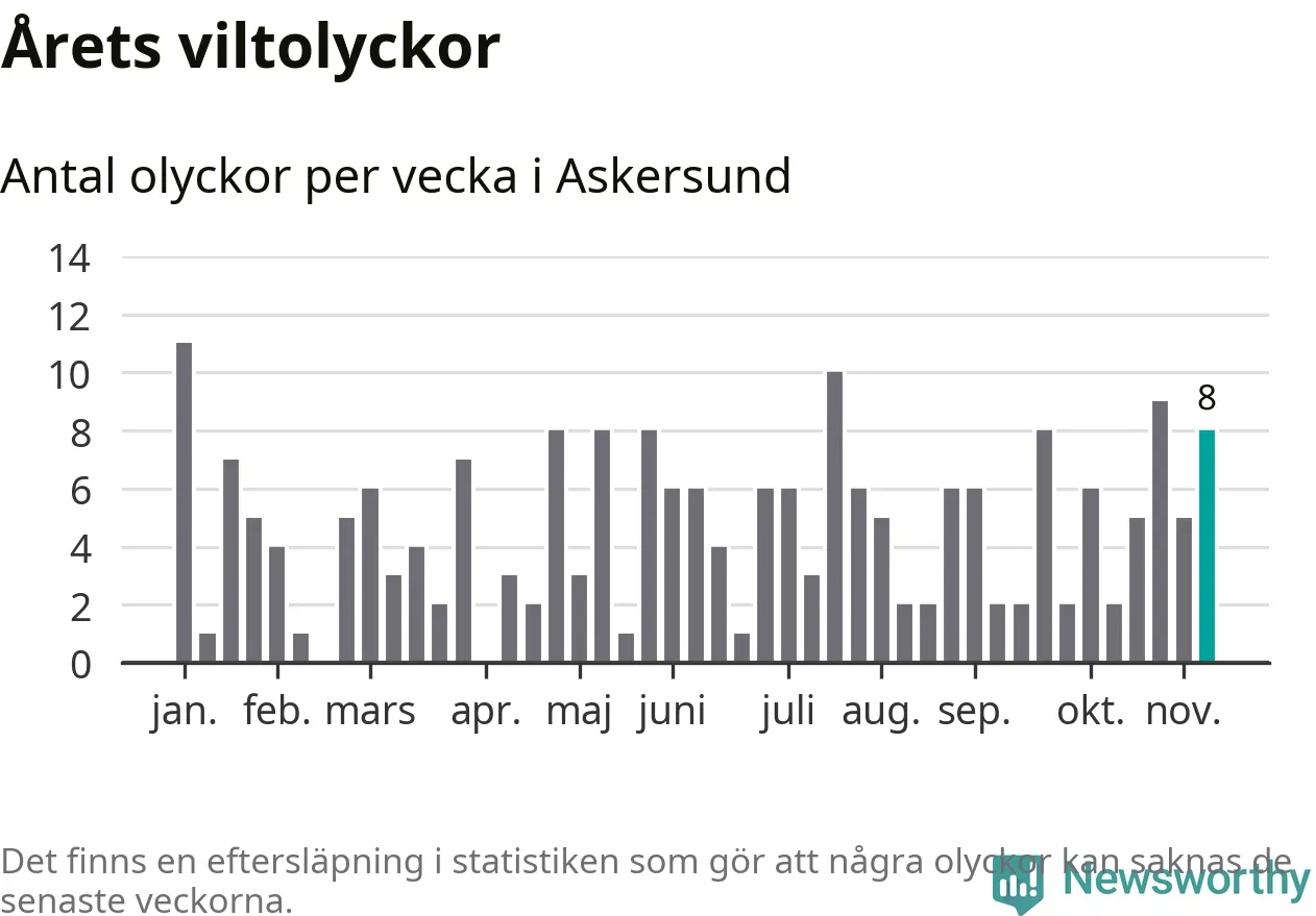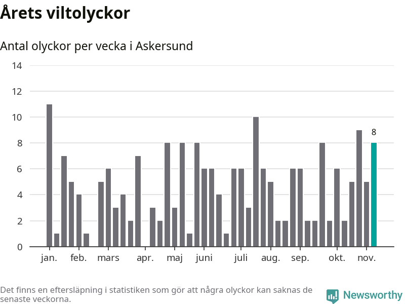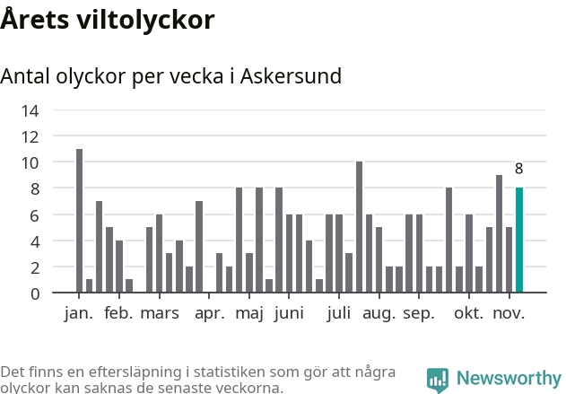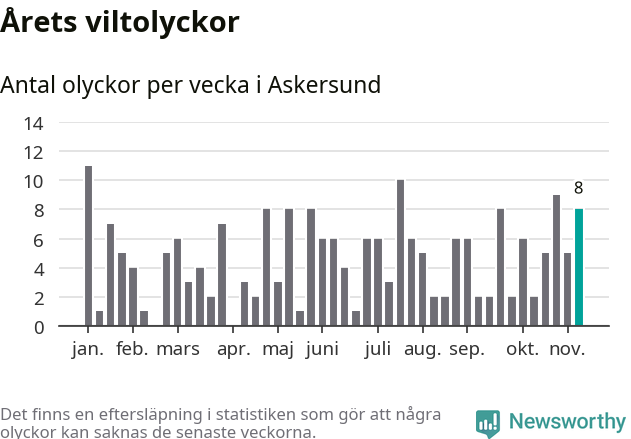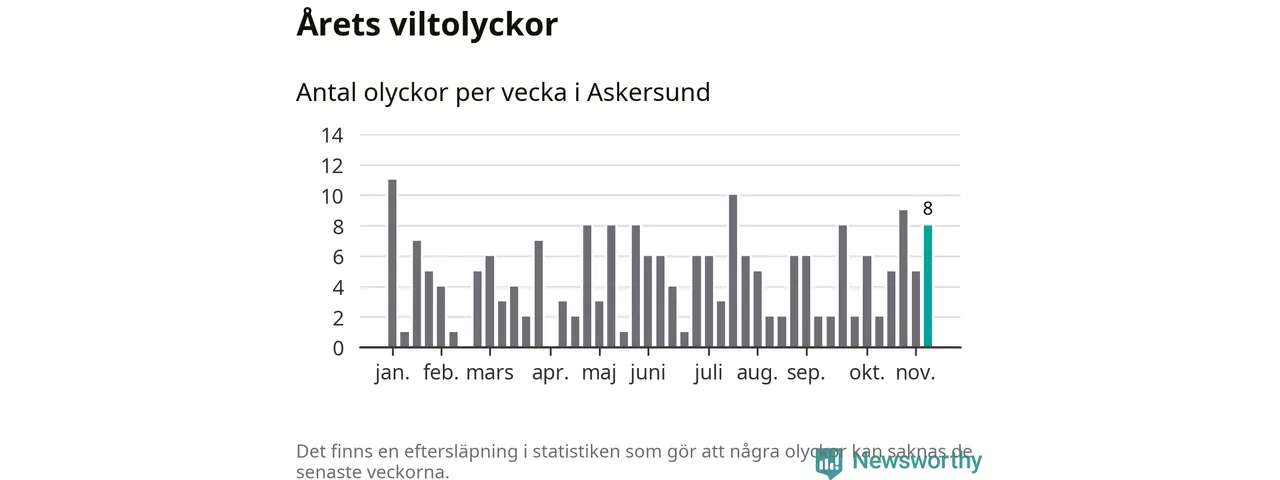Hittills har åtta viltolyckor rapporterats in i Askersunds kommun från vecka 46. Se listan här.