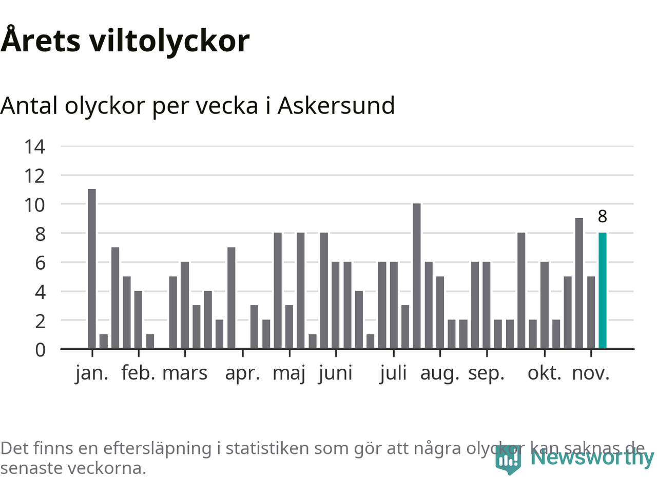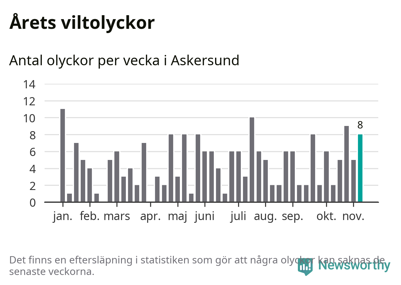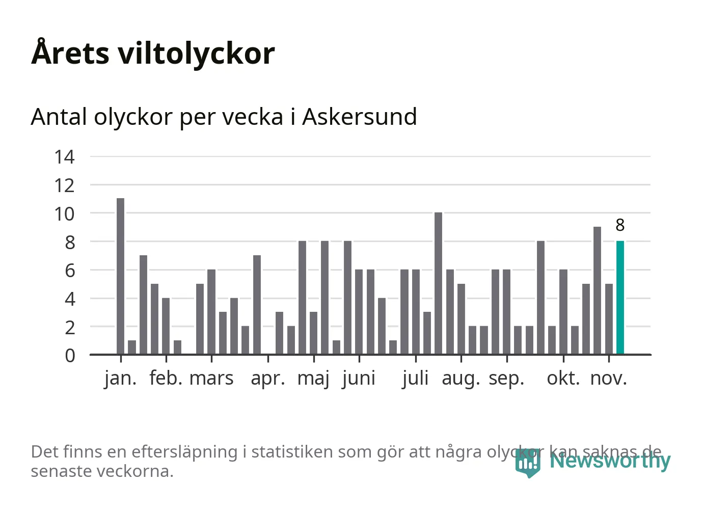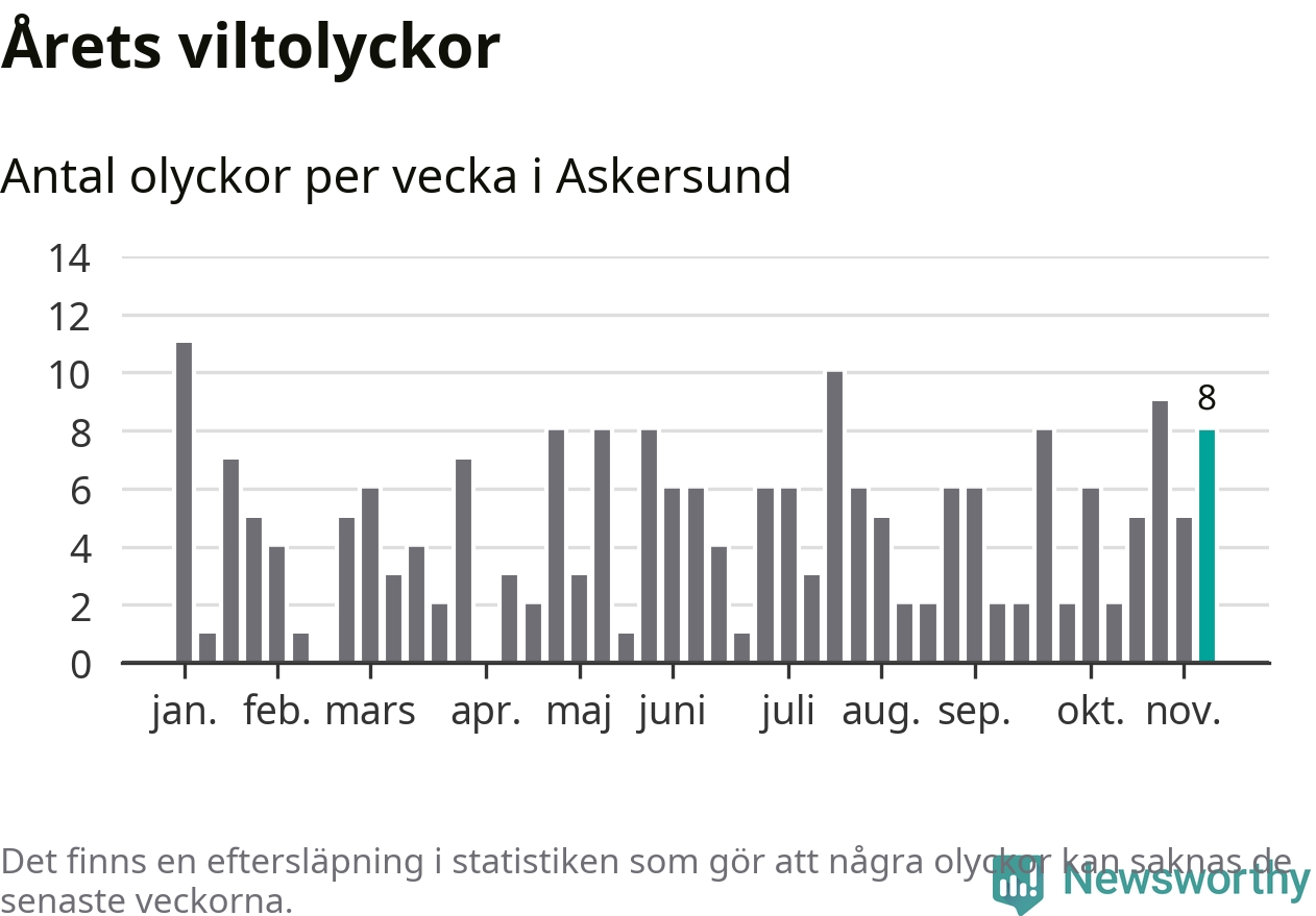 Hittills har åtta viltolyckor rapporterats in i Askersunds kommun från vecka 46. Se listan här.