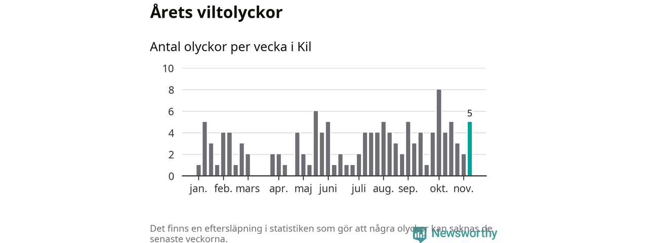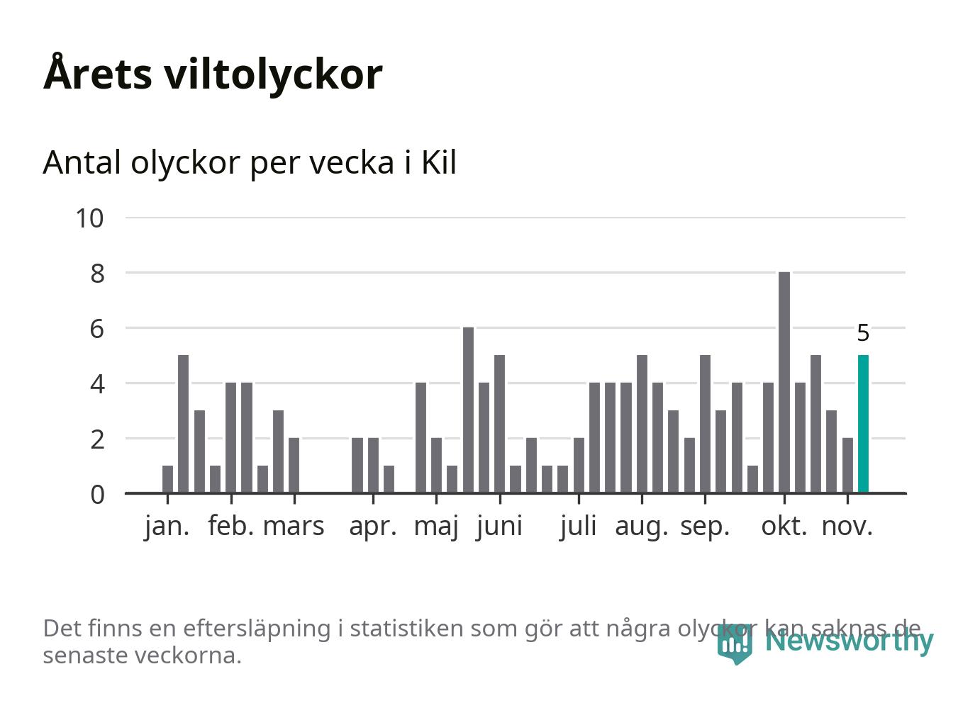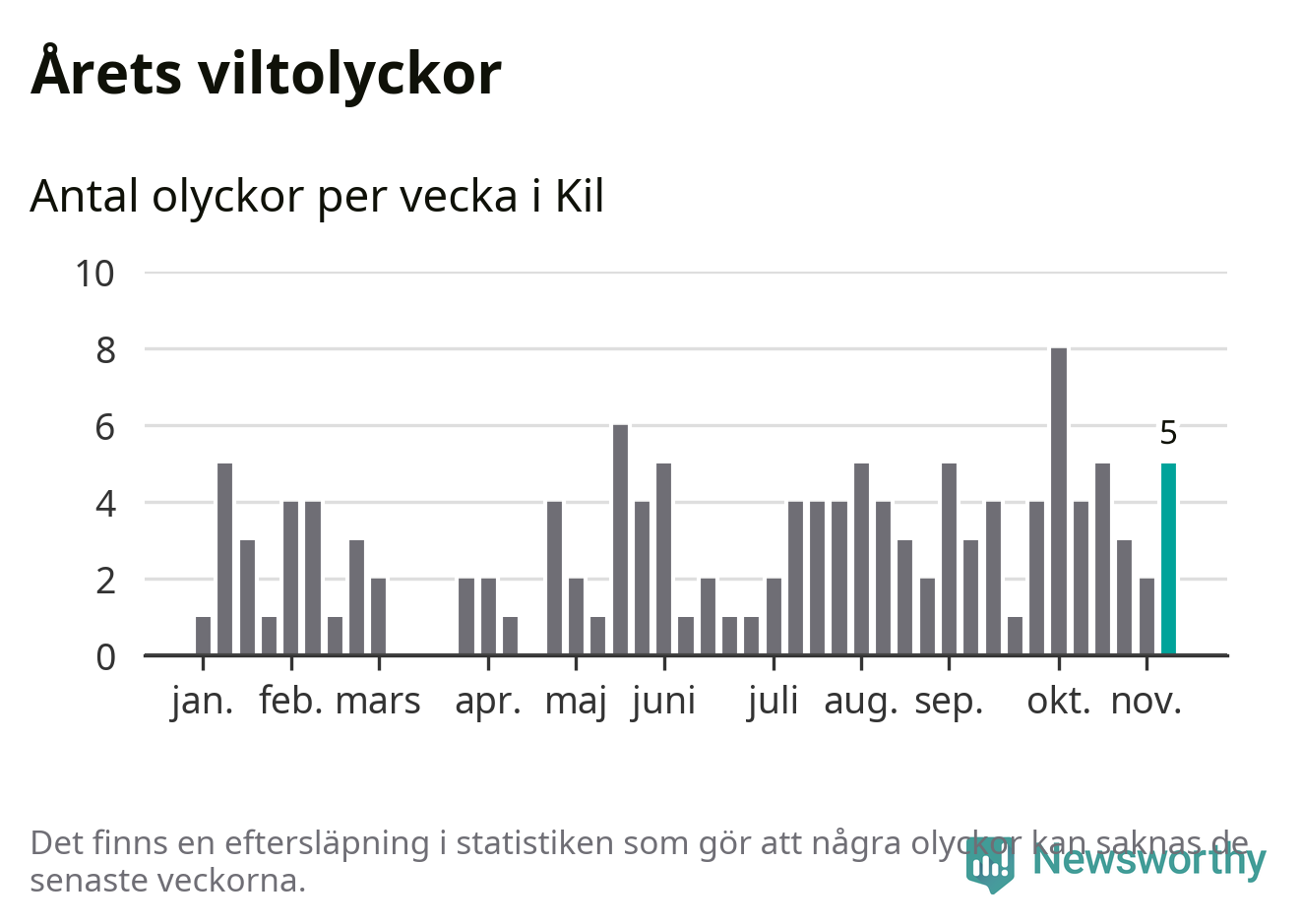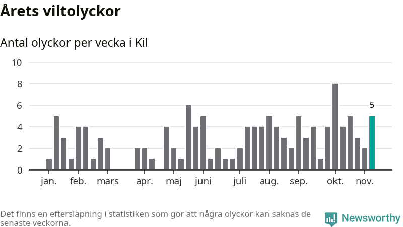 Hittills har fem viltolyckor rapporterats in i Kils kommun från vecka 46. Se listan här.