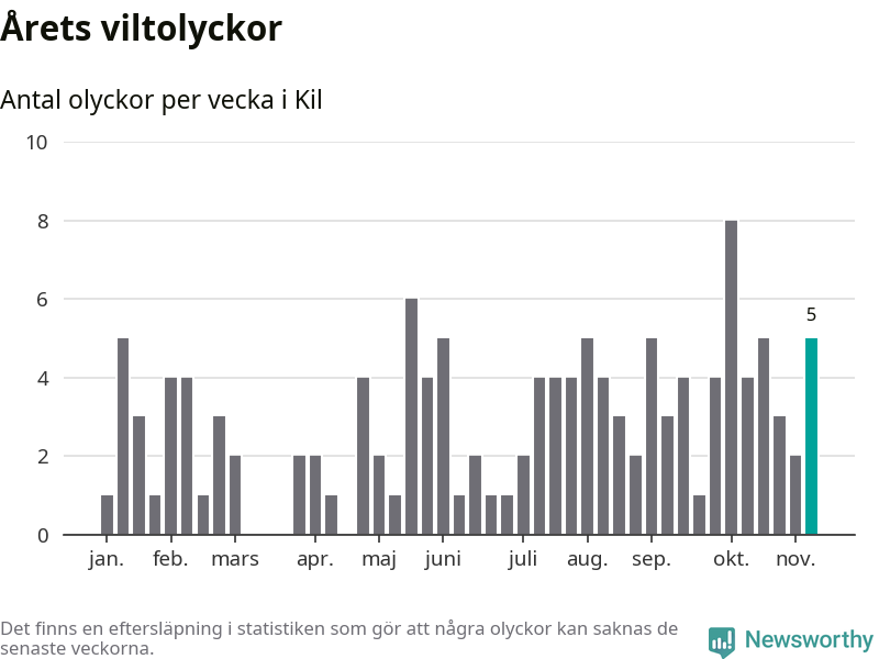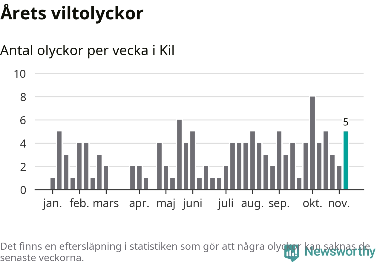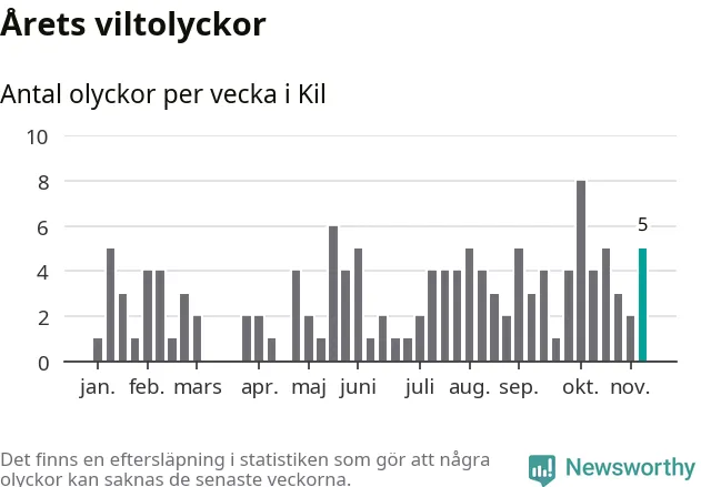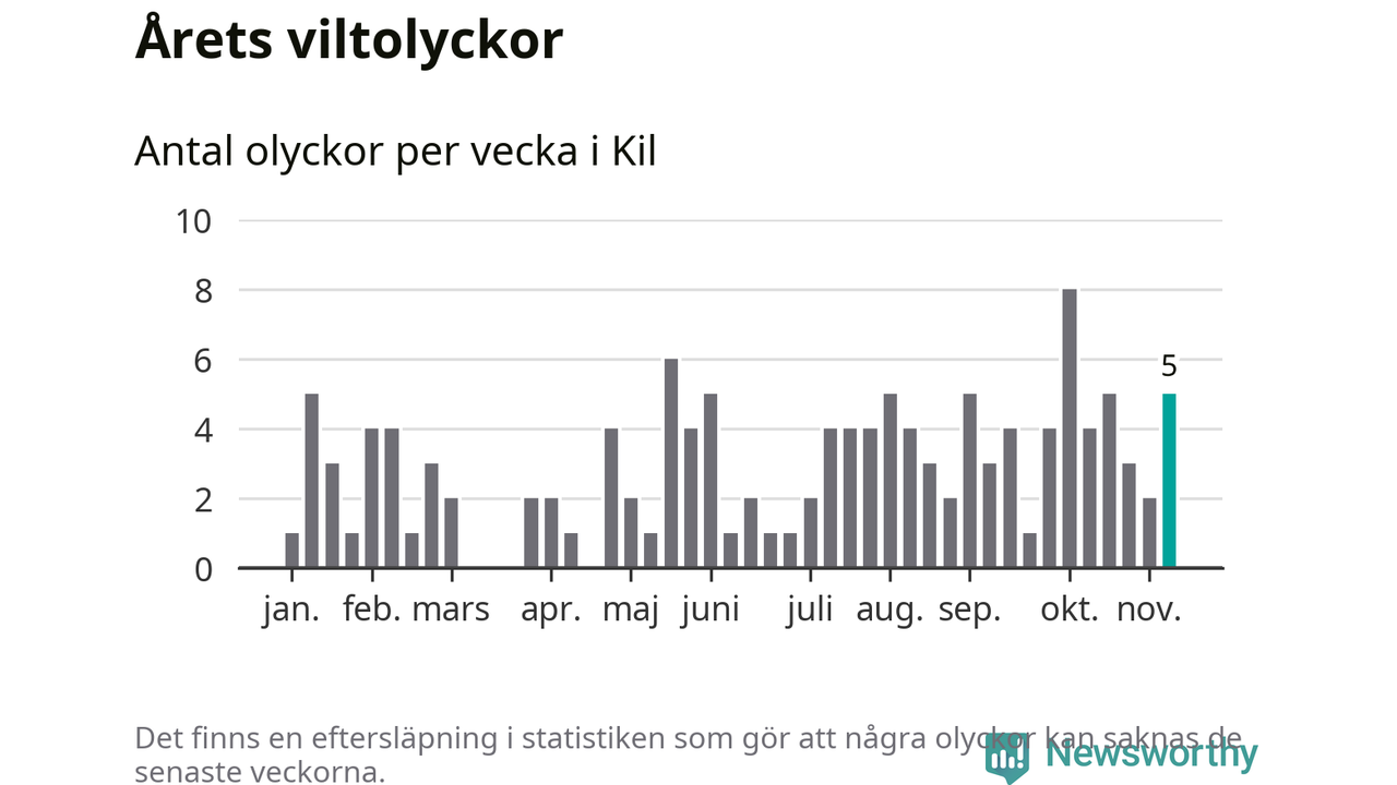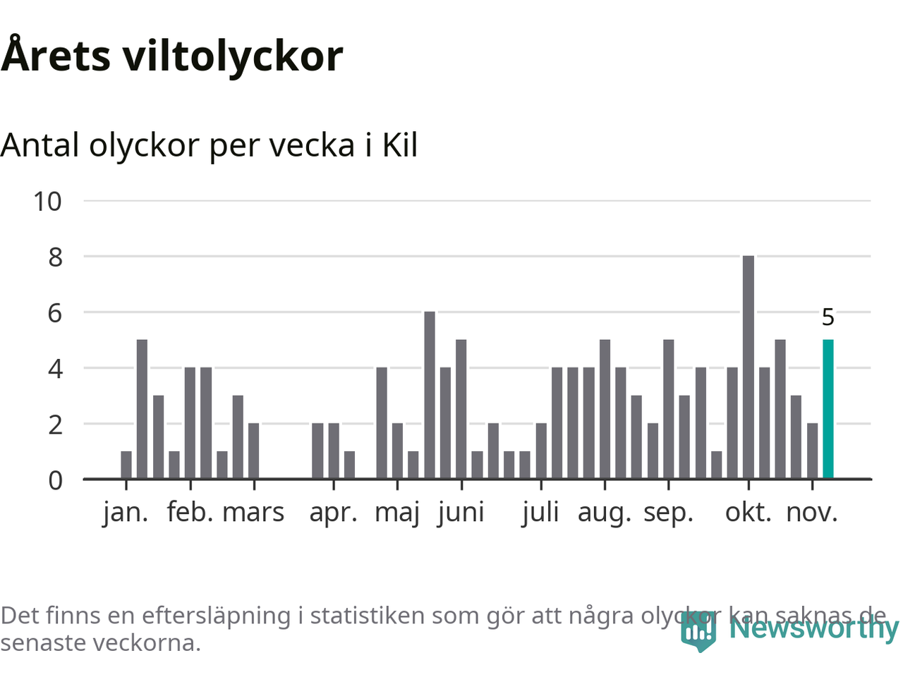 Hittills har fem viltolyckor rapporterats in i Kils kommun från vecka 46. Se listan här.