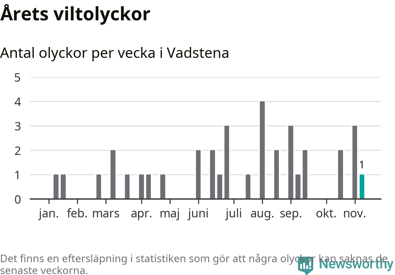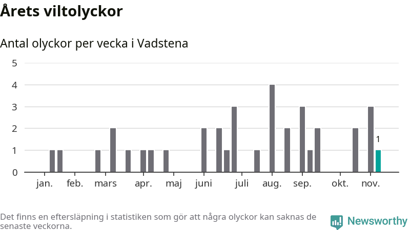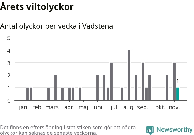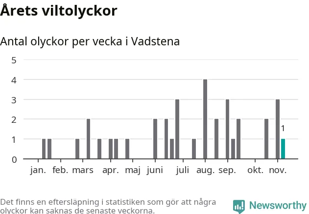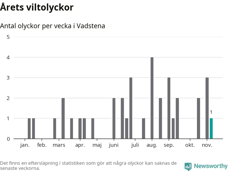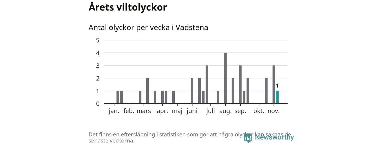 Från förra veckan (vecka 46) har hittills en viltolycka rapporterats in i Vadstena kommun.