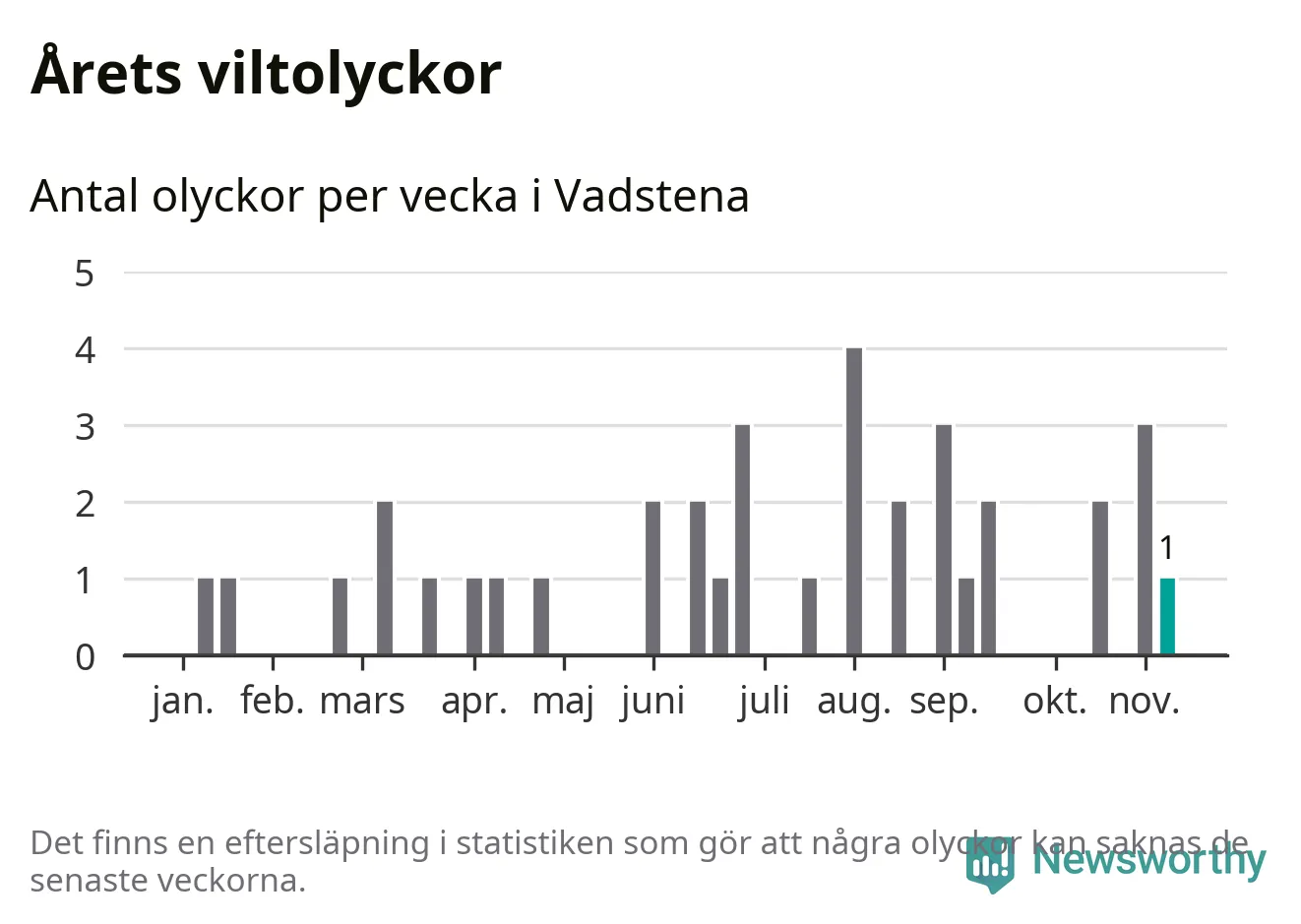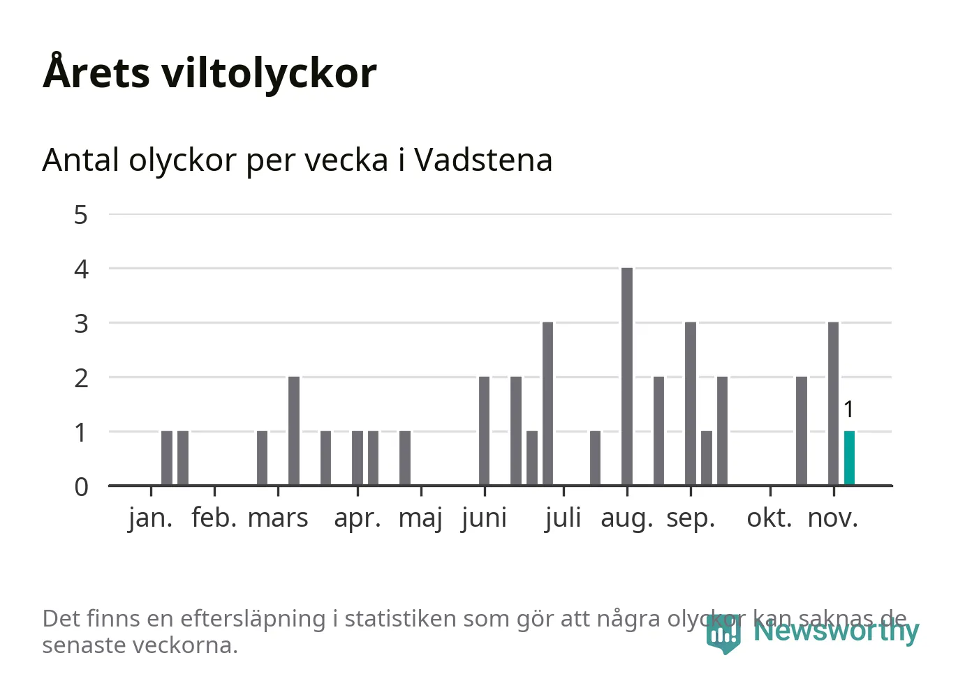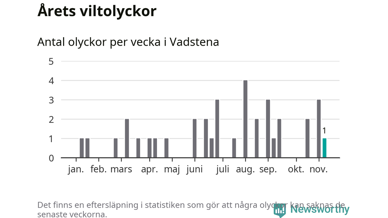 Från förra veckan (vecka 46) har hittills en viltolycka rapporterats in i Vadstena kommun.