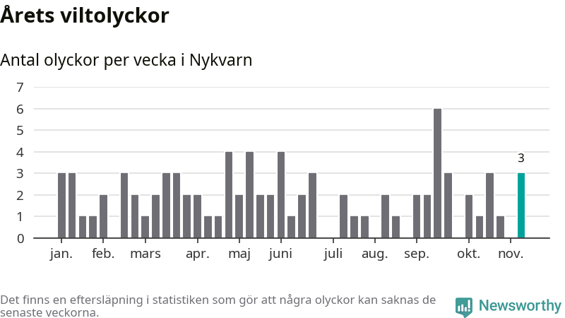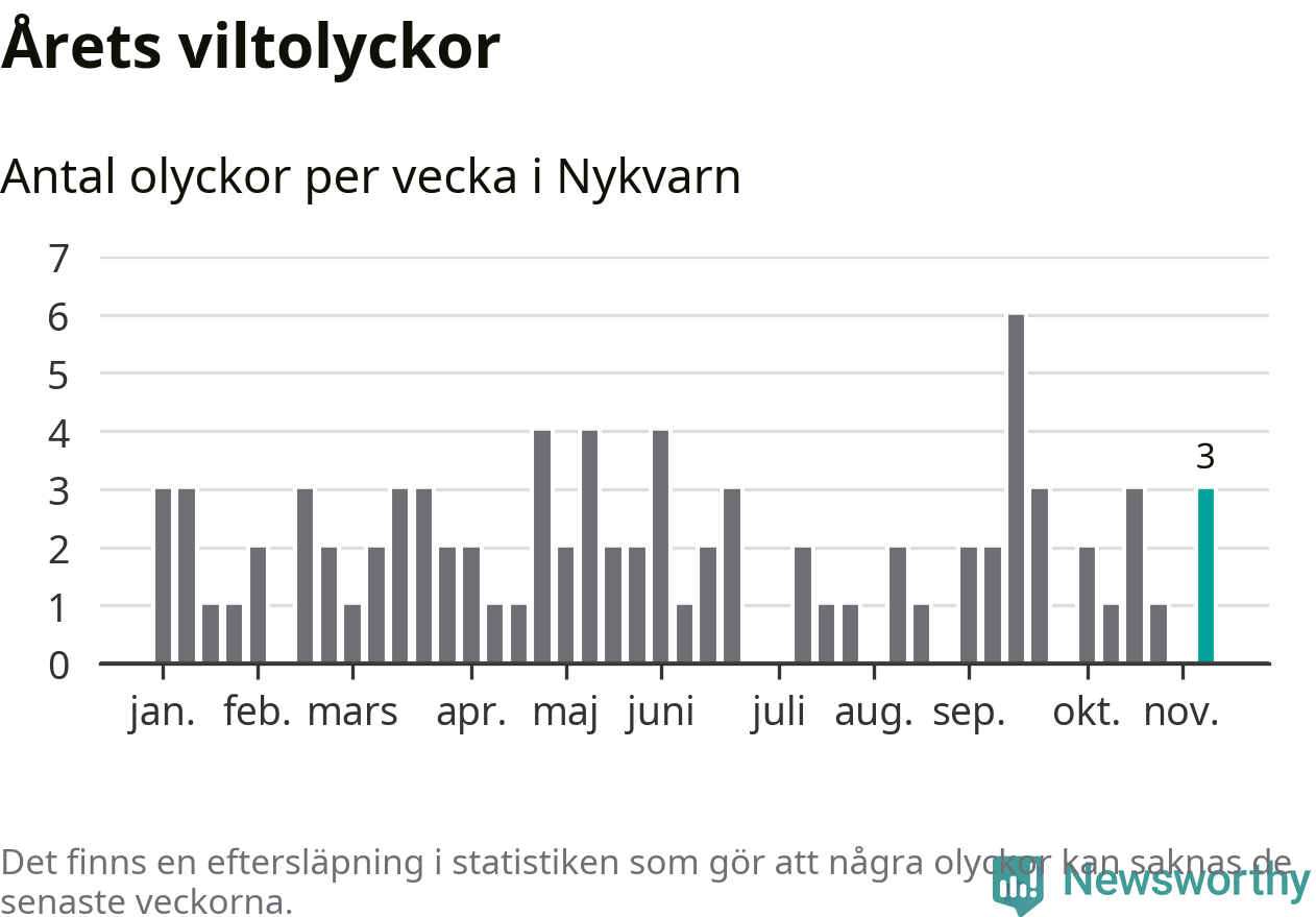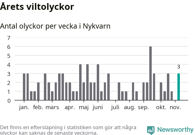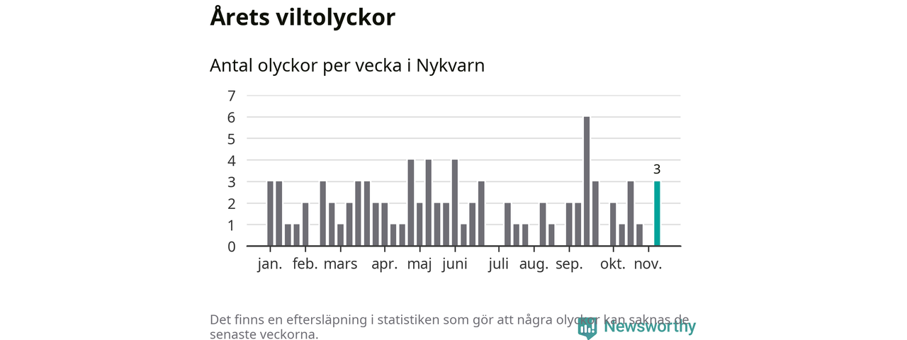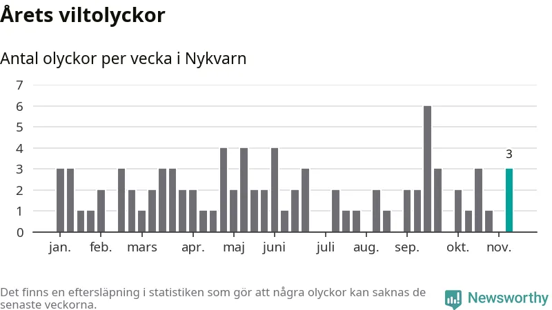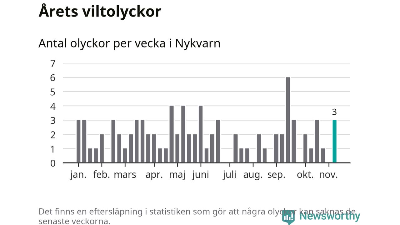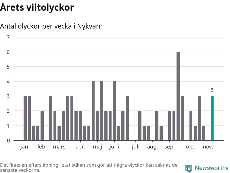 Hittills har tre viltolyckor rapporterats in i Nykvarns kommun från vecka 46. Se listan här.