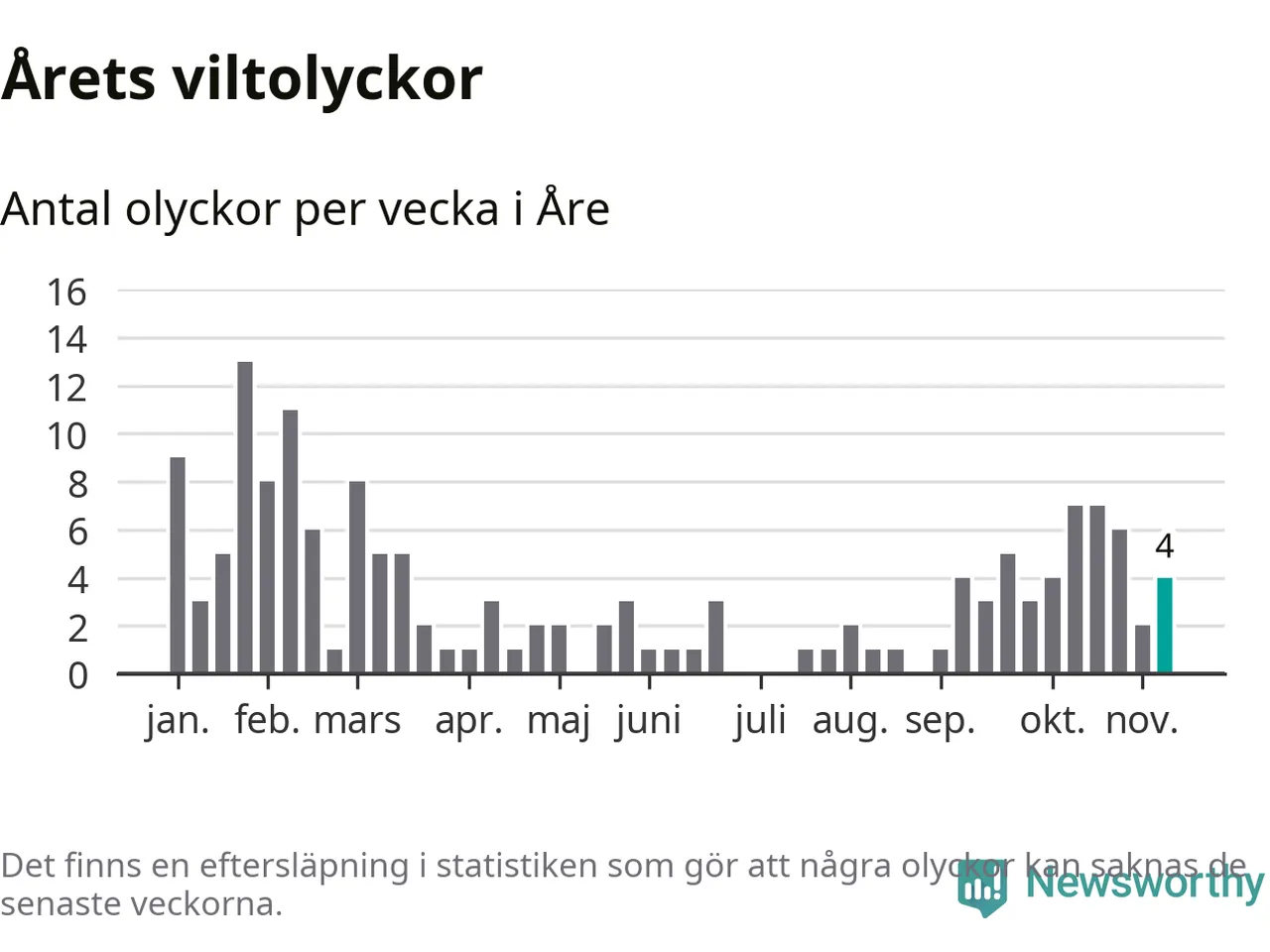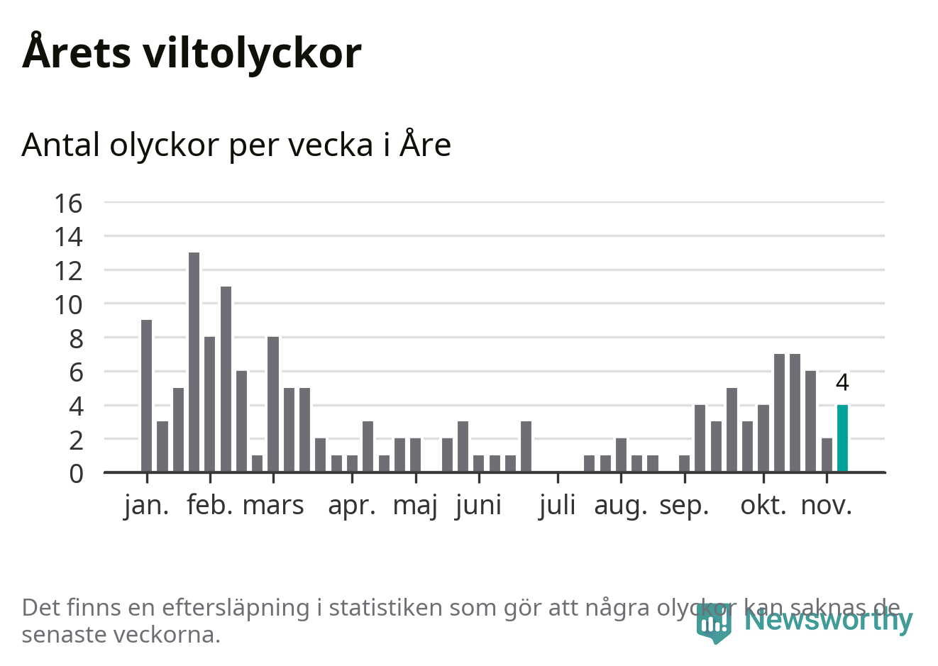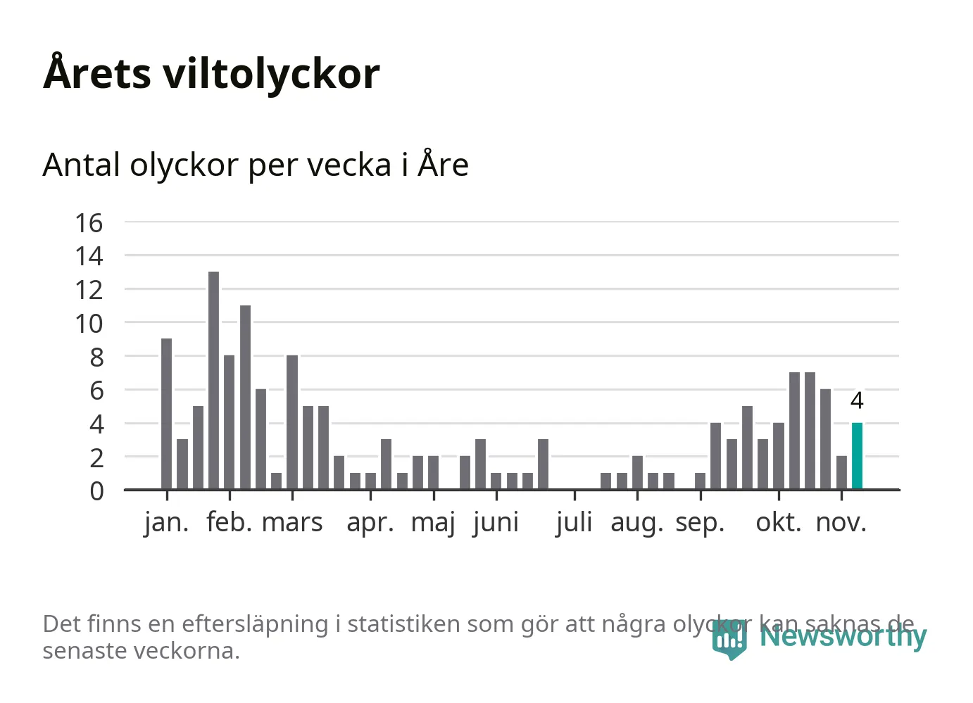 Hittills har fyra viltolyckor rapporterats in i Åre kommun från vecka 46. Se listan här.