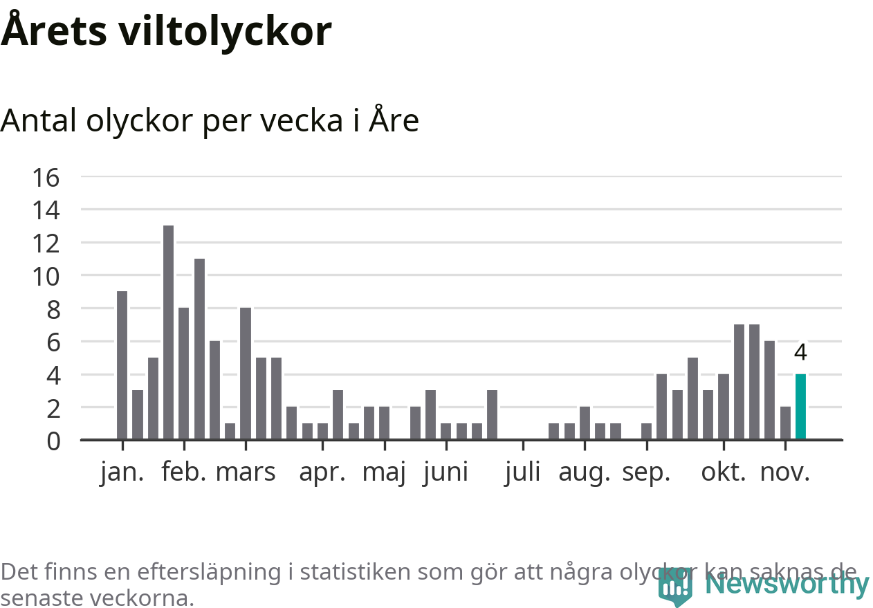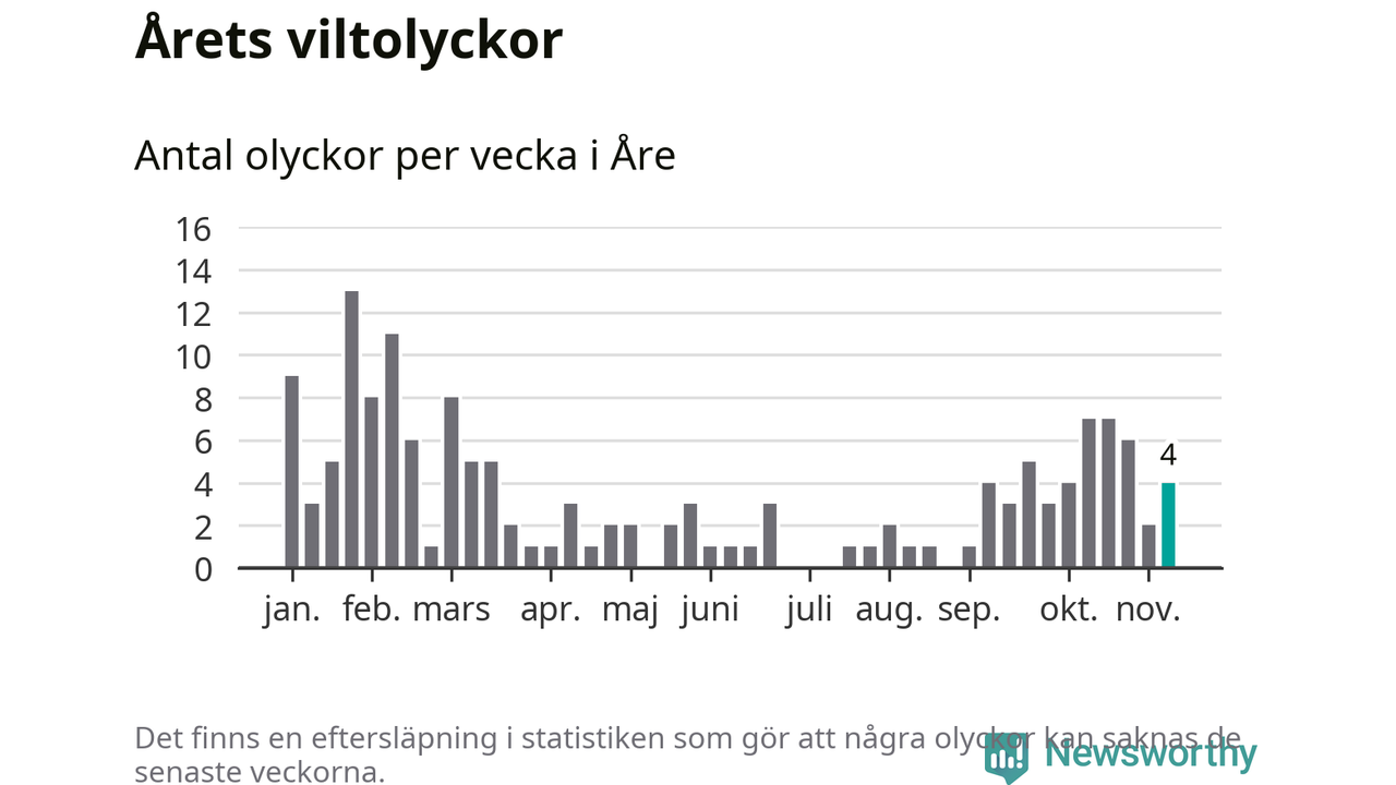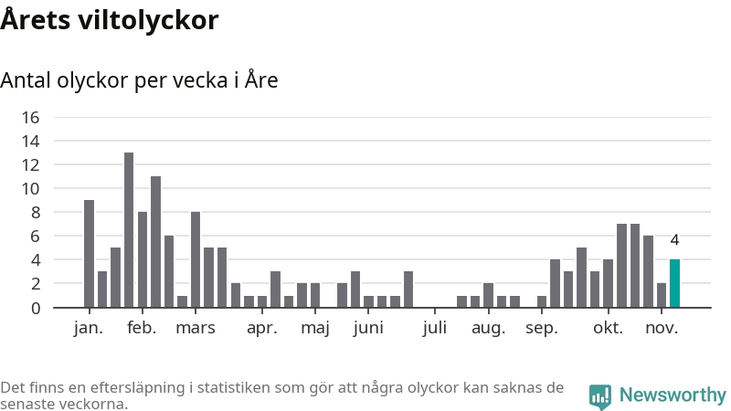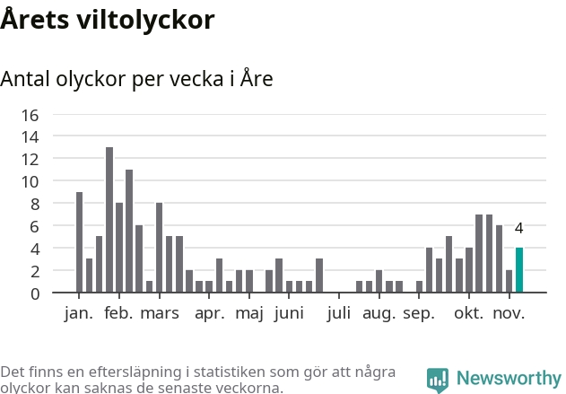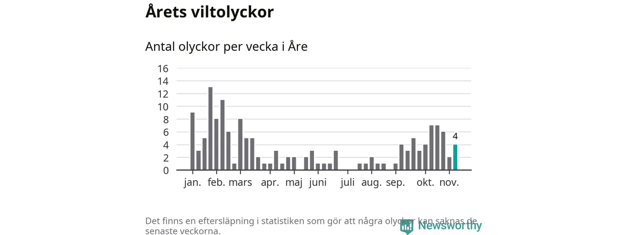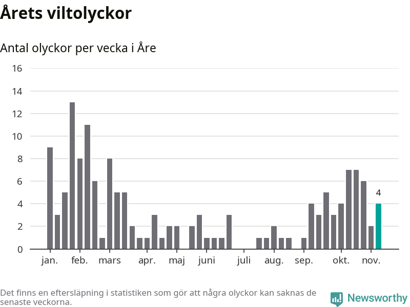 Hittills har fyra viltolyckor rapporterats in i Åre kommun från vecka 46. Se listan här.