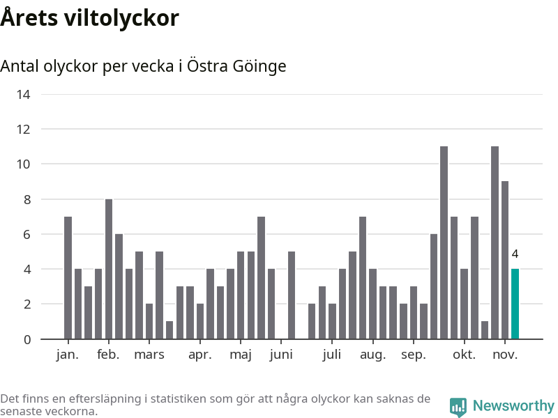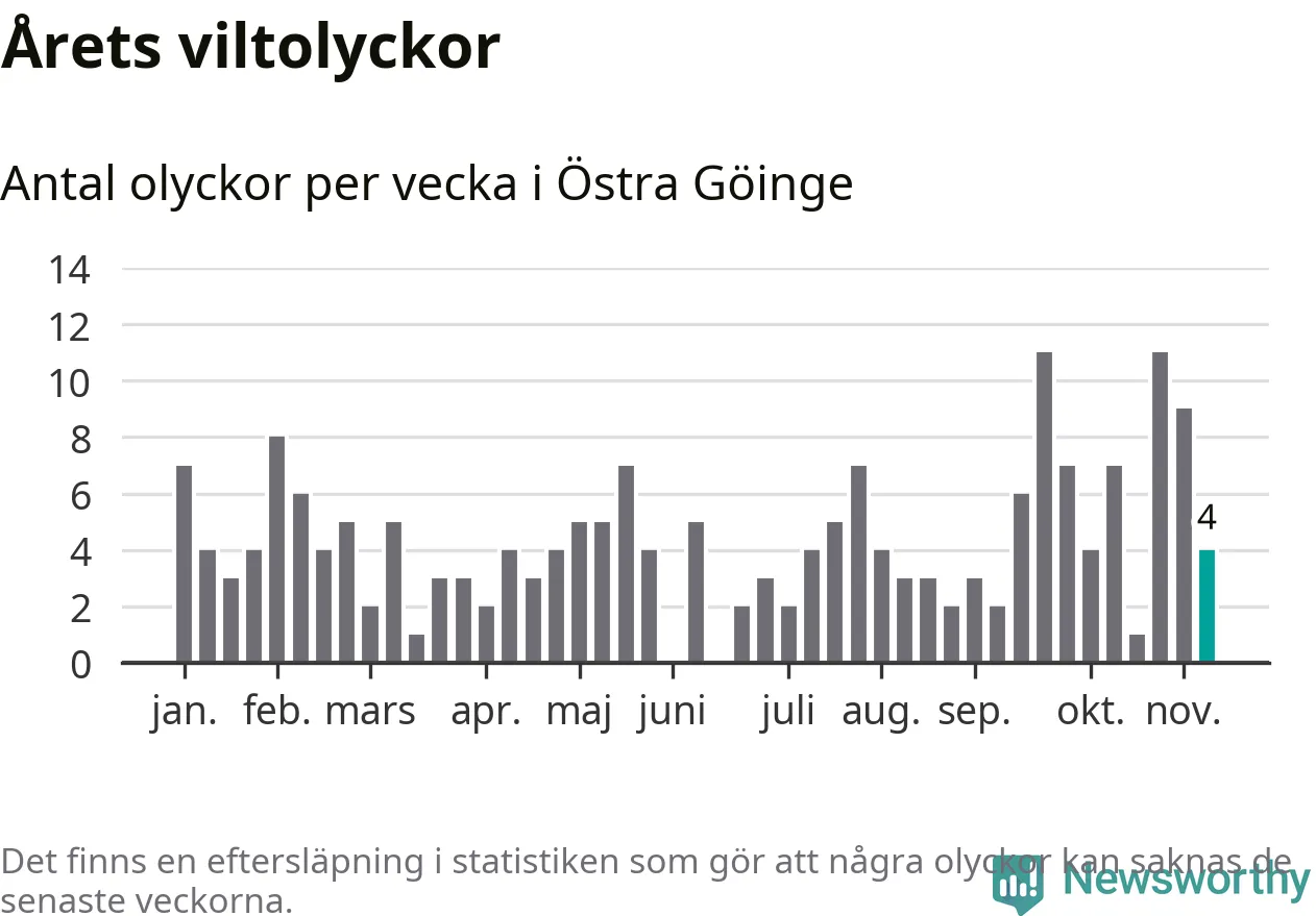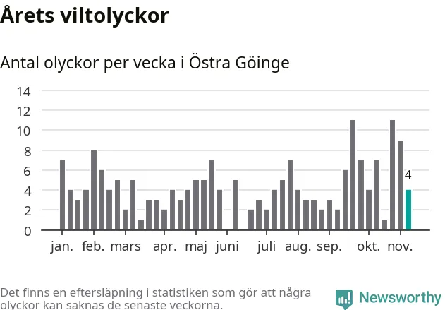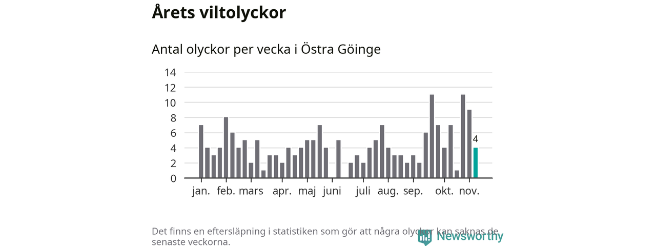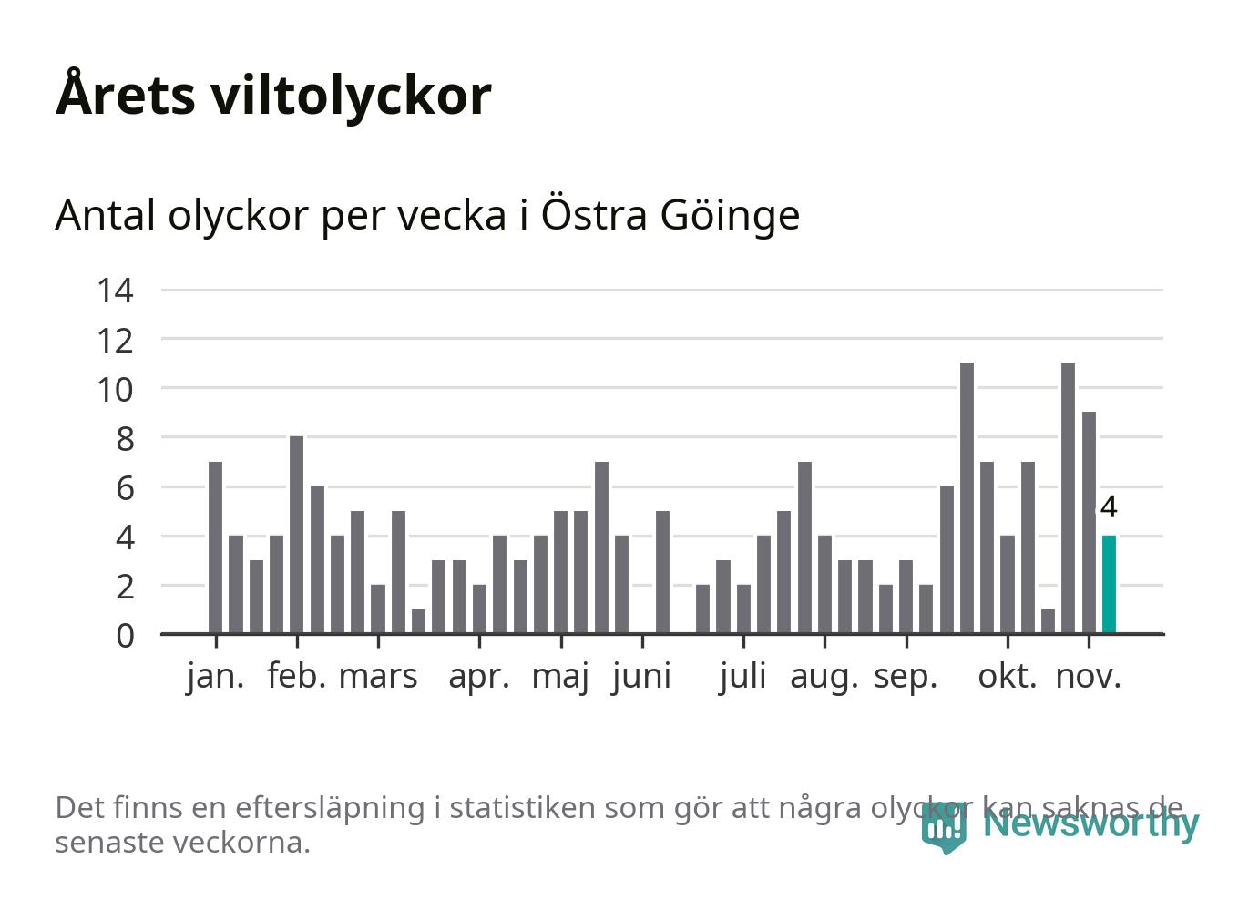 Hittills har fyra viltolyckor rapporterats in i Östra Göinge kommun från vecka 46. Se listan här.
