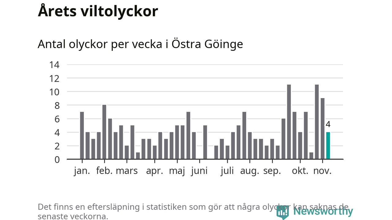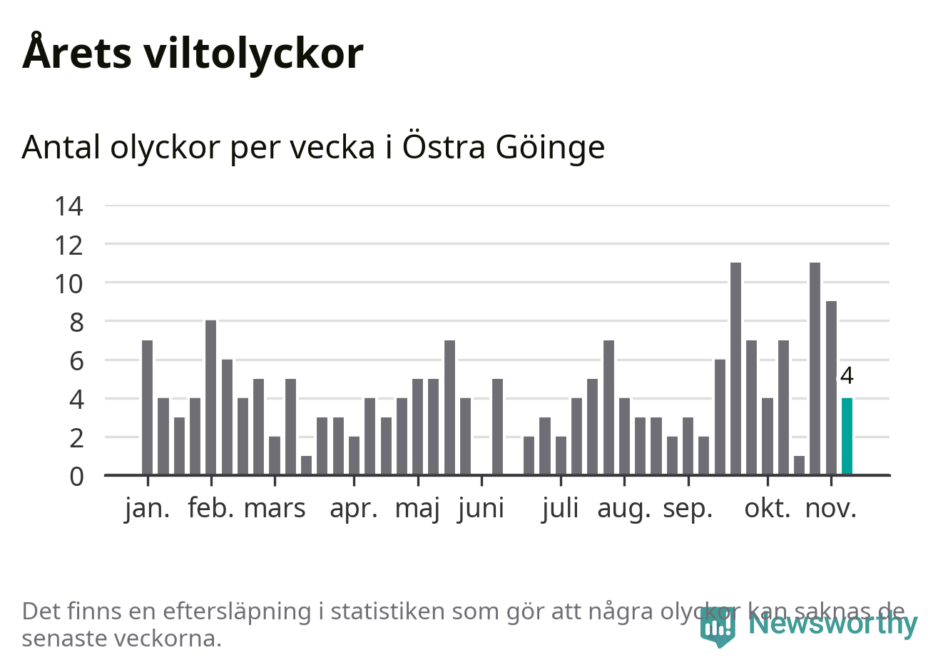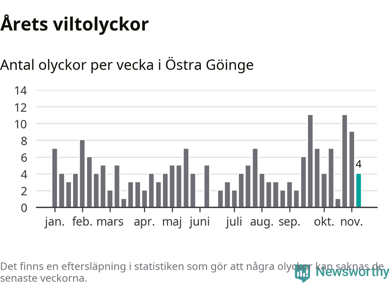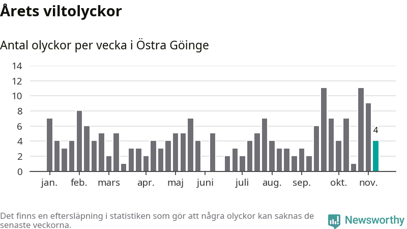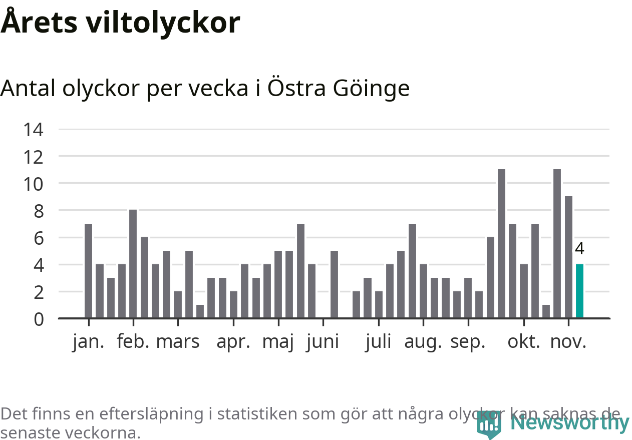 Hittills har fyra viltolyckor rapporterats in i Östra Göinge kommun från vecka 46. Se listan här.