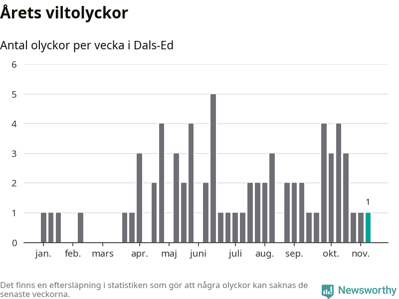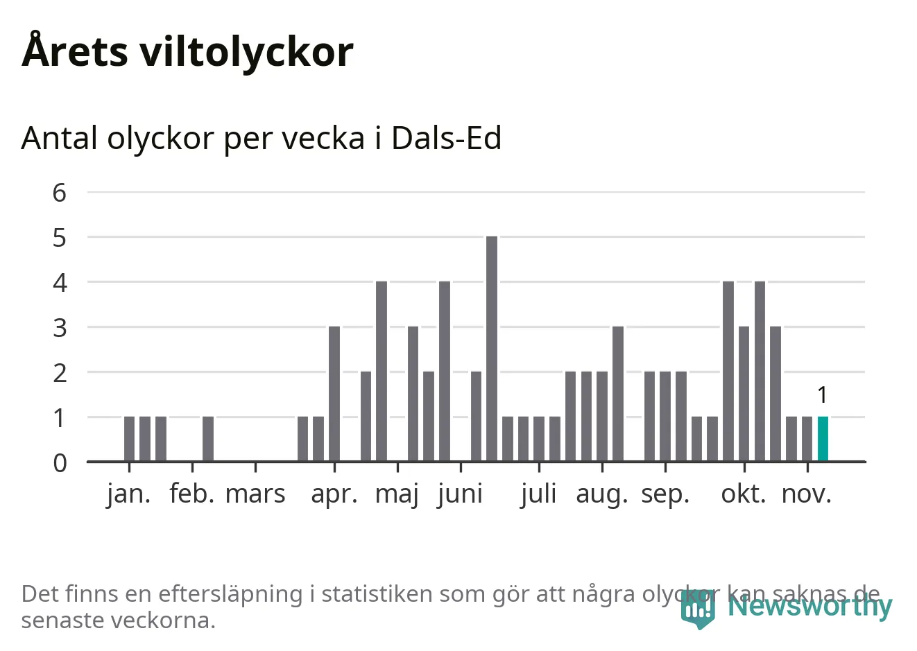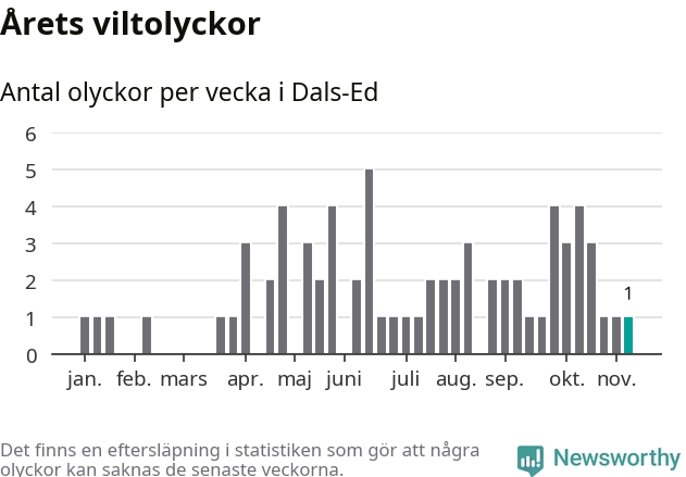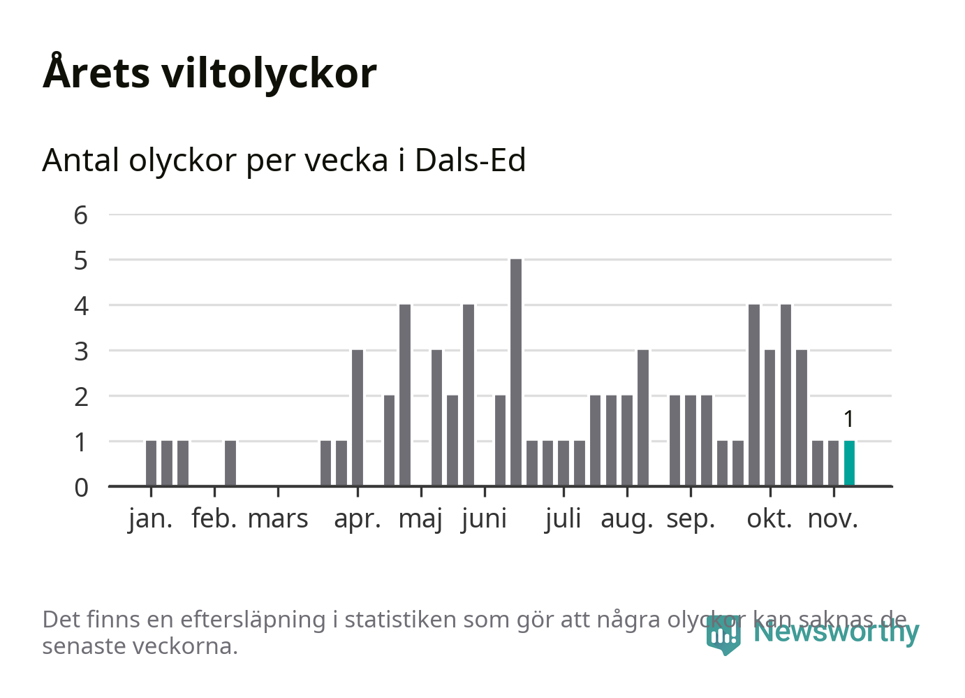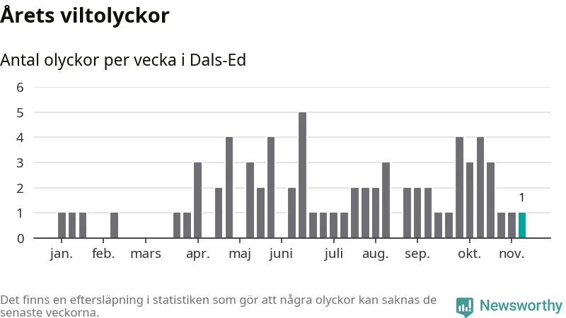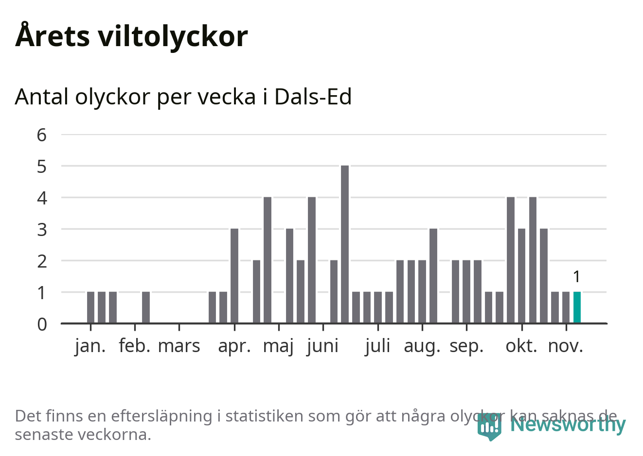 Från förra veckan (vecka 46) har hittills en viltolycka rapporterats in i Dals-Eds kommun.