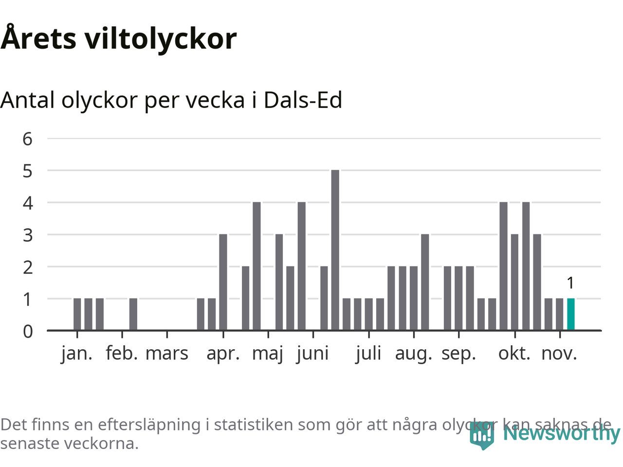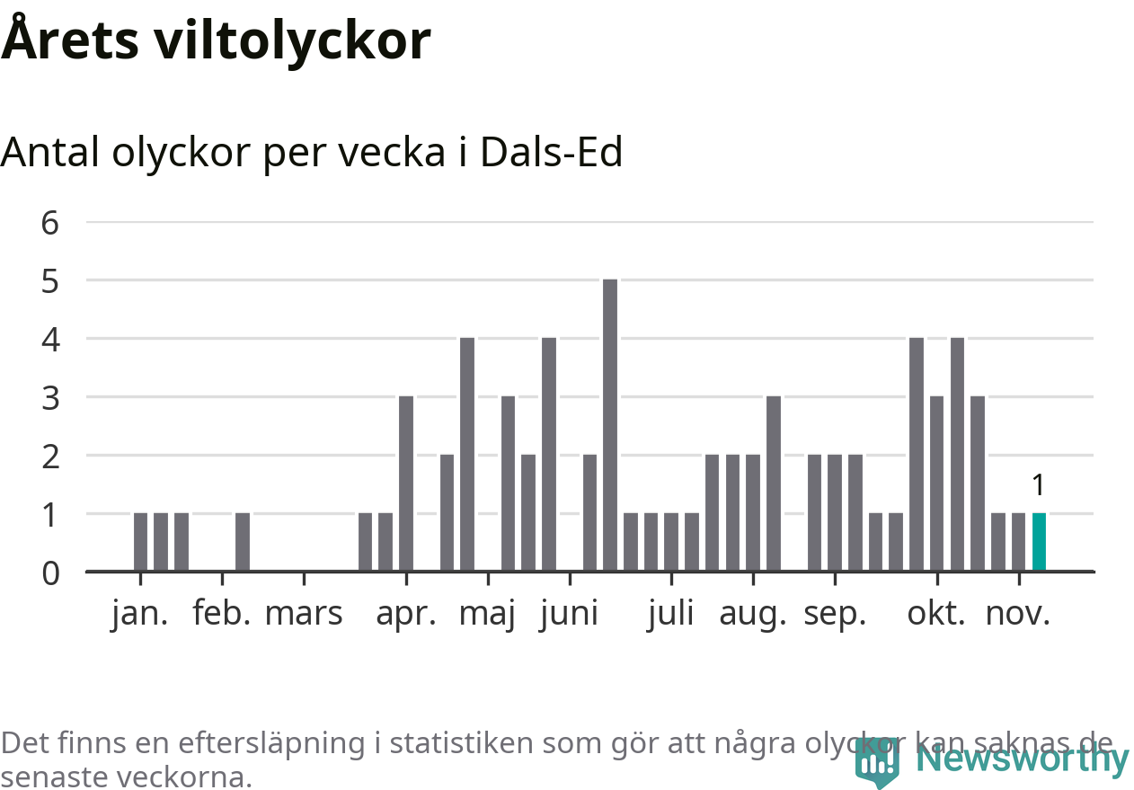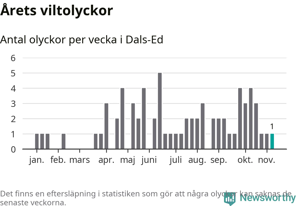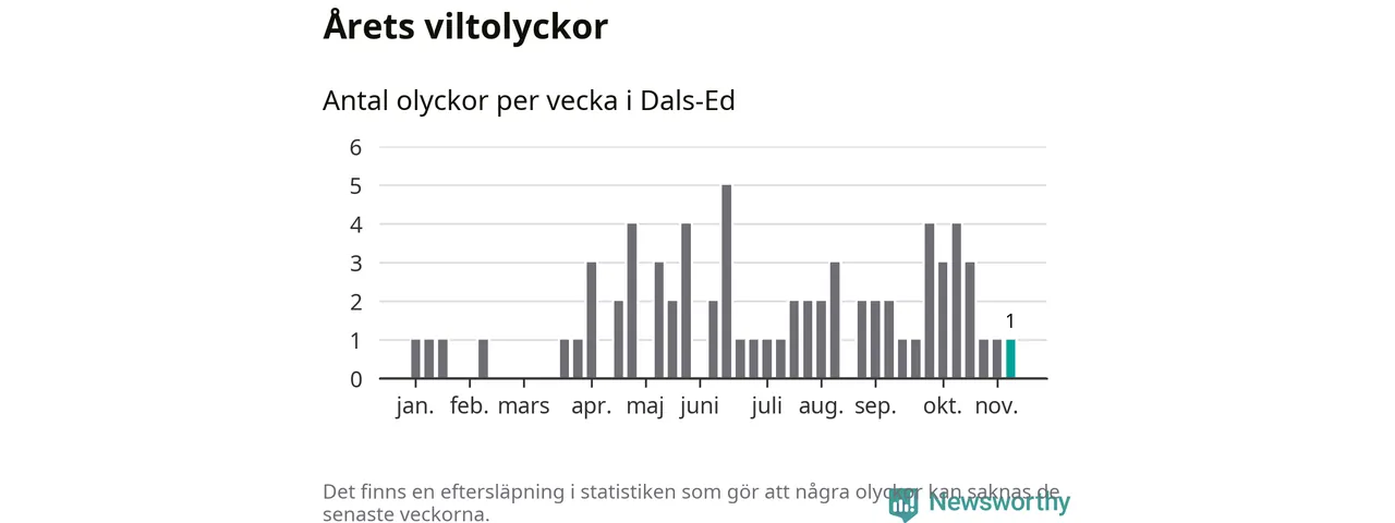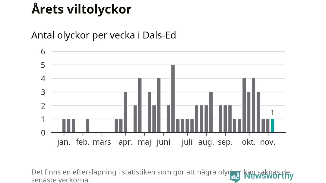 Från förra veckan (vecka 46) har hittills en viltolycka rapporterats in i Dals-Eds kommun.