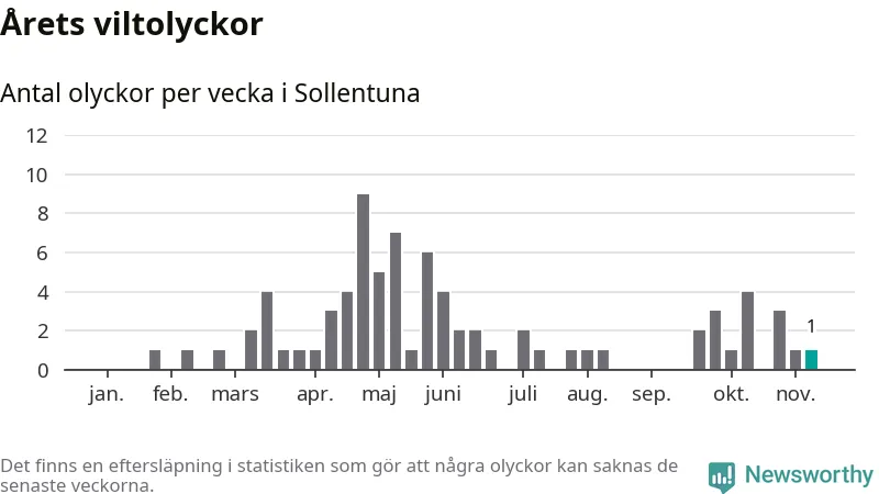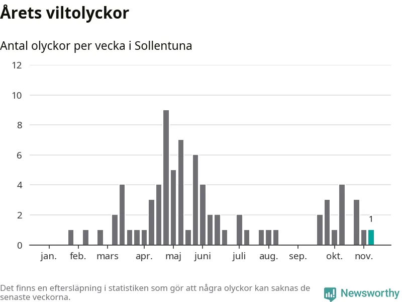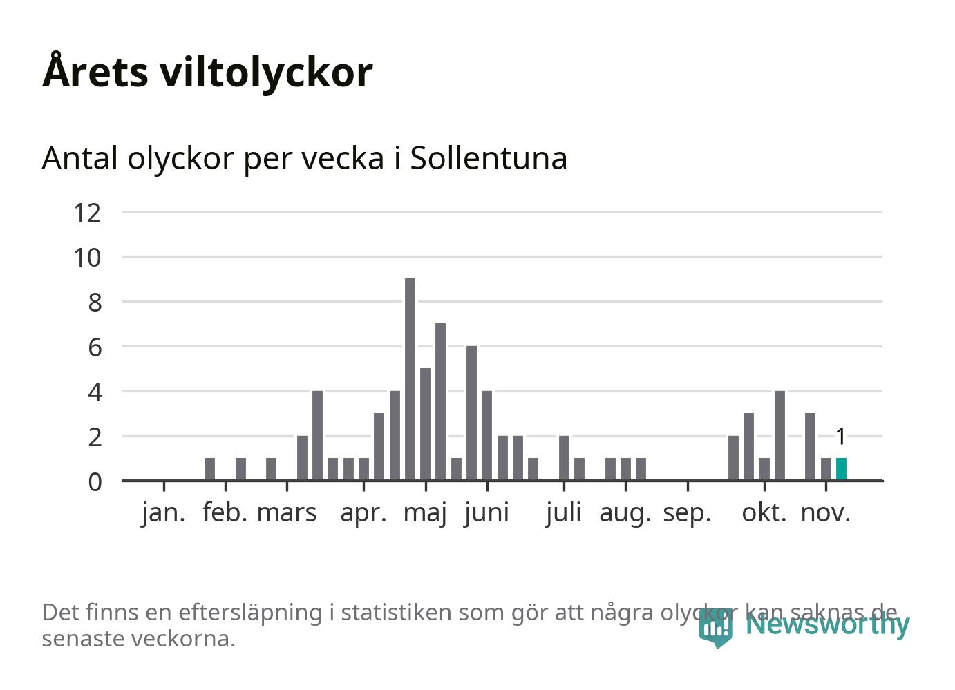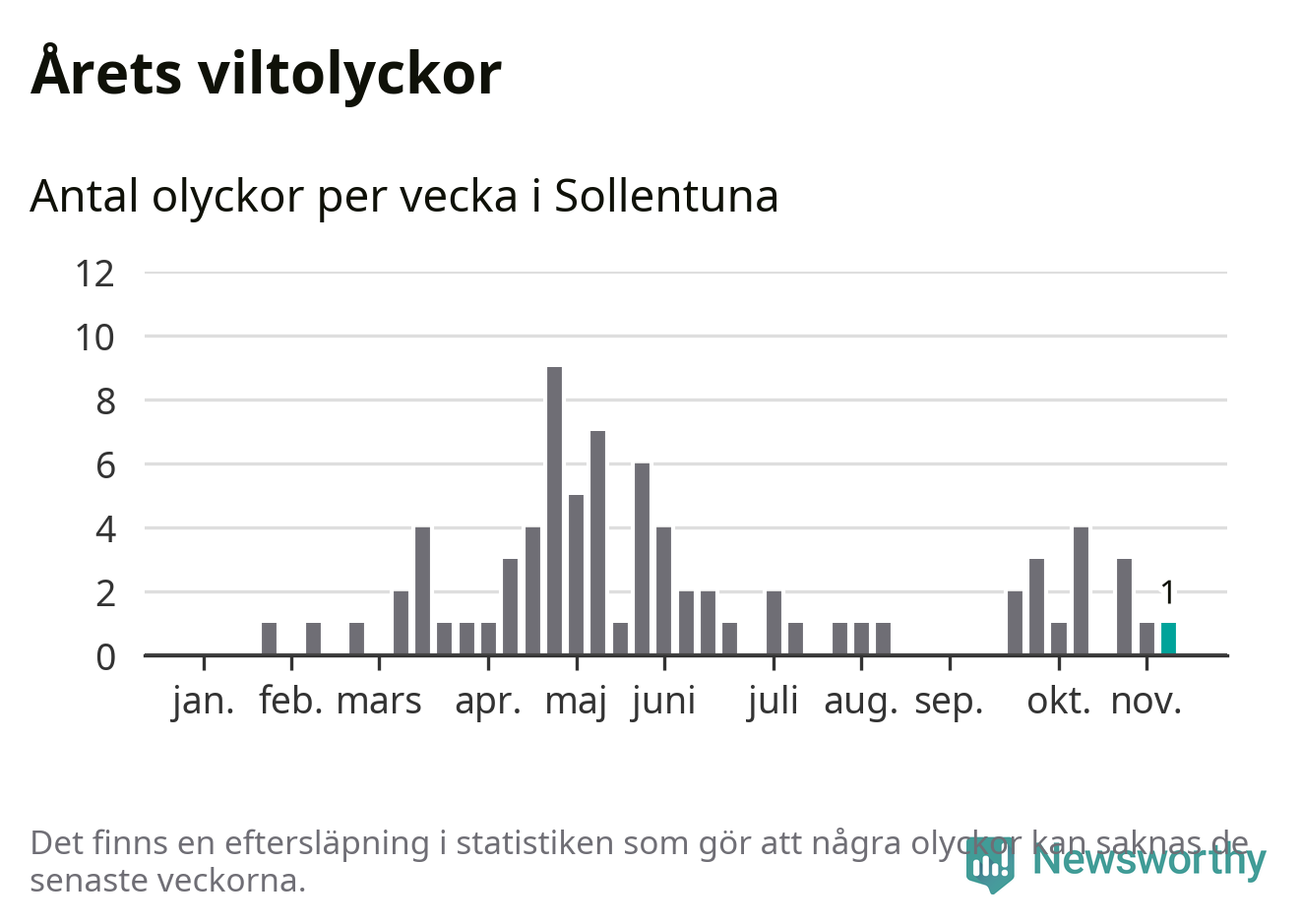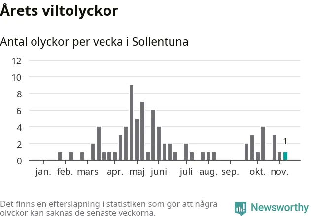 Från förra veckan (vecka 46) har hittills en viltolycka rapporterats in i Sollentuna kommun.