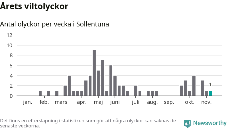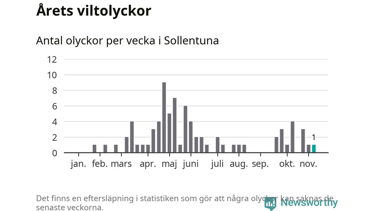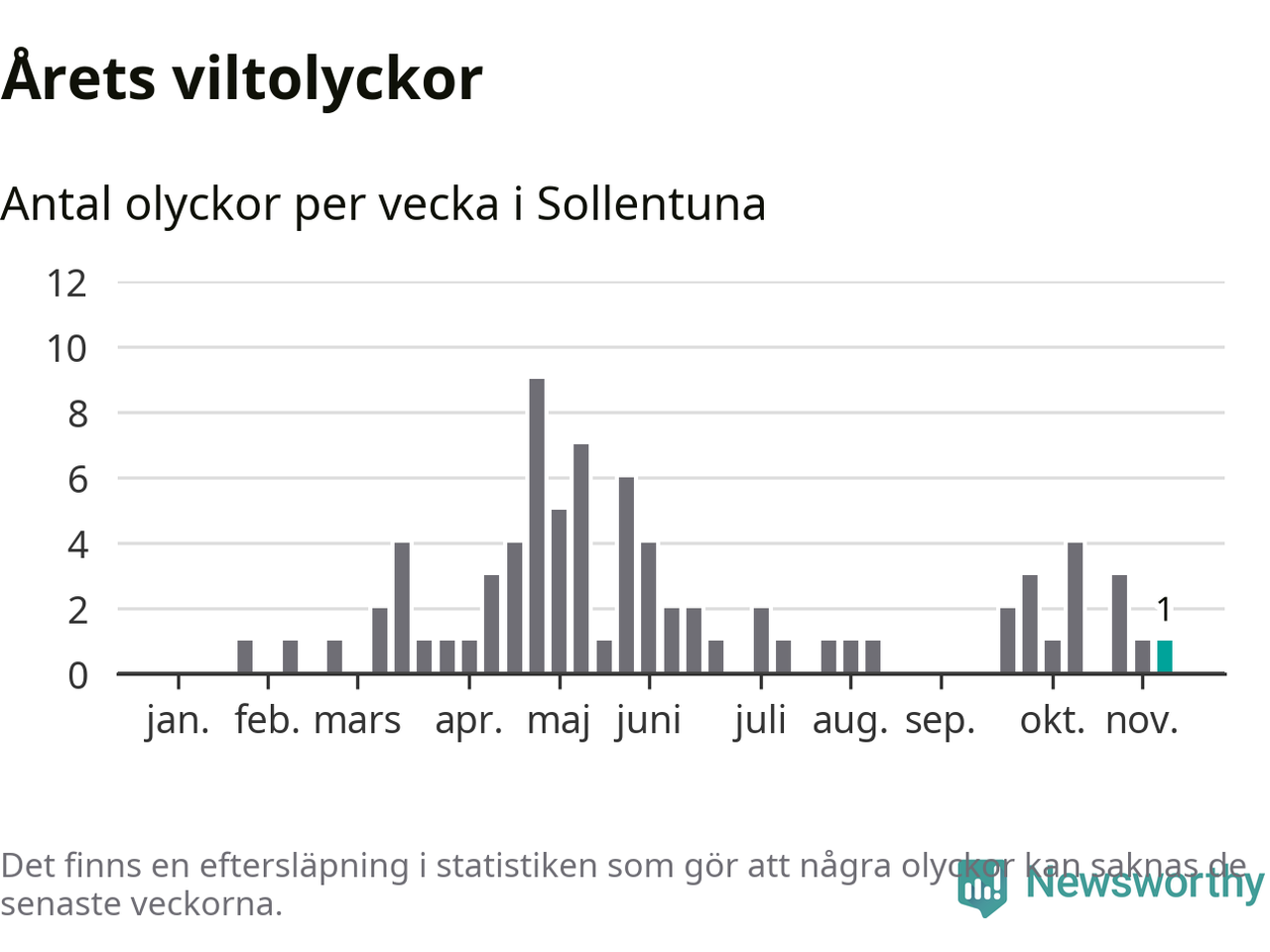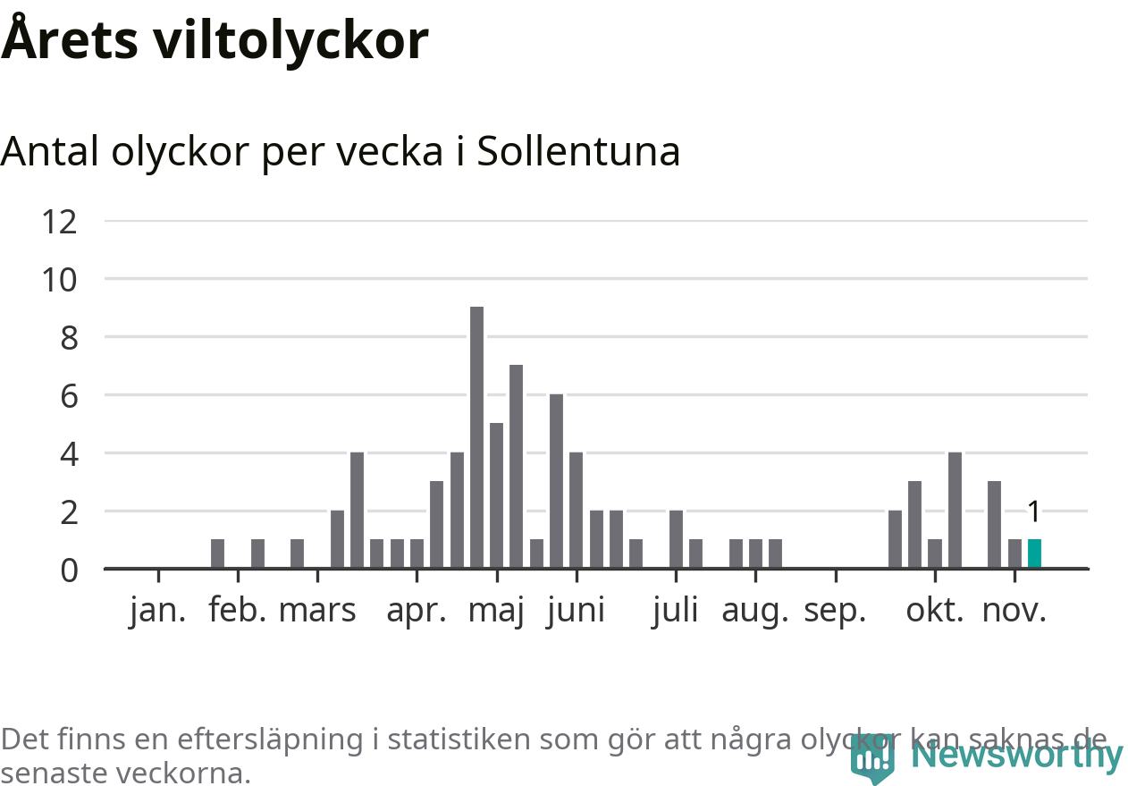 Från förra veckan (vecka 46) har hittills en viltolycka rapporterats in i Sollentuna kommun.