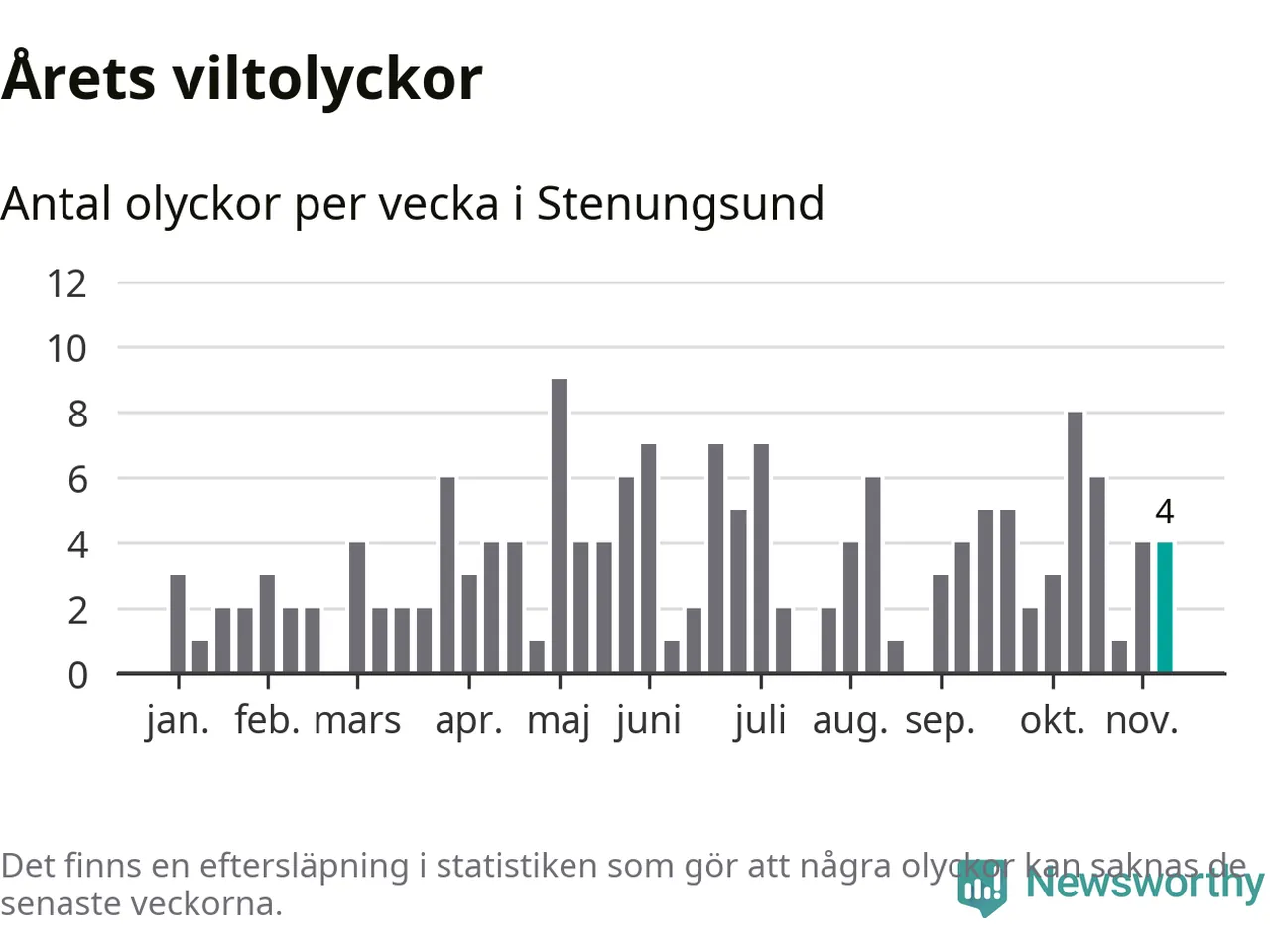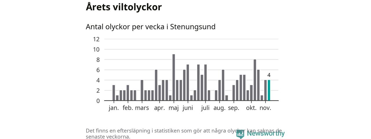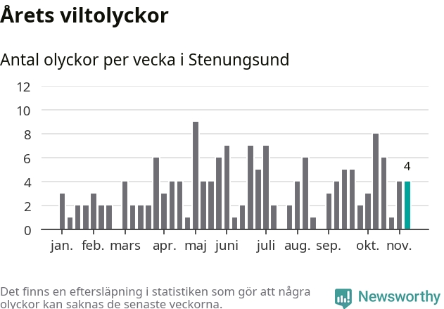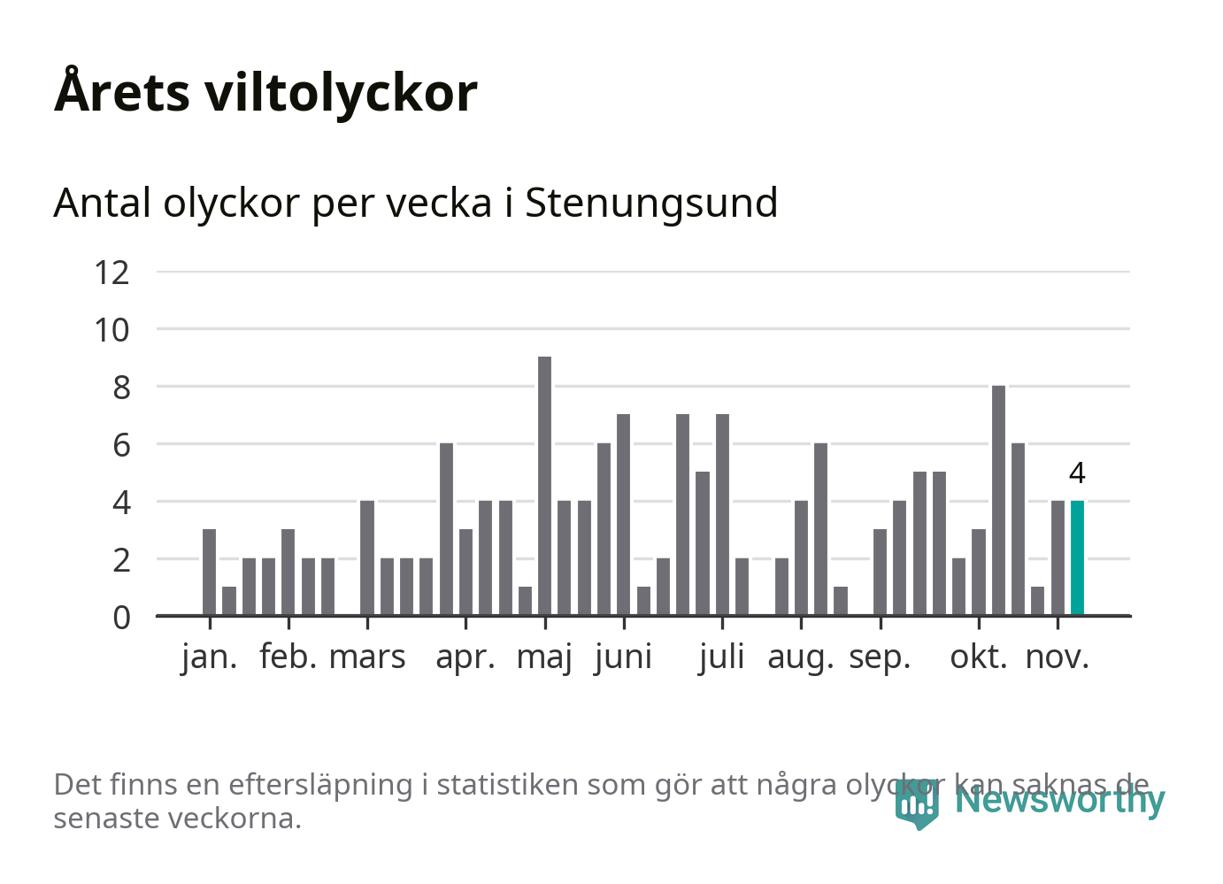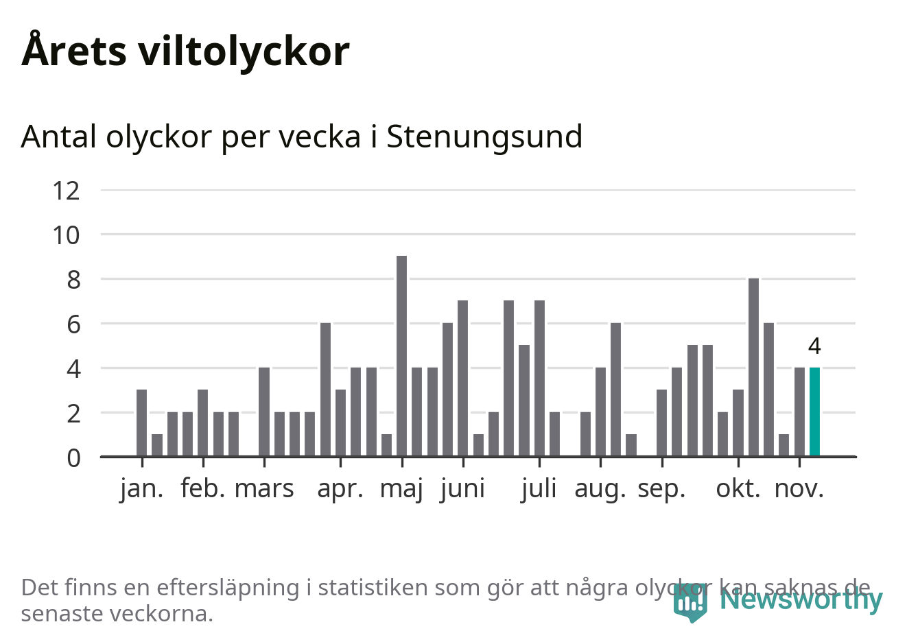 Hittills har fyra viltolyckor rapporterats in i Stenungsunds kommun från vecka 46. Se listan här.
