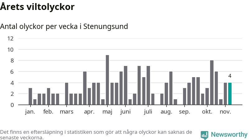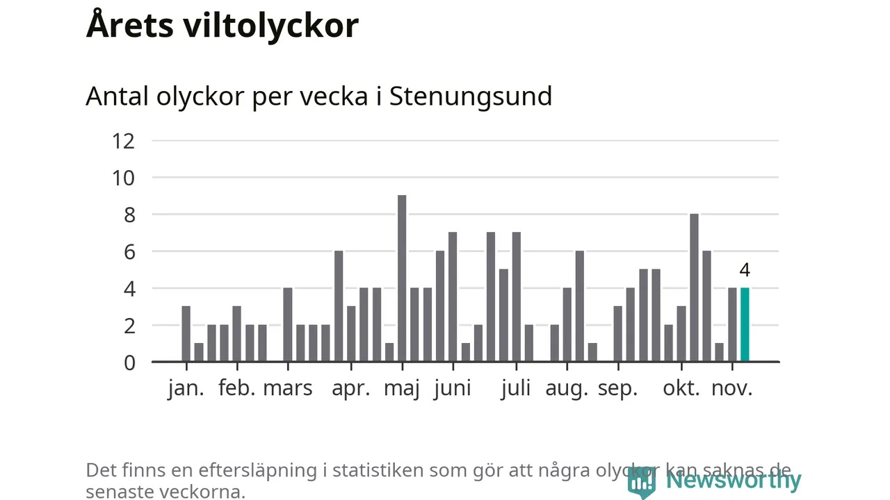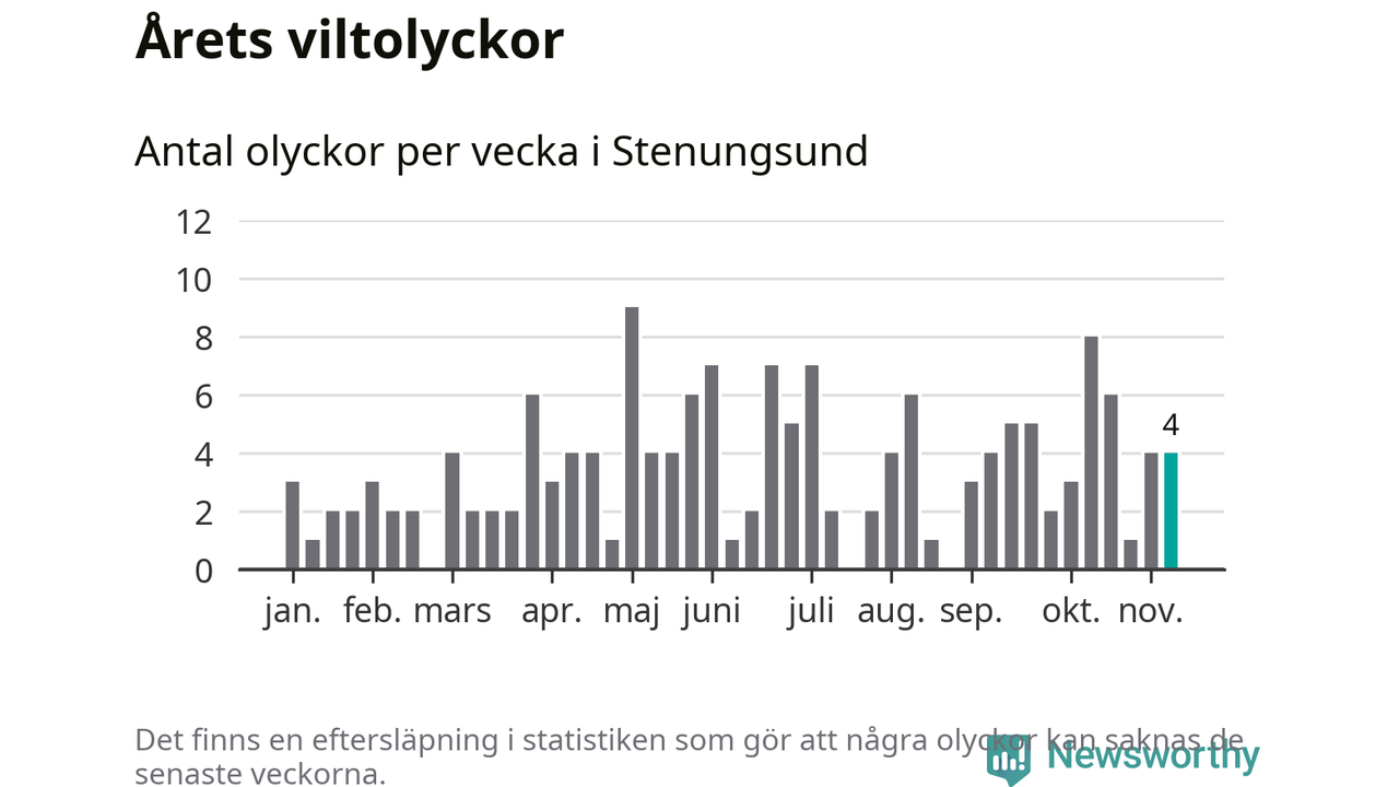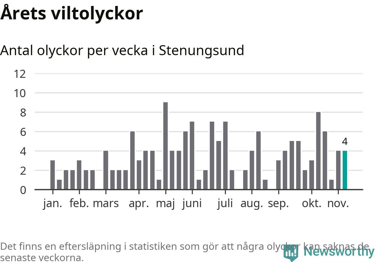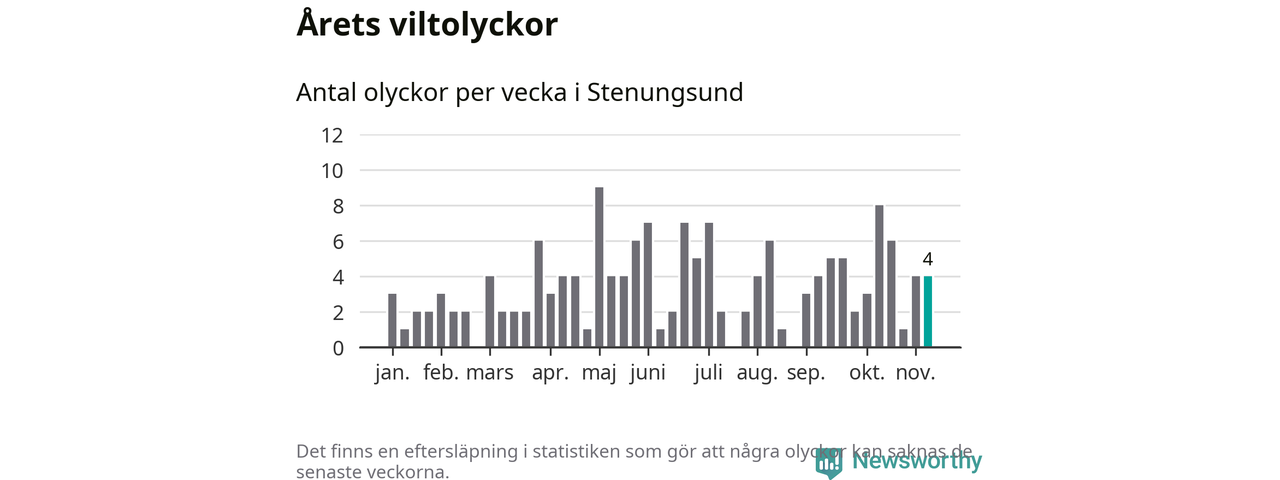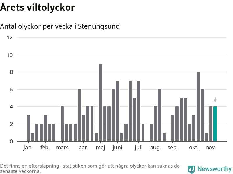 Hittills har fyra viltolyckor rapporterats in i Stenungsunds kommun från vecka 46. Se listan här.
