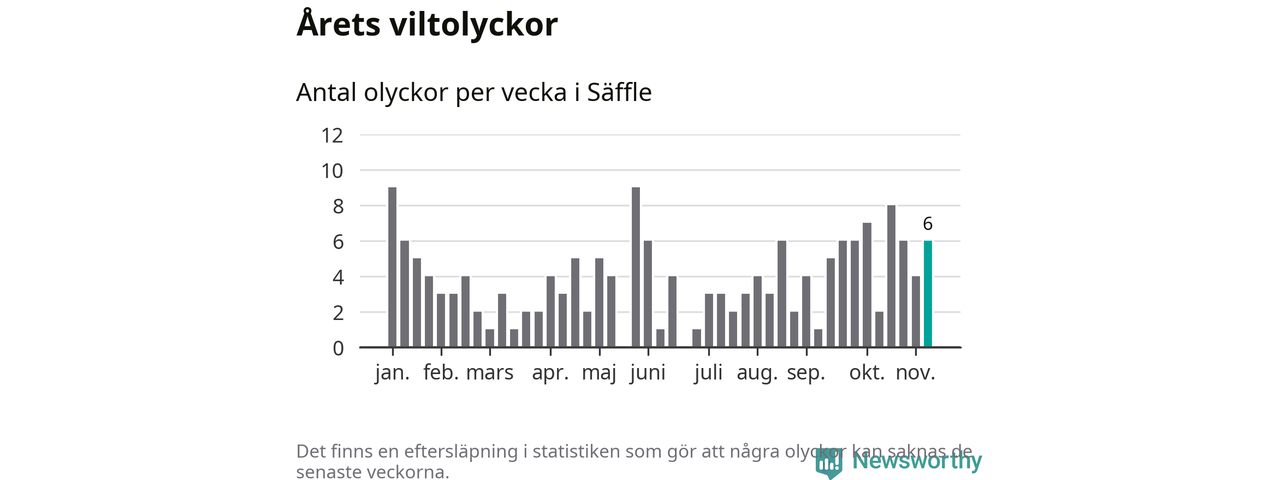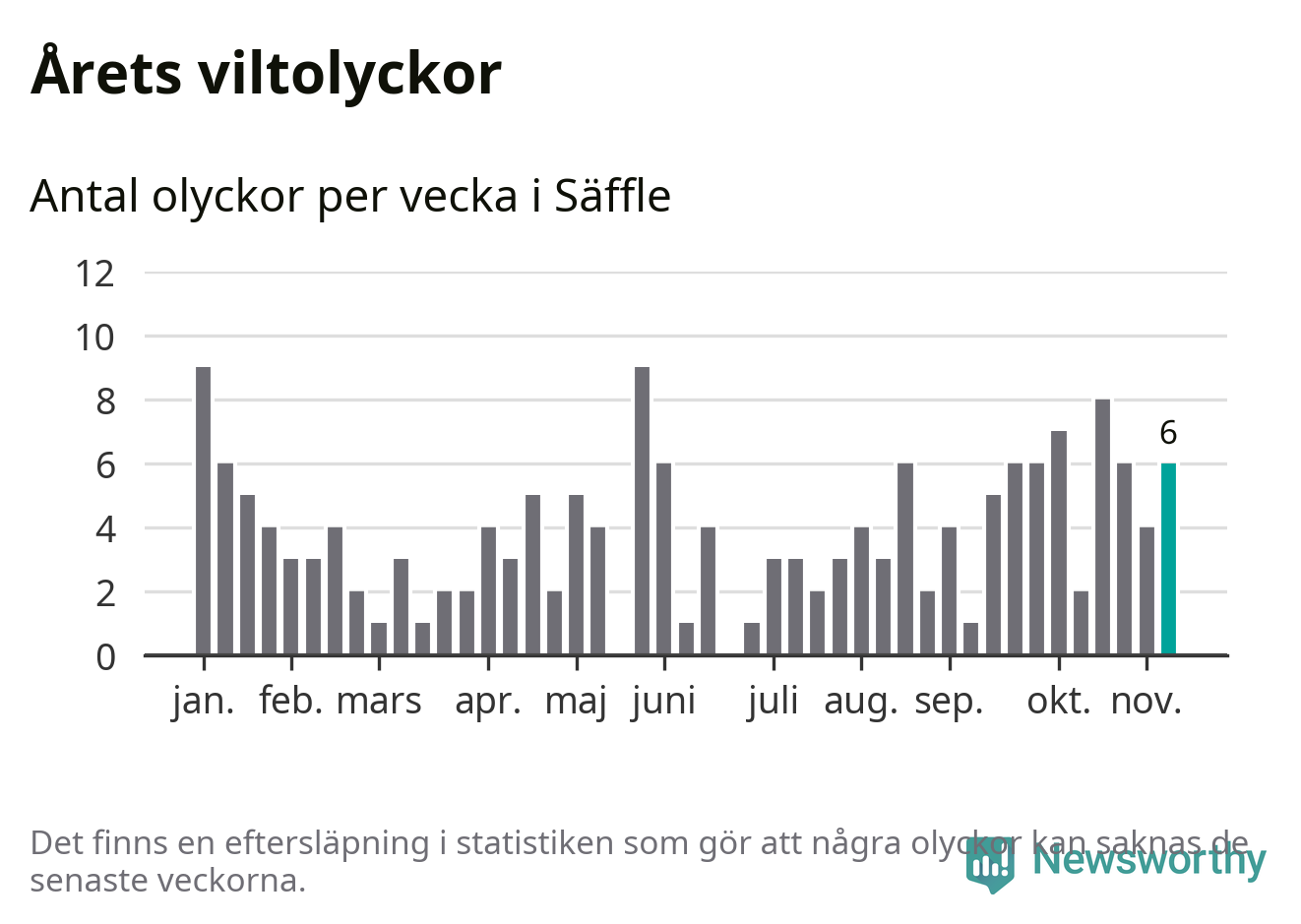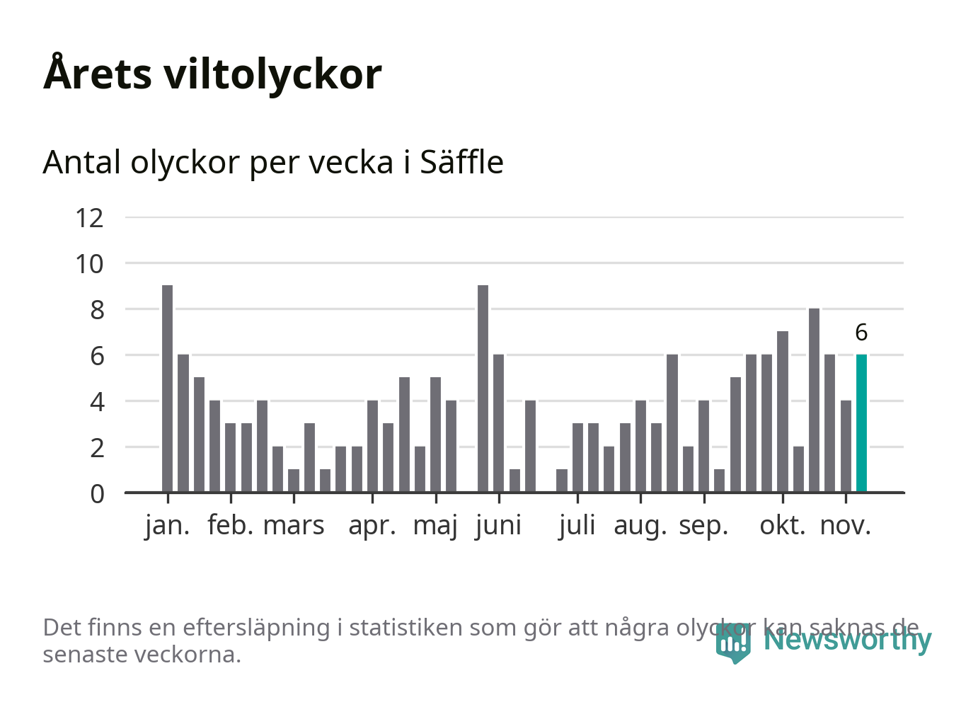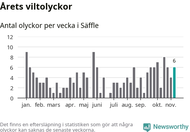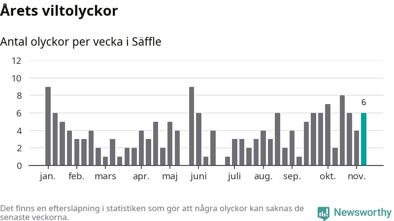 Hittills har sex viltolyckor rapporterats in i Säffle kommun från vecka 46. Se listan här.