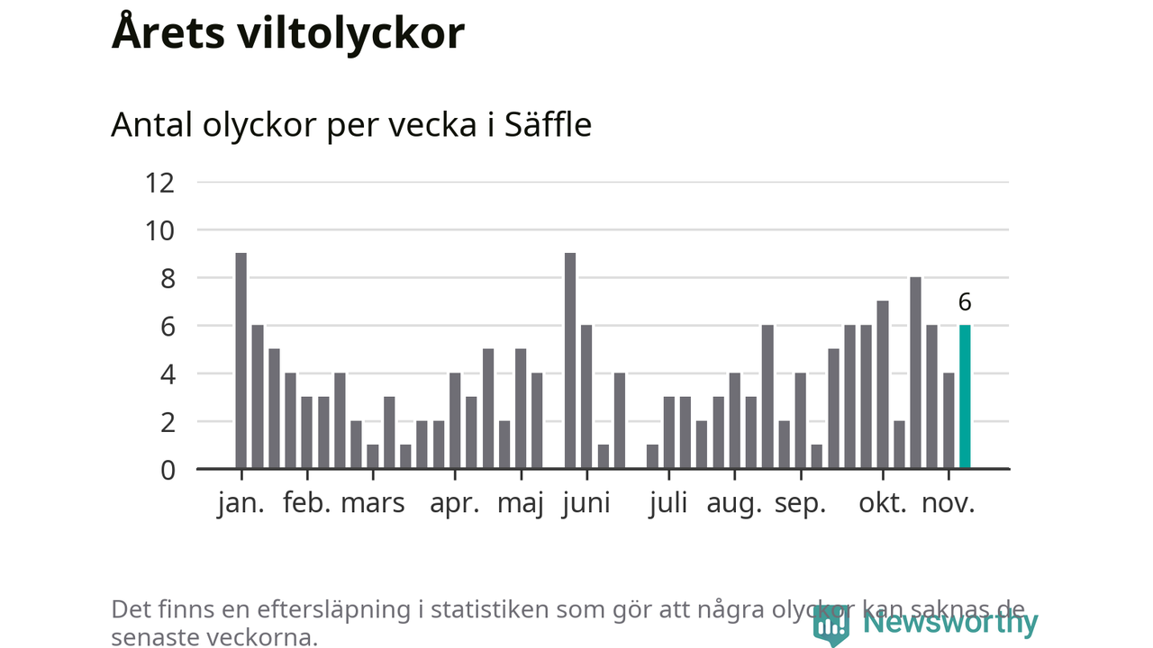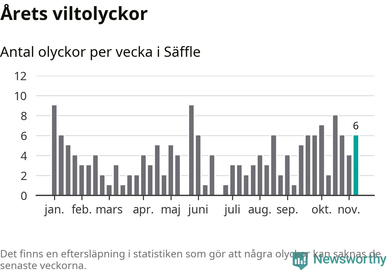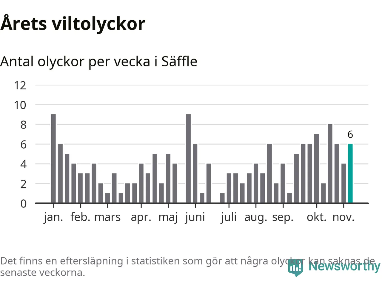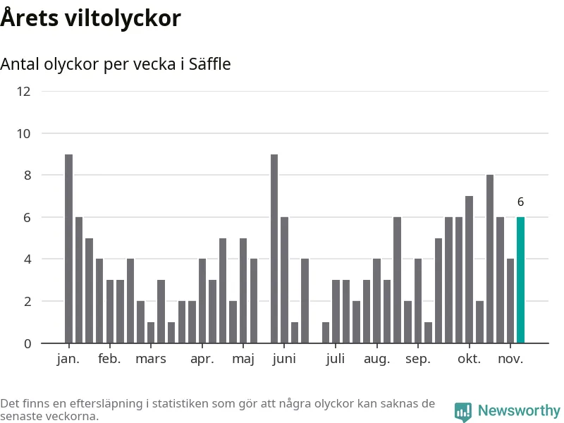 Hittills har sex viltolyckor rapporterats in i Säffle kommun från vecka 46. Se listan här.