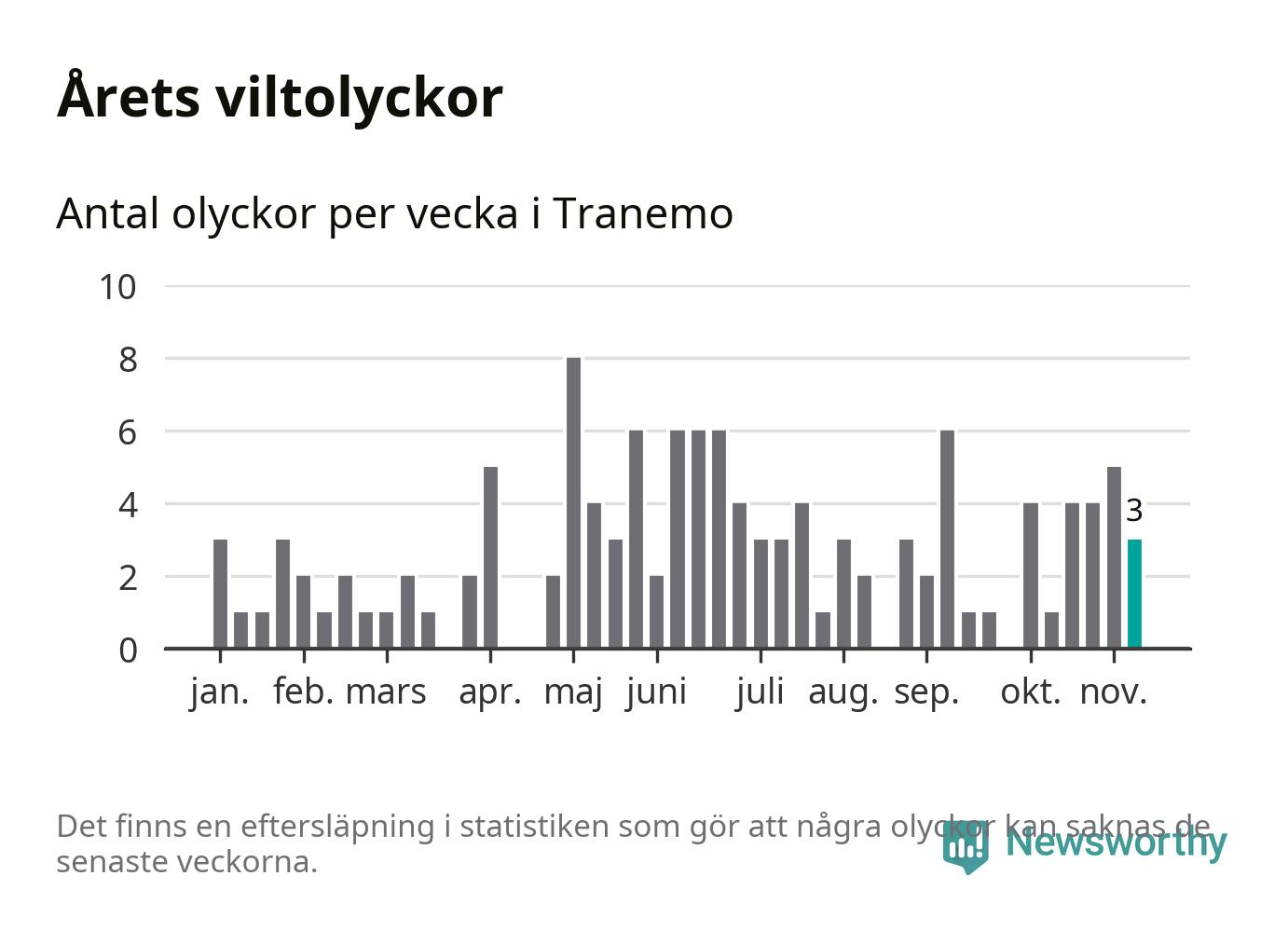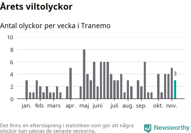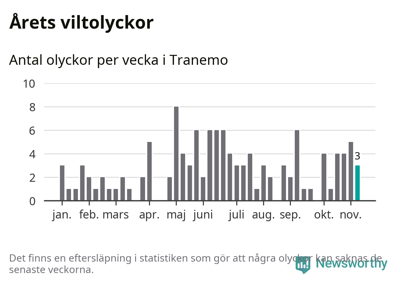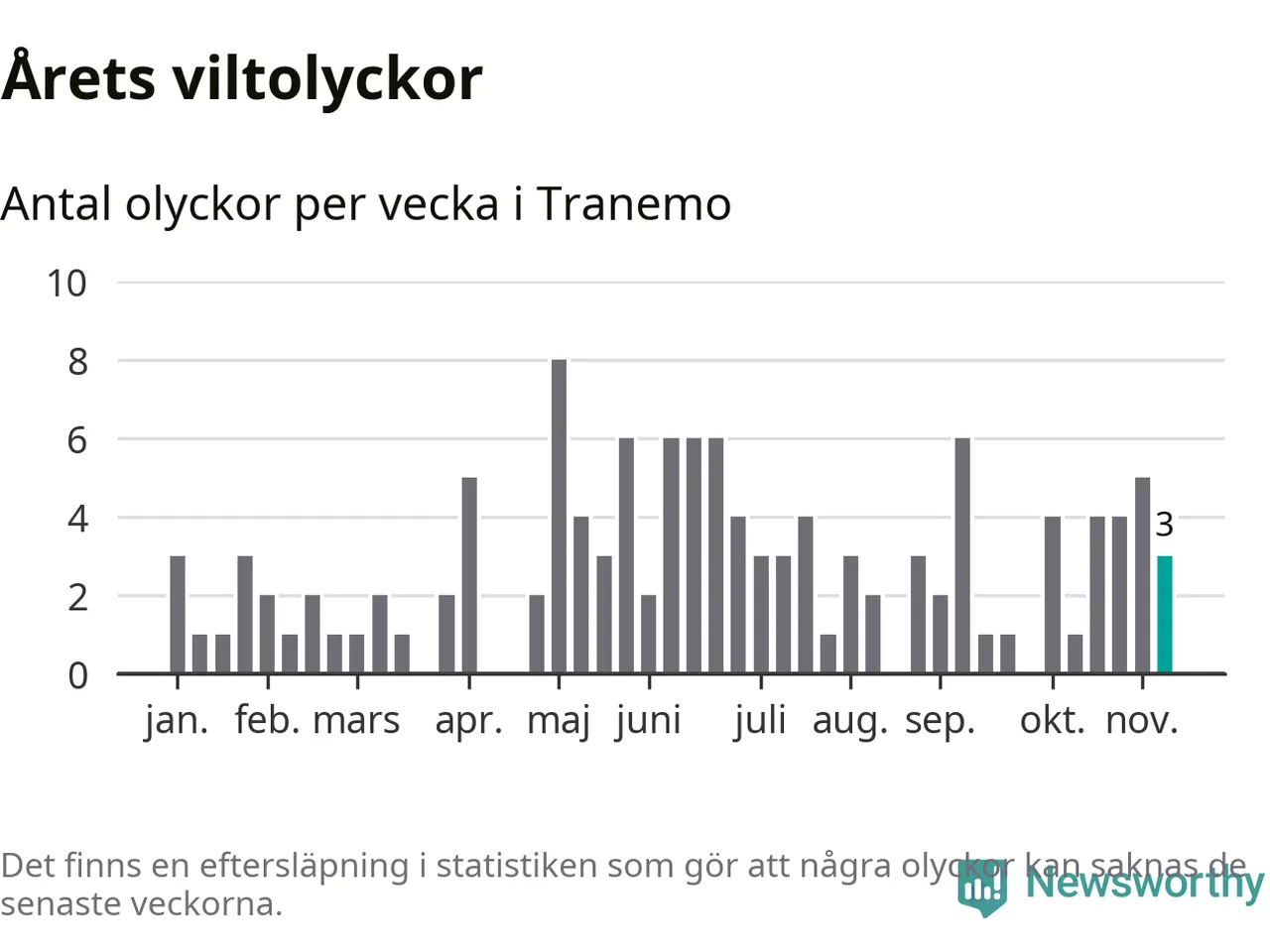 Hittills har tre viltolyckor rapporterats in i Tranemo kommun från vecka 46. Se listan här.