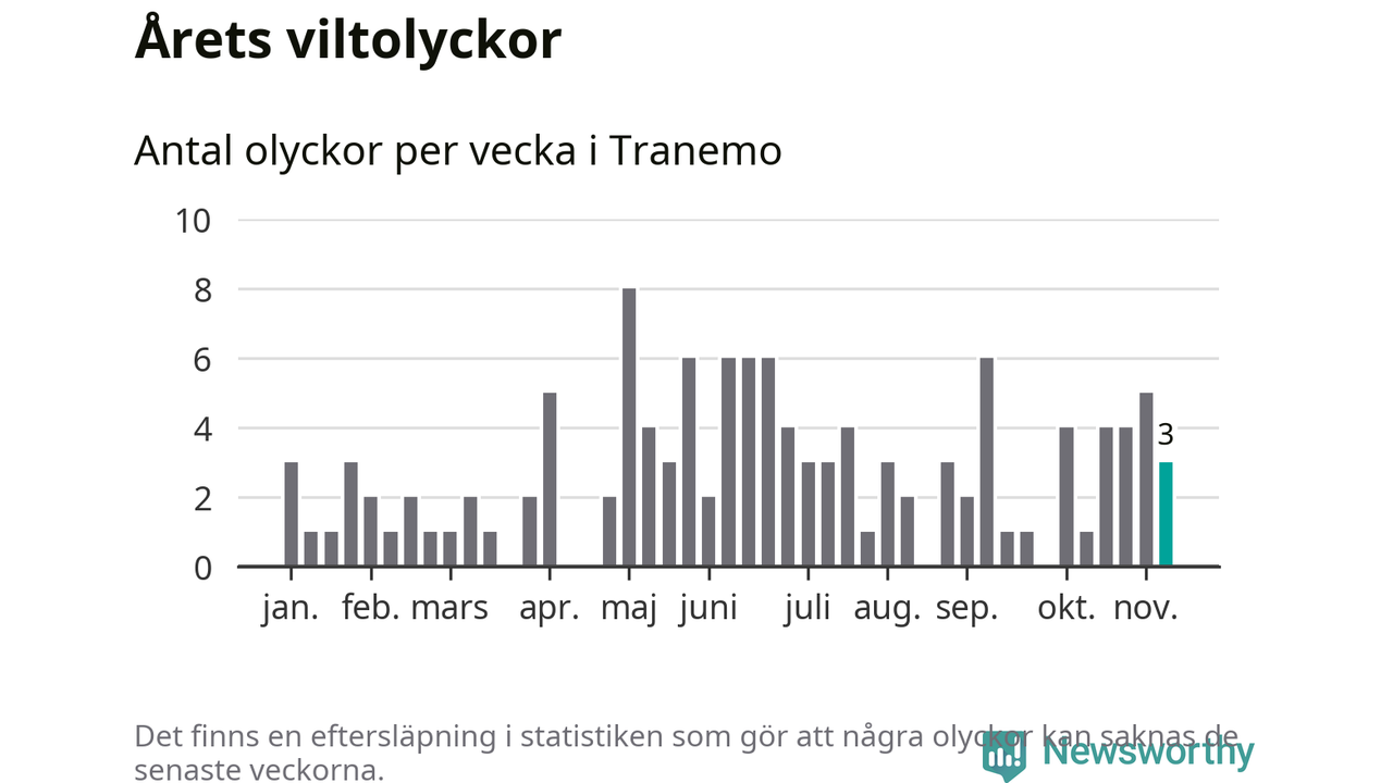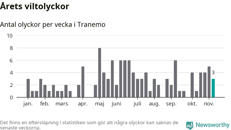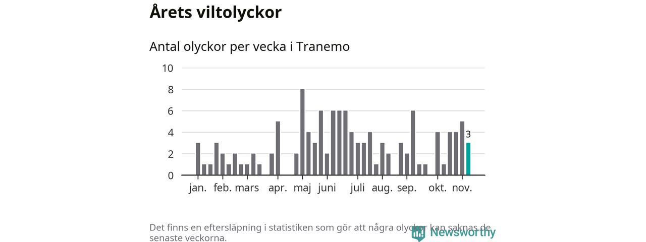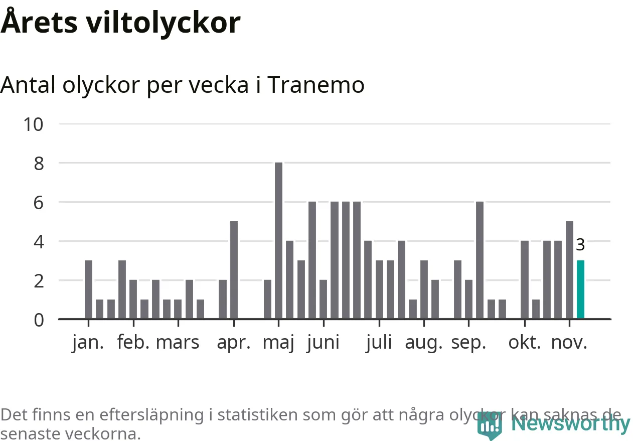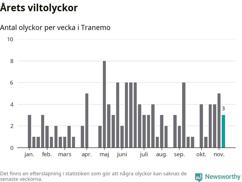 Hittills har tre viltolyckor rapporterats in i Tranemo kommun från vecka 46. Se listan här.