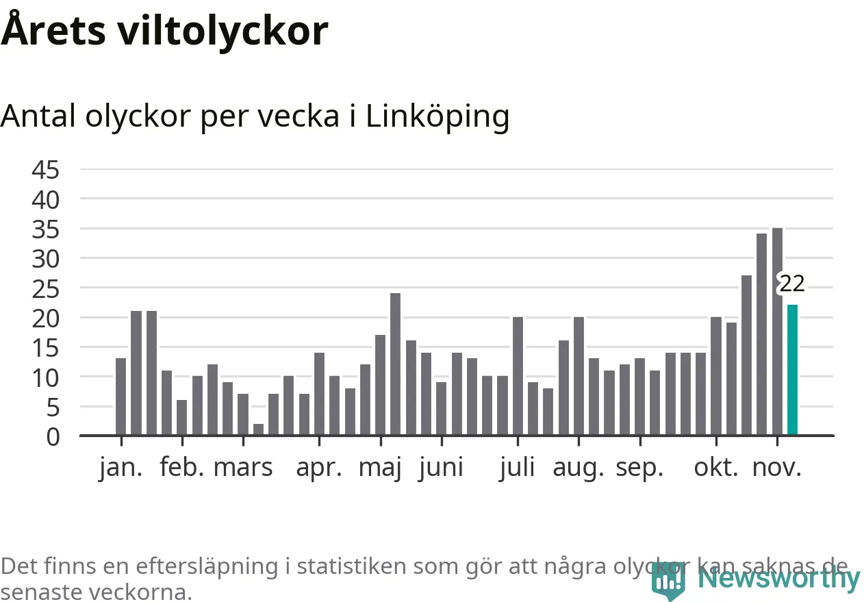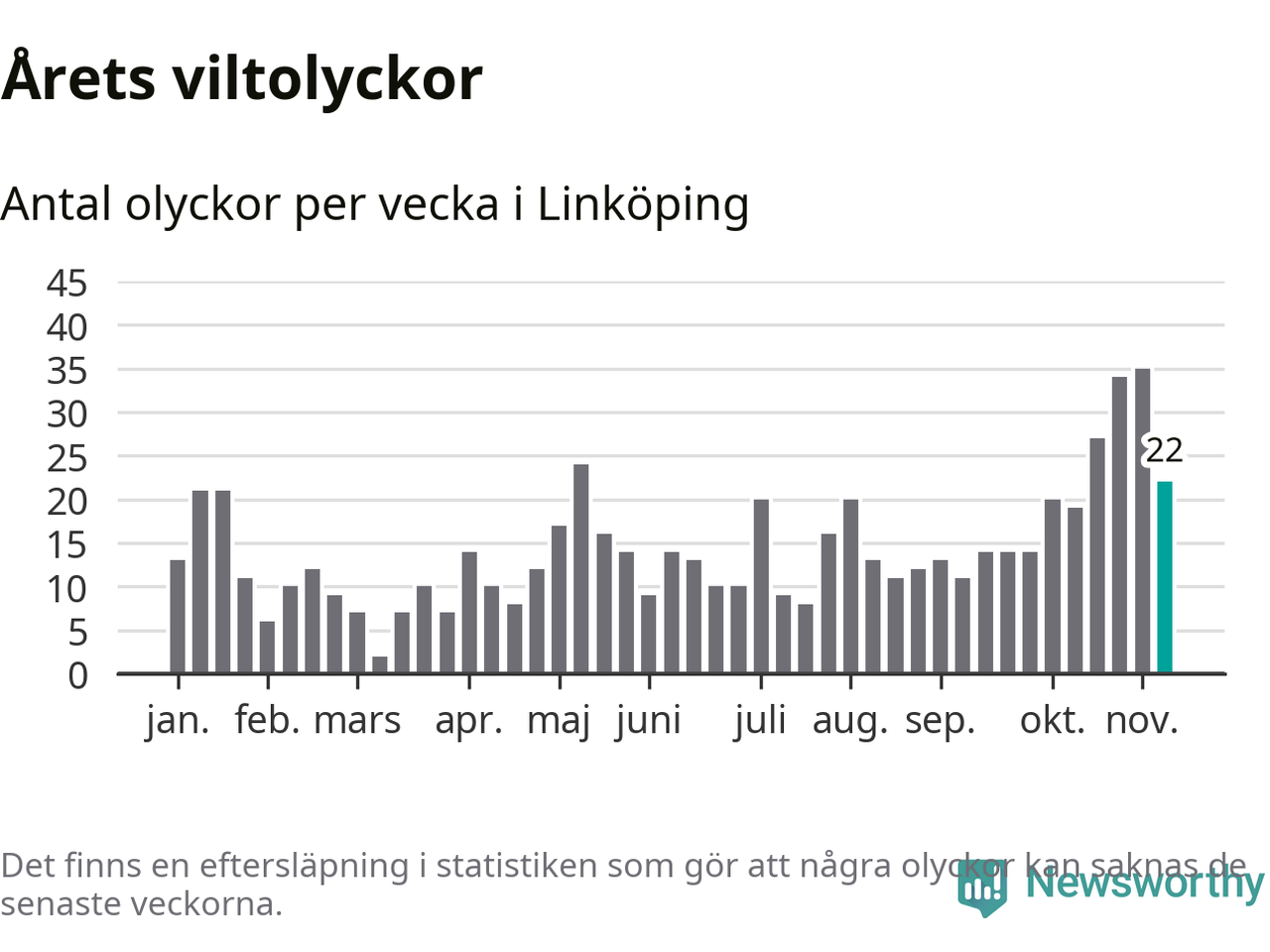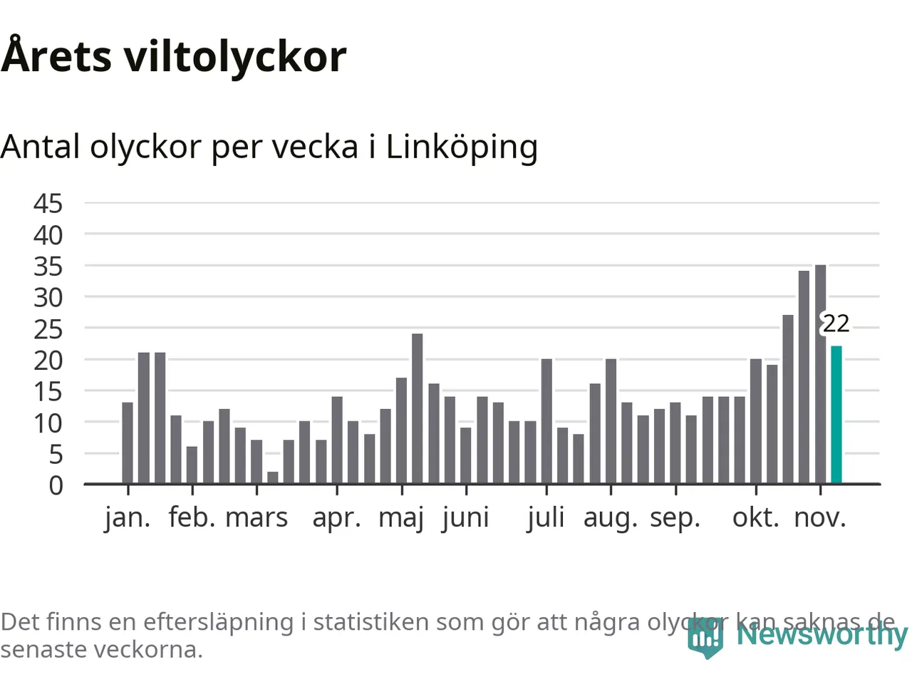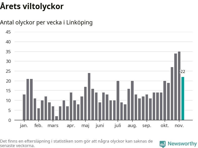 Hittills har 22 viltolyckor rapporterats in i Linköpings kommun från vecka 46. Se listan här.