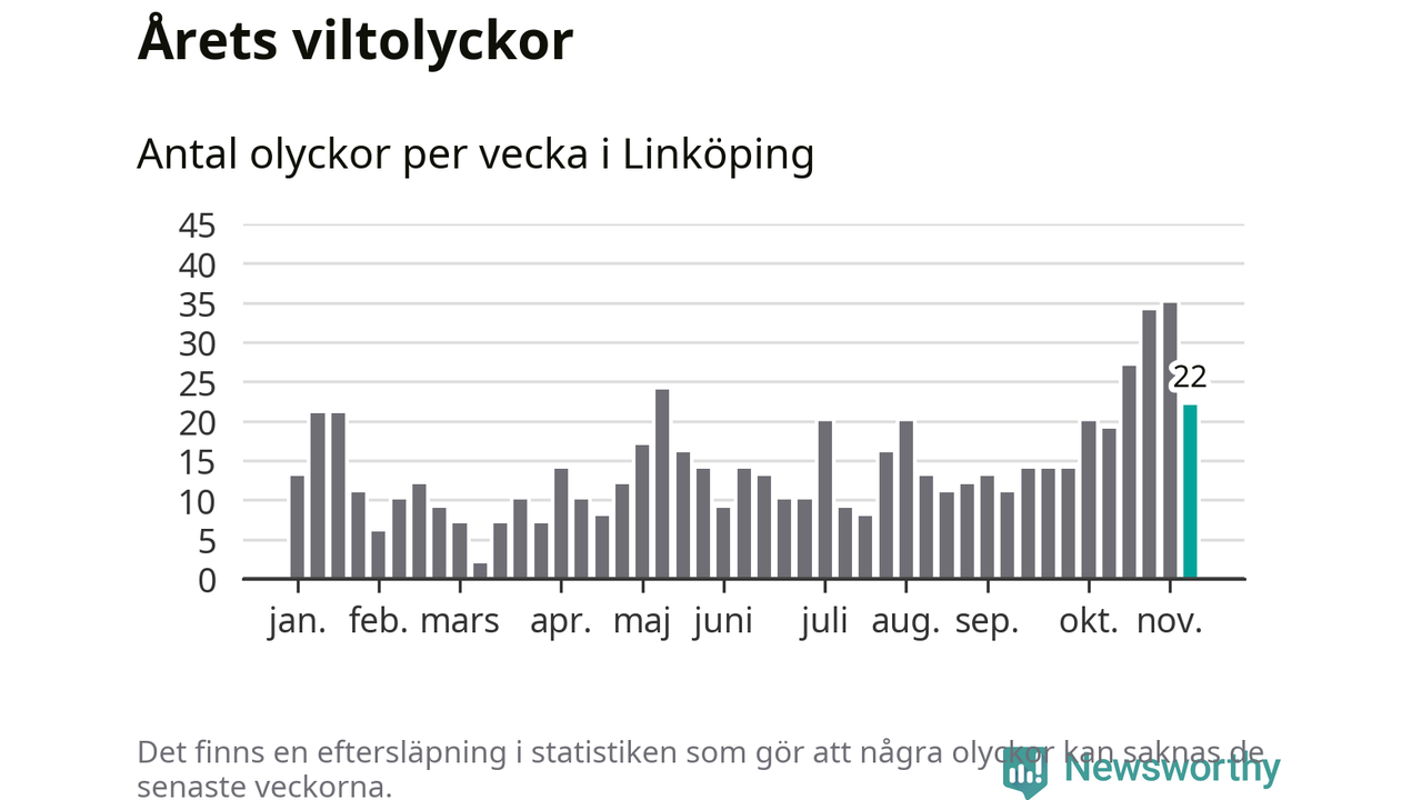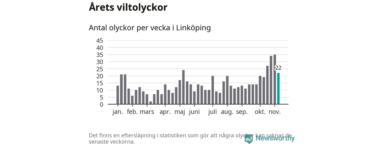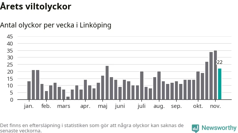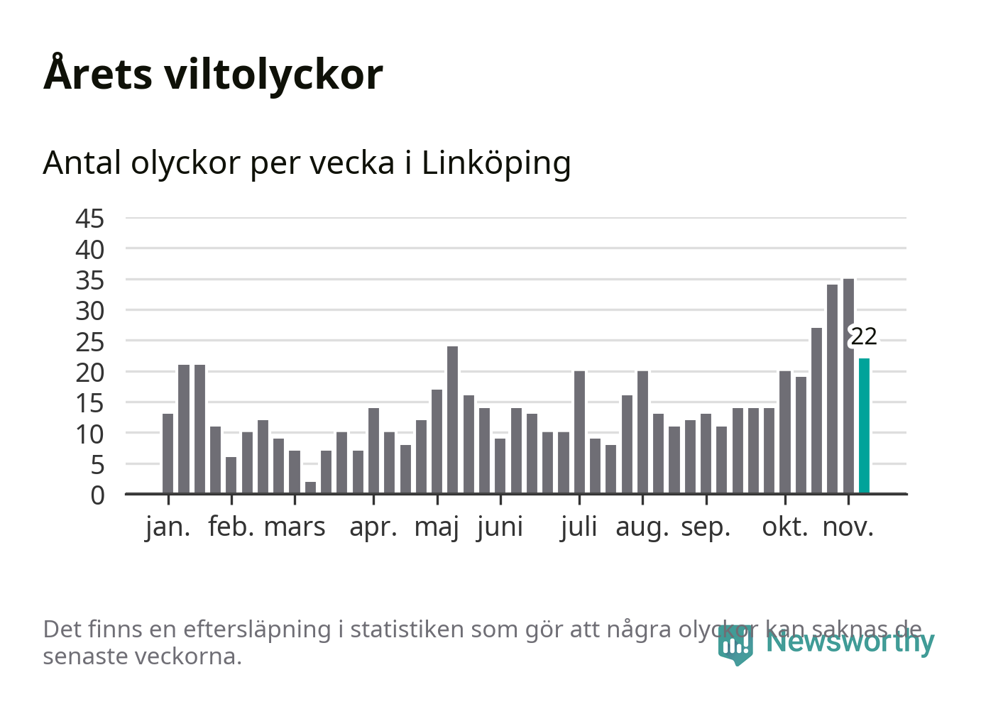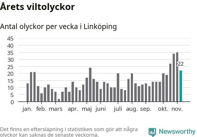 Hittills har 22 viltolyckor rapporterats in i Linköpings kommun från vecka 46. Se listan här.