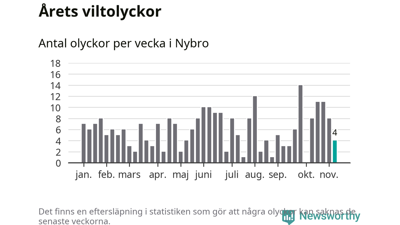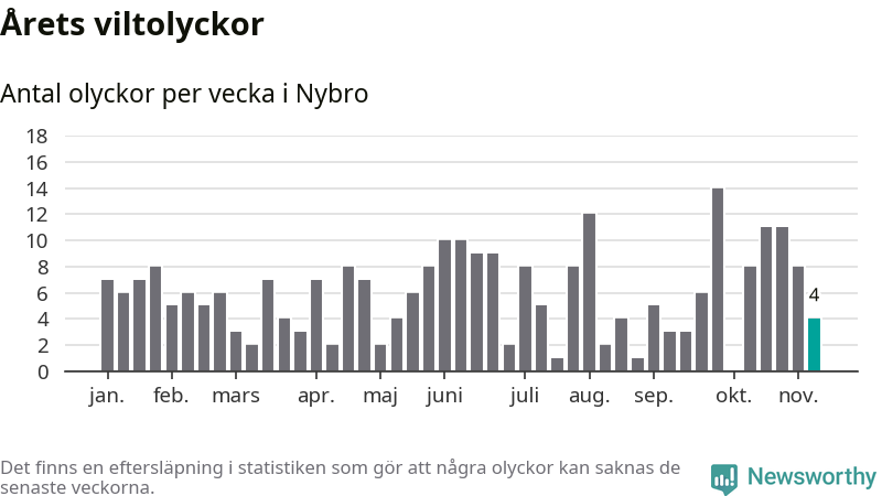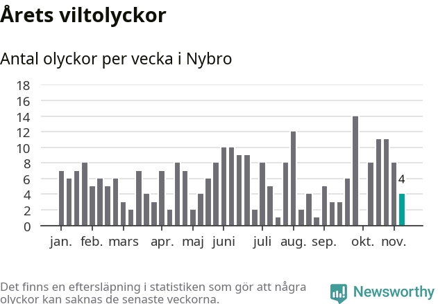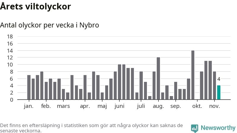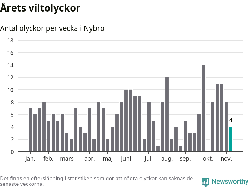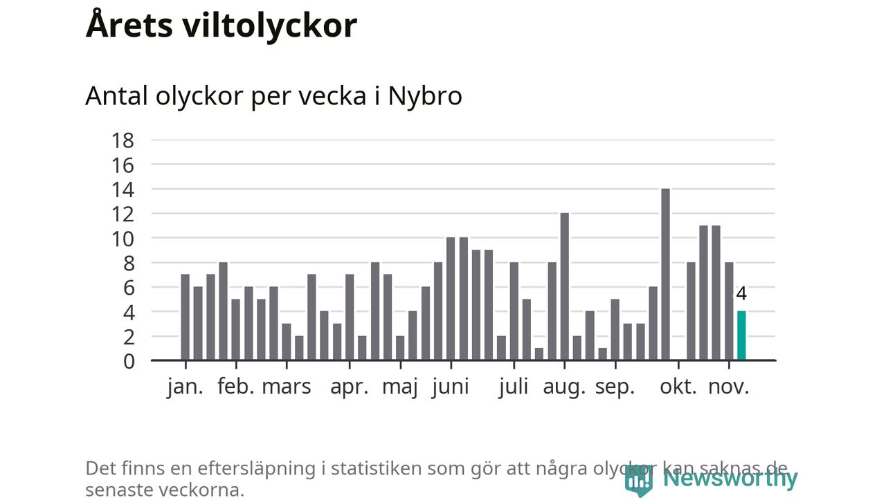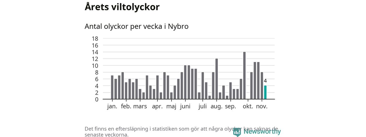 Hittills har fyra viltolyckor rapporterats in i Nybro kommun från vecka 46. Se listan här.