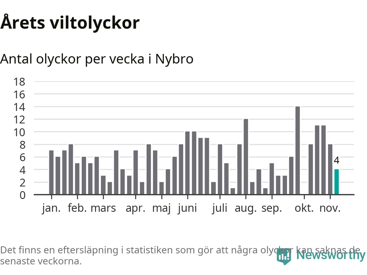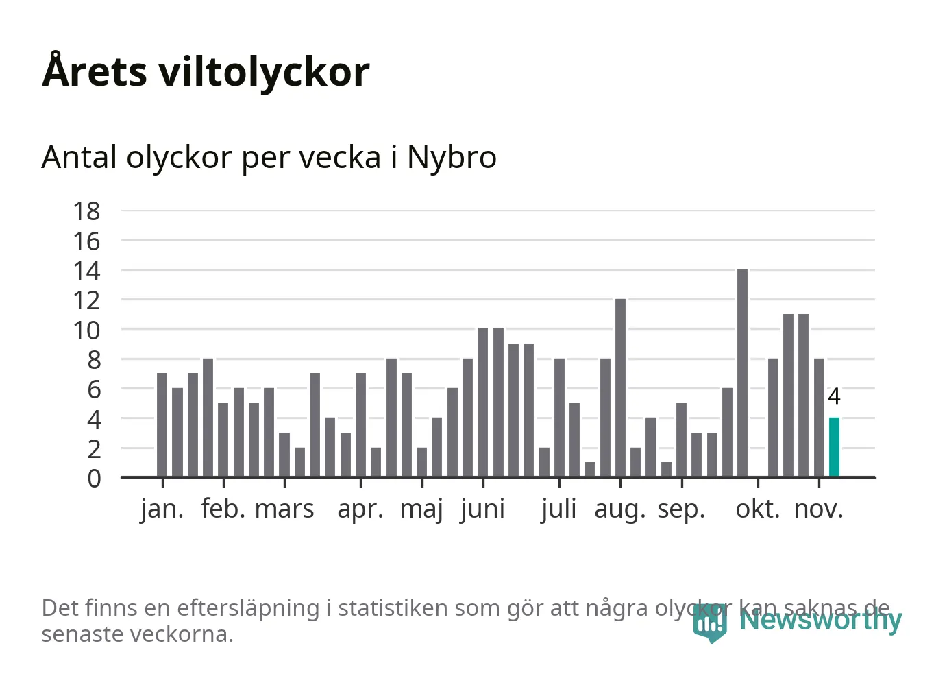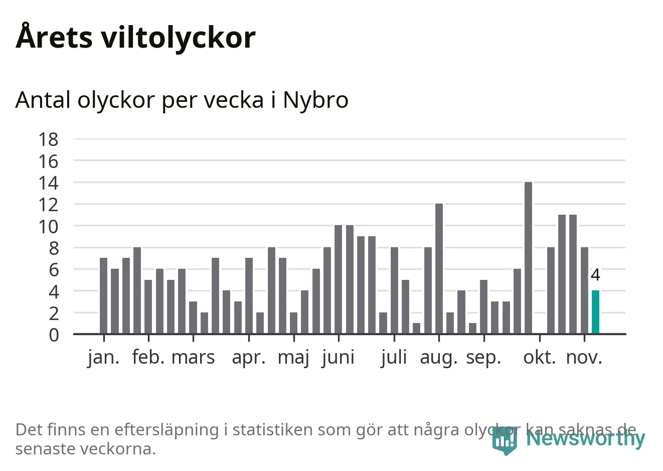 Hittills har fyra viltolyckor rapporterats in i Nybro kommun från vecka 46. Se listan här.