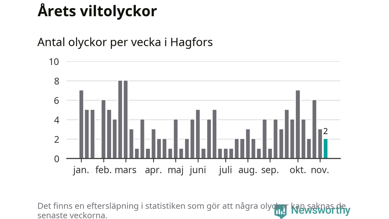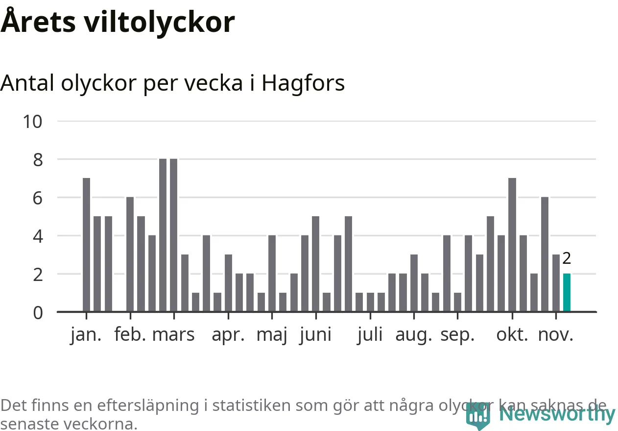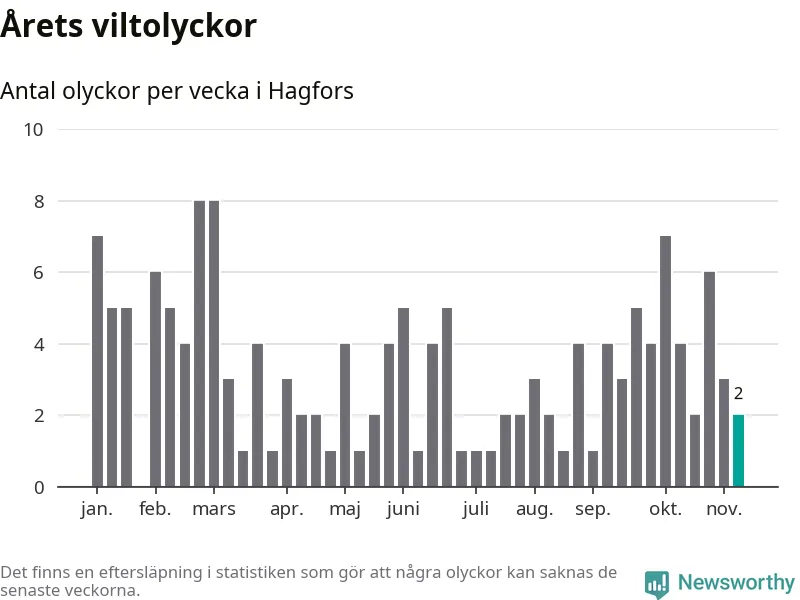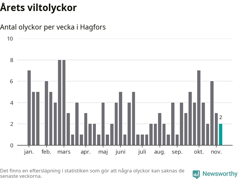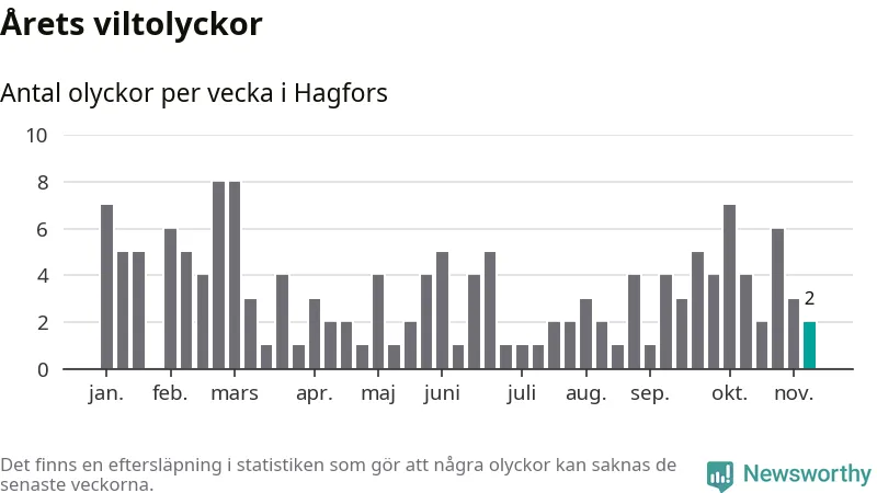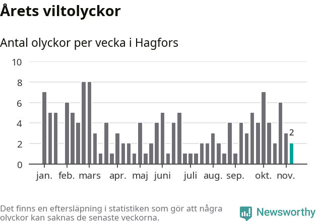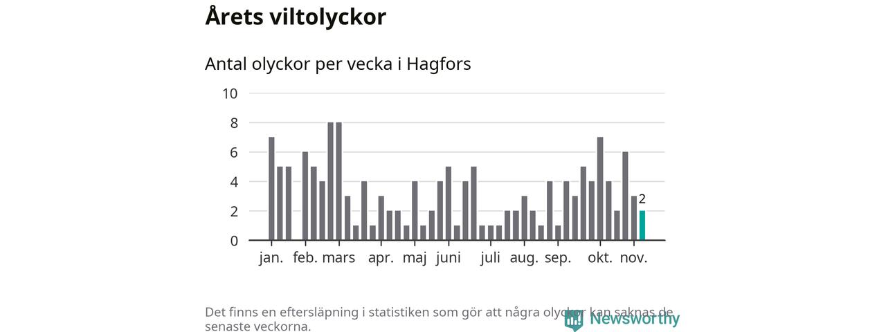 Hittills har två viltolyckor rapporterats in i Hagfors kommun från vecka 46. Se listan här.