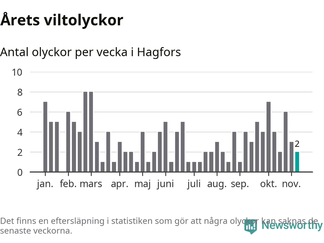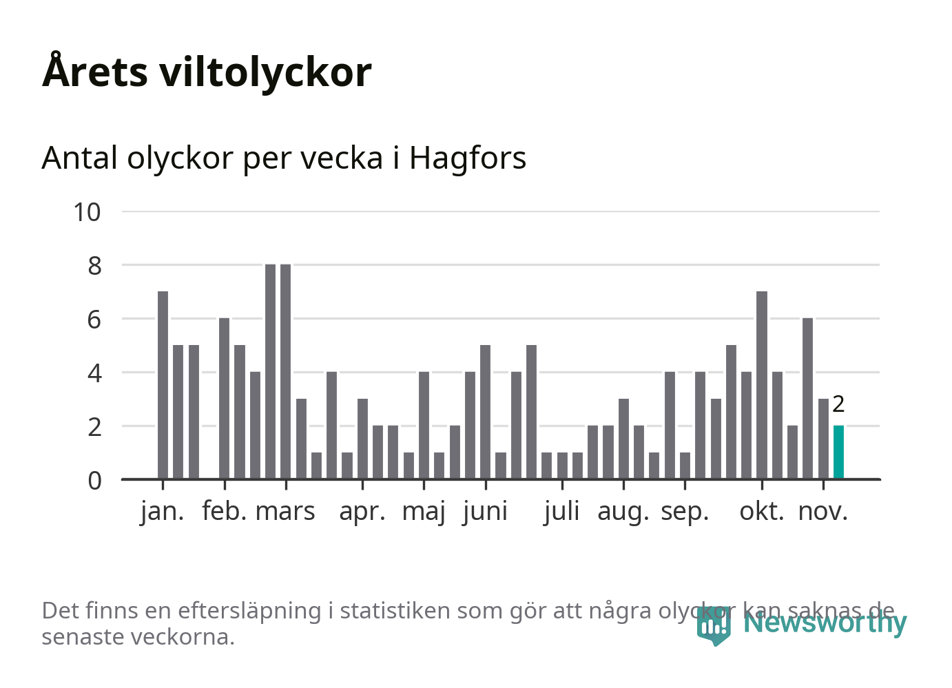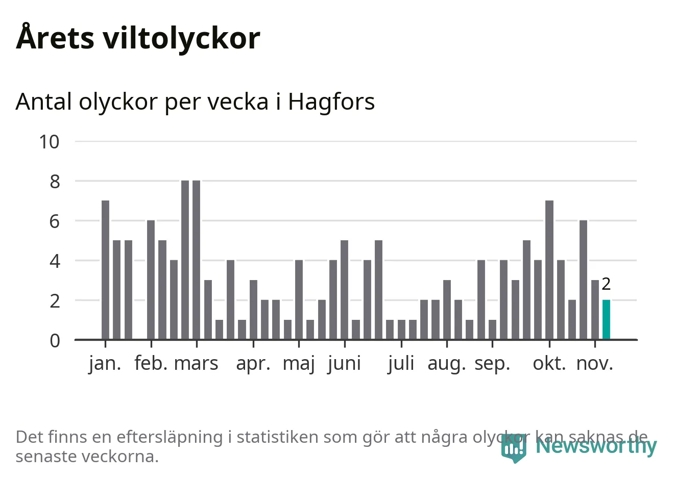 Hittills har två viltolyckor rapporterats in i Hagfors kommun från vecka 46. Se listan här.