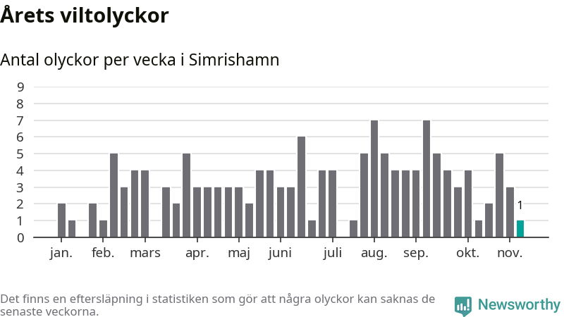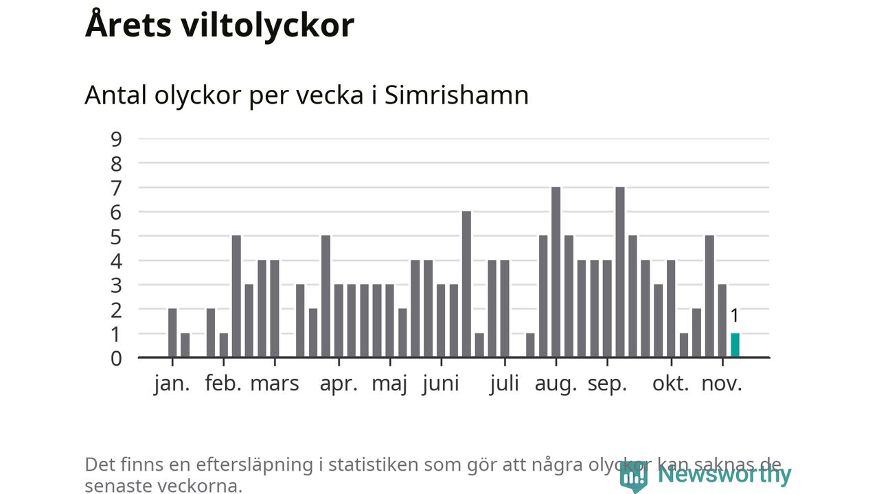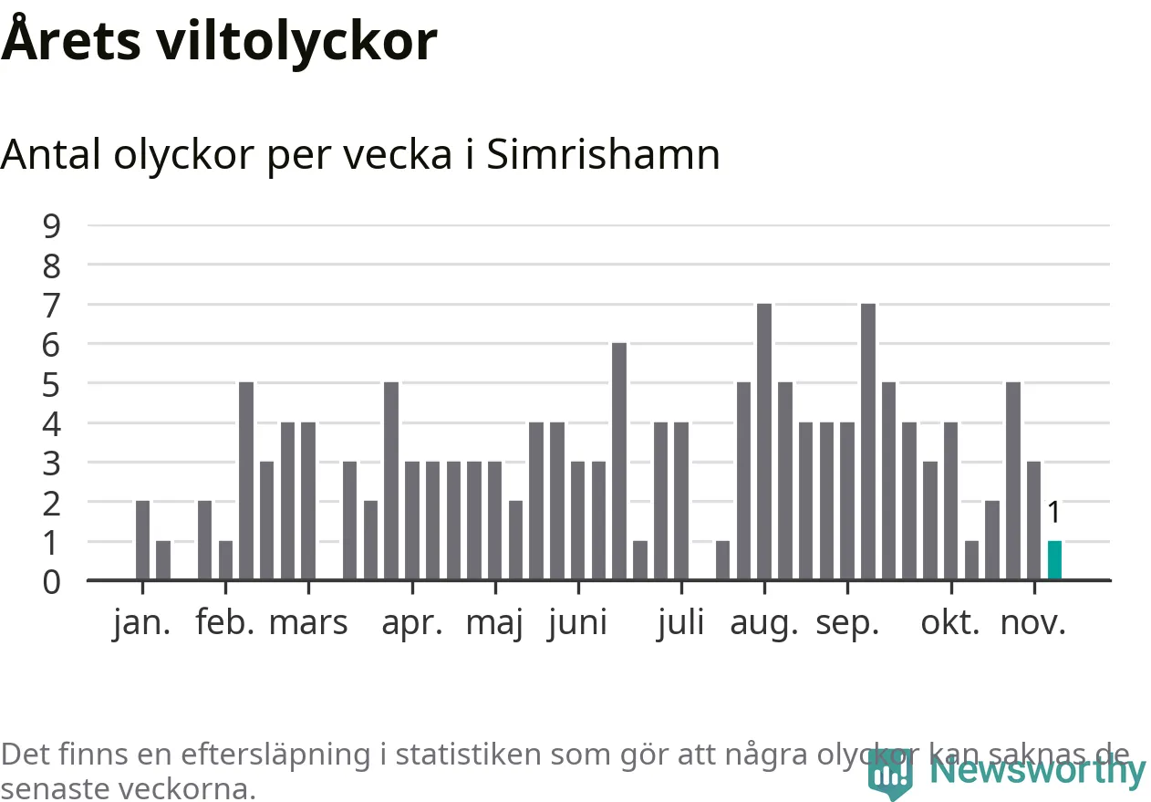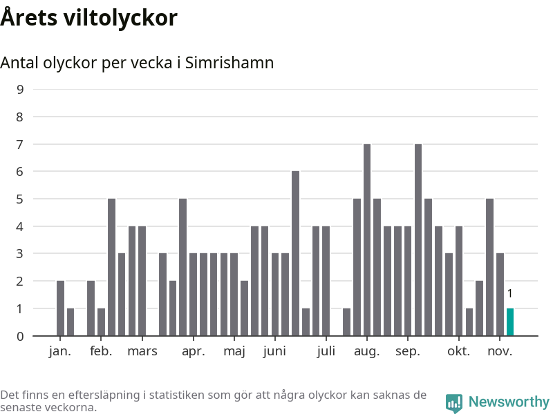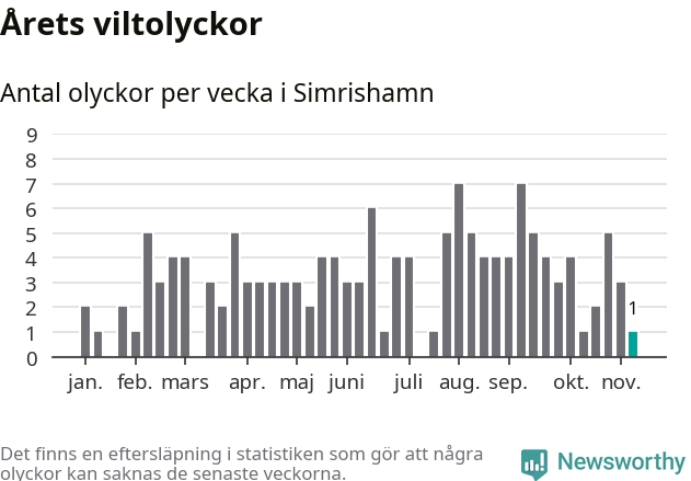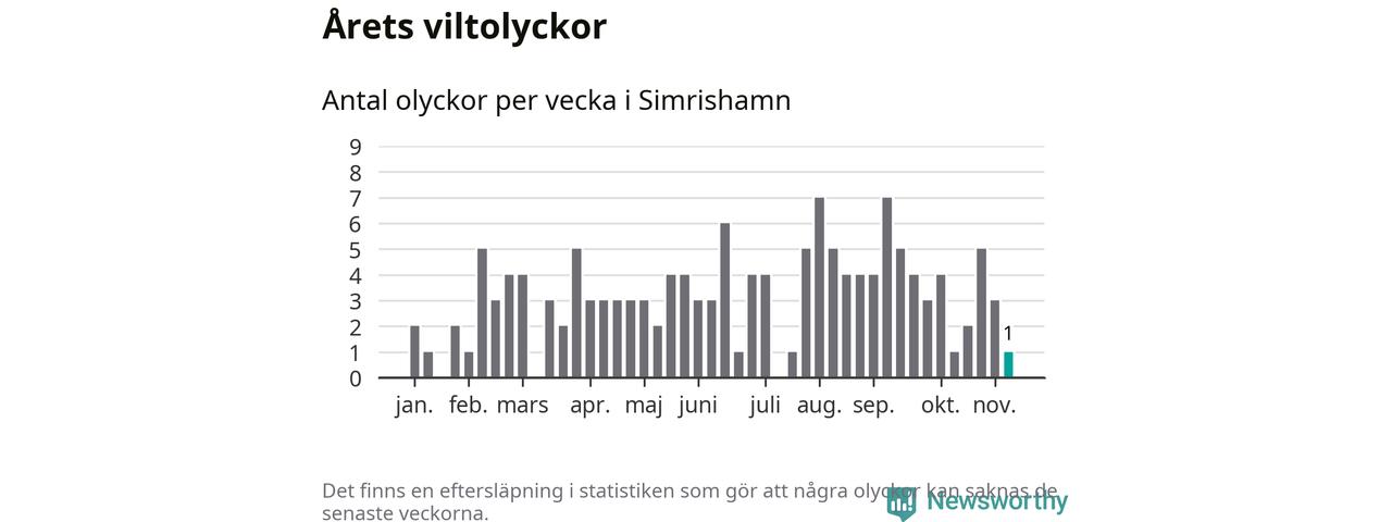 Från förra veckan (vecka 46) har hittills en viltolycka rapporterats in i Simrishamns kommun.